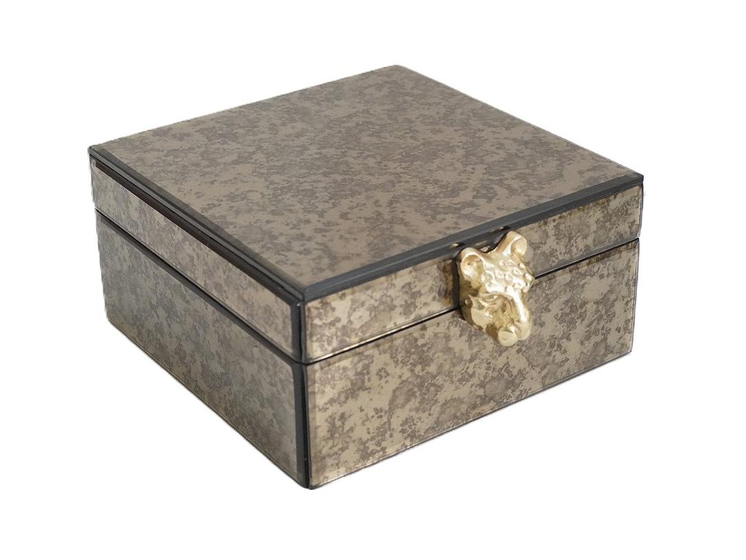 Изысканная шкатулка Fenomena в стиле ар-деко — сочетание стекла с золотистым узором и объемной металлической ручкой в виде головы леопарда. Материал корпуса — стекло, внутренняя отделка — мягкий велюр. Идеальна для хранения ювелирных украшений и других ценных мелочей. Станет ярким акцентом в интерьере и желанным подарком для ценителей акцентного дизайна.
