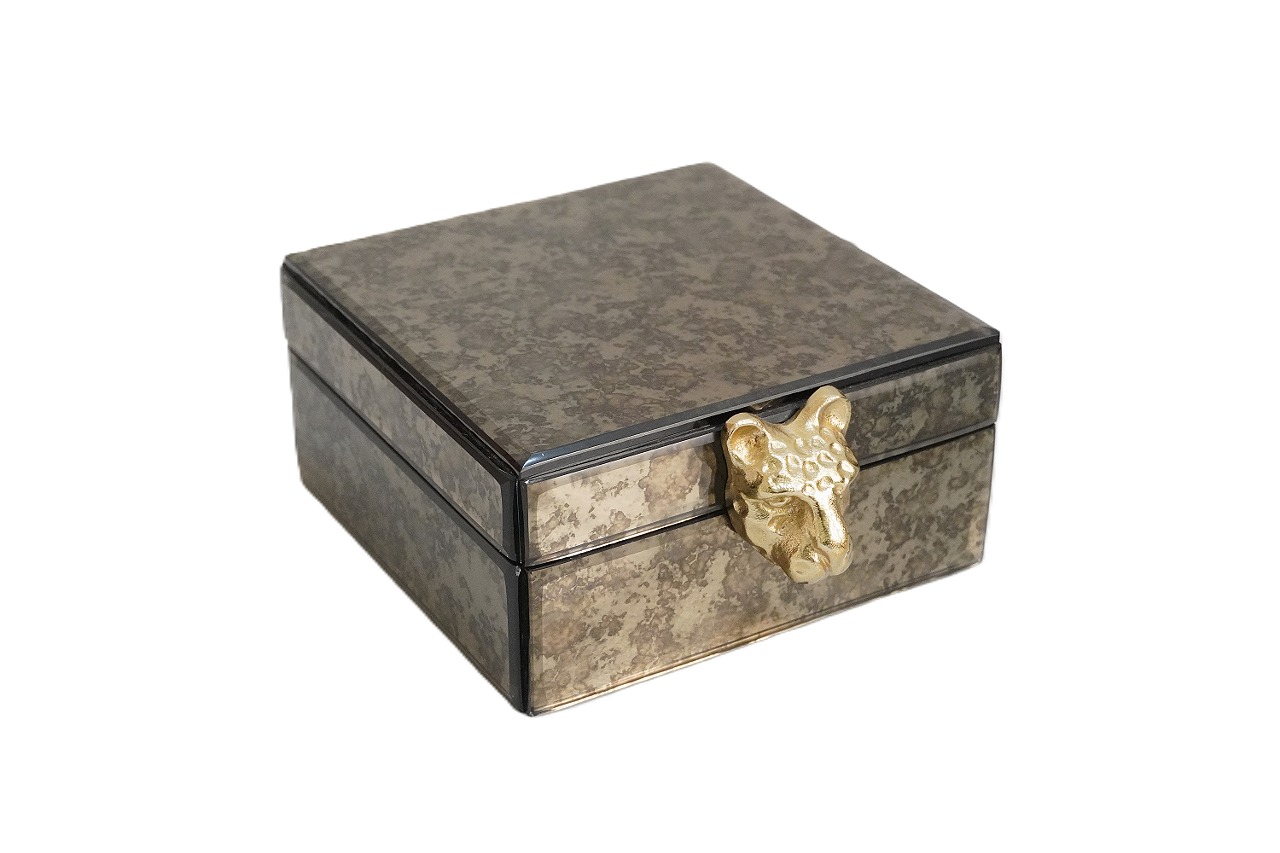 Изысканная шкатулка Fenomena в стиле ар-деко — сочетание стекла с золотистым узором и объемной металлической ручкой в виде головы леопарда. Материал корпуса — стекло, внутренняя отделка — мягкий велюр. Идеальна для хранения ювелирных украшений и других ценных мелочей. Станет ярким акцентом в интерьере и желанным подарком для ценителей акцентного дизайна.