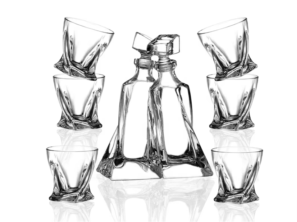 Этот элегантный набор, выполненный из высококачественного, прозрачного стекла, — идеальное сочетание безупречной функциональности и художественной выразительности. Все предметы в наборе Cael выполнены в едином стиле, уникальная «кристаллическая» или «ледяная» структура стекла создает единый завершенный образ. Изгибы на декантерах и стаканах создают невероятную игру света и тени, делая набор украшением для любого интерьера и статусным подарком для ценителей изысканности и красоты.