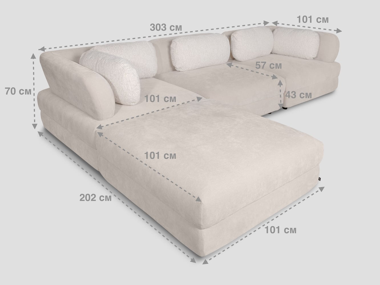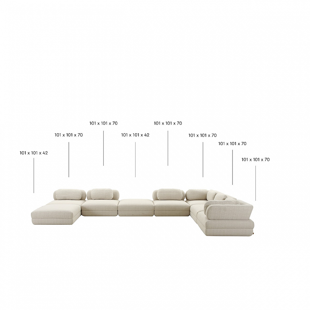 В комплекте 4 универсальных модуля размером 101х101 см каждый. Светлый модульный диван в обивке из шенилла легко персонализируется: открытые модули могут служить пуфами, а регулируемые подушки-спинки, выполненные в фактурном букле цвета светло-бежевый меланж, позволяют настроить комфорт под себя. Конфигурация легко адаптируется под любое пространство — от прямой линии до углового дивана с левым или правым углом.