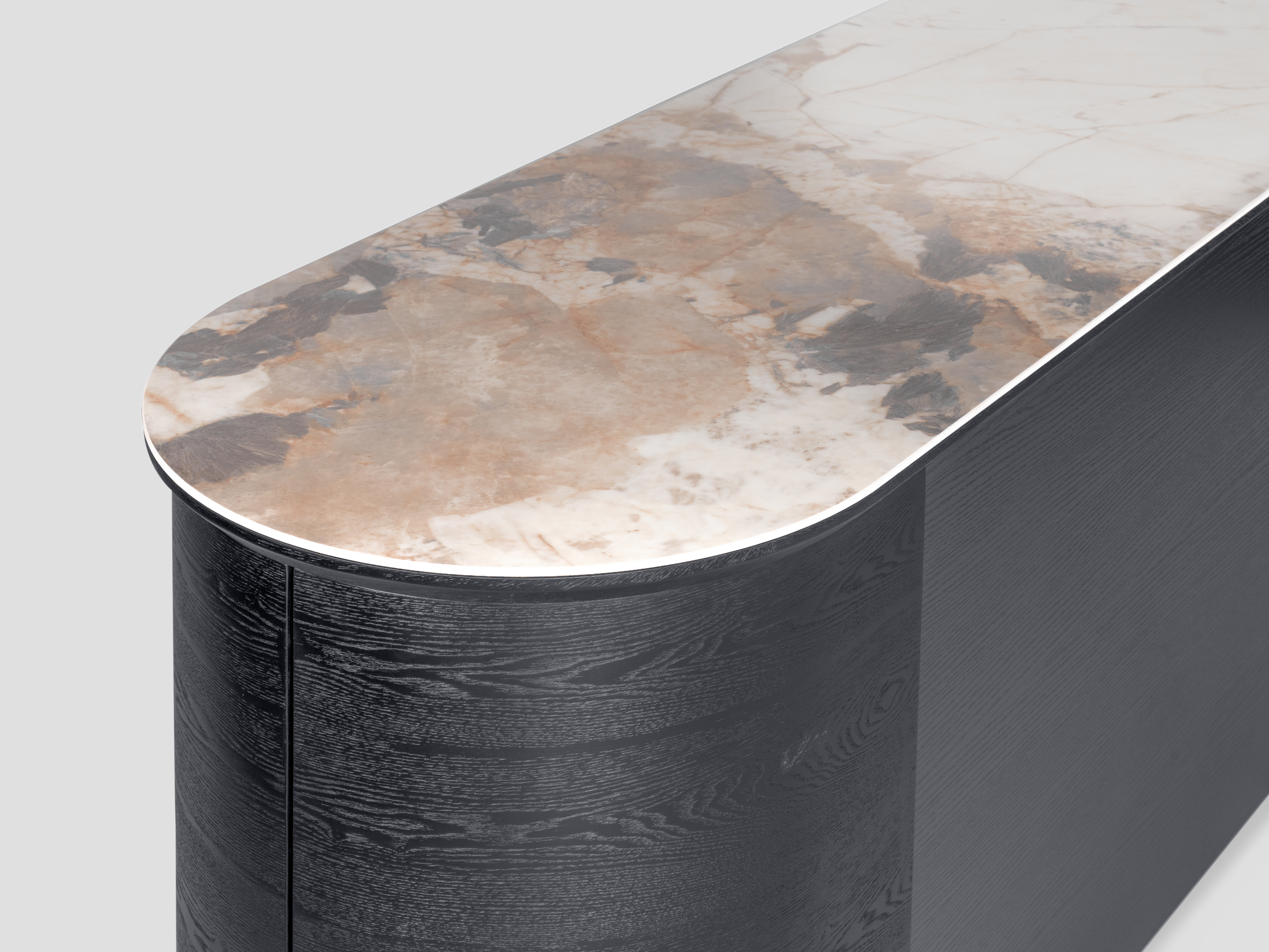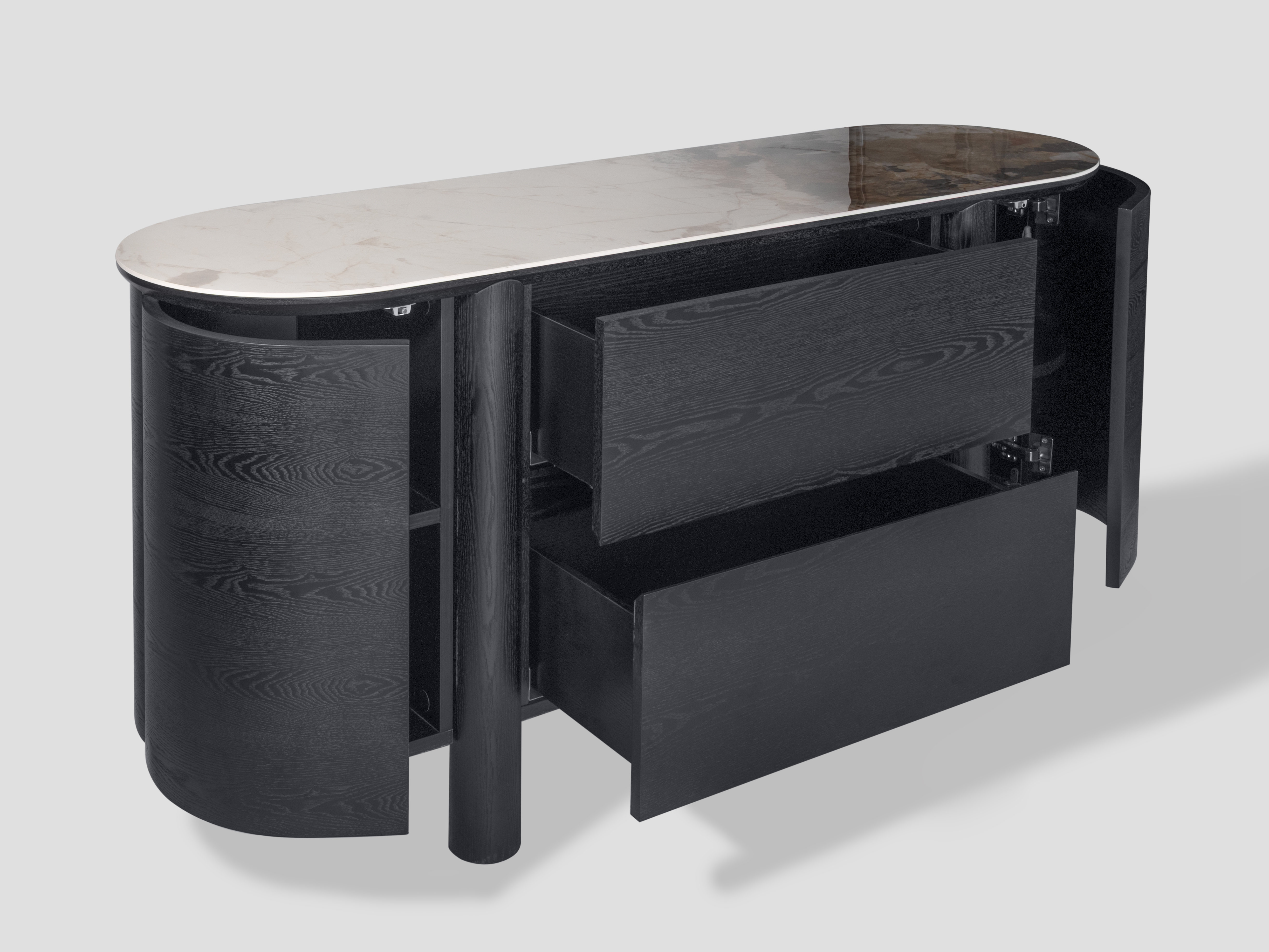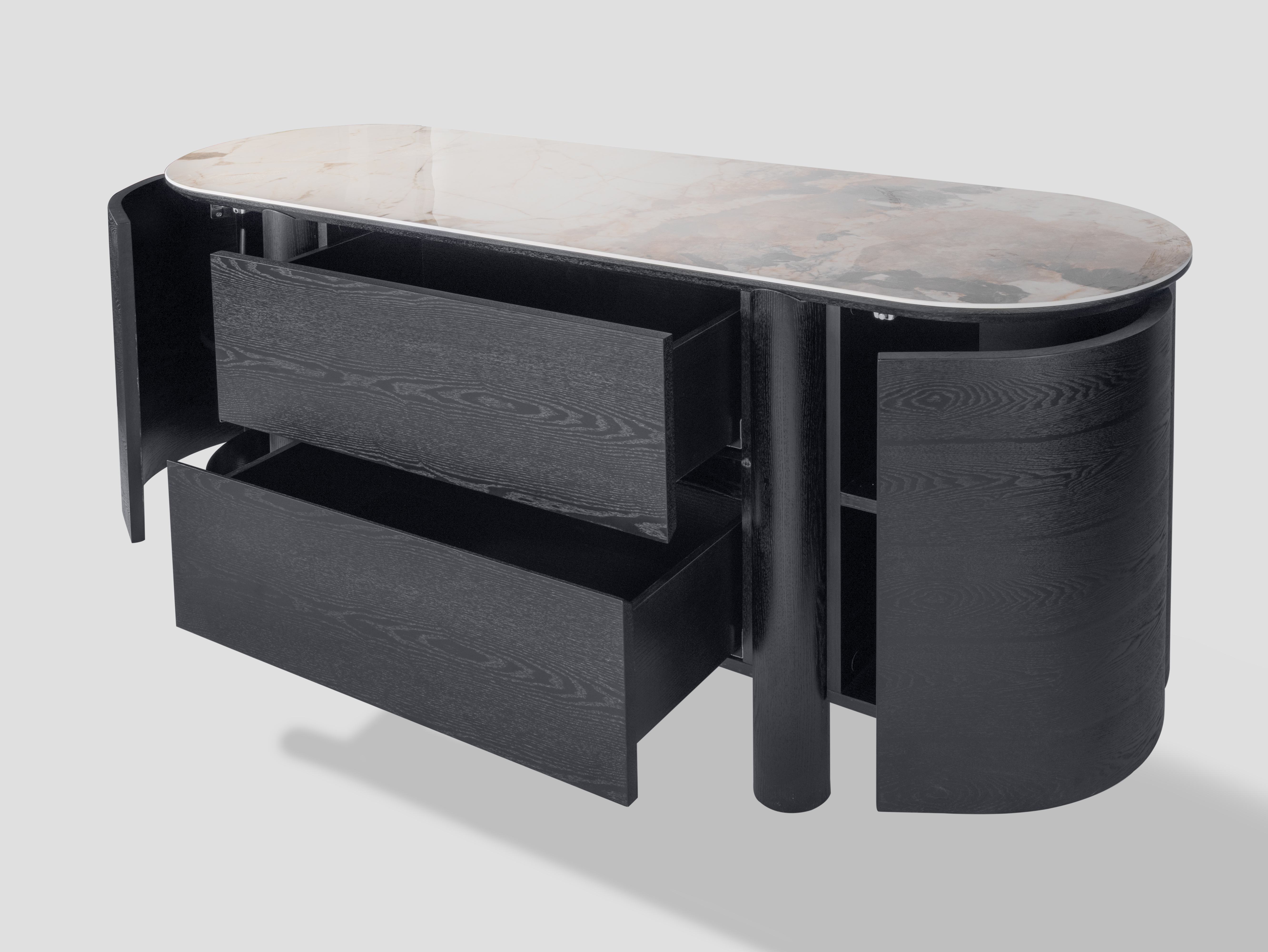 Массивный силуэт комода Bromo станет стильным элементом интерьера, поддерживая его классический стиль. Темный шпон придает ему сдержанную элегантность, создавая эффектный контраст с керамической столешницей.