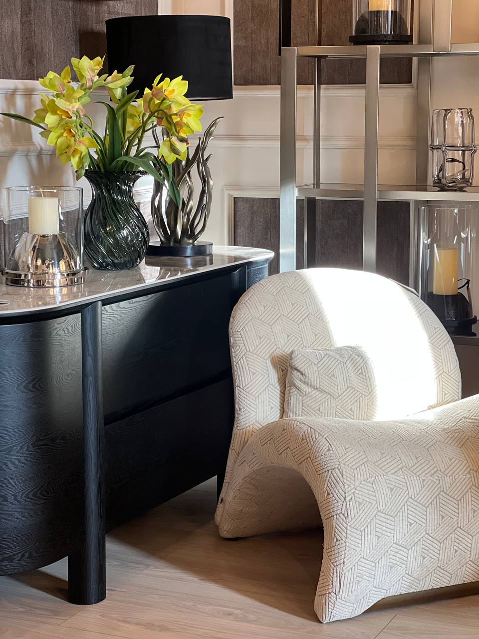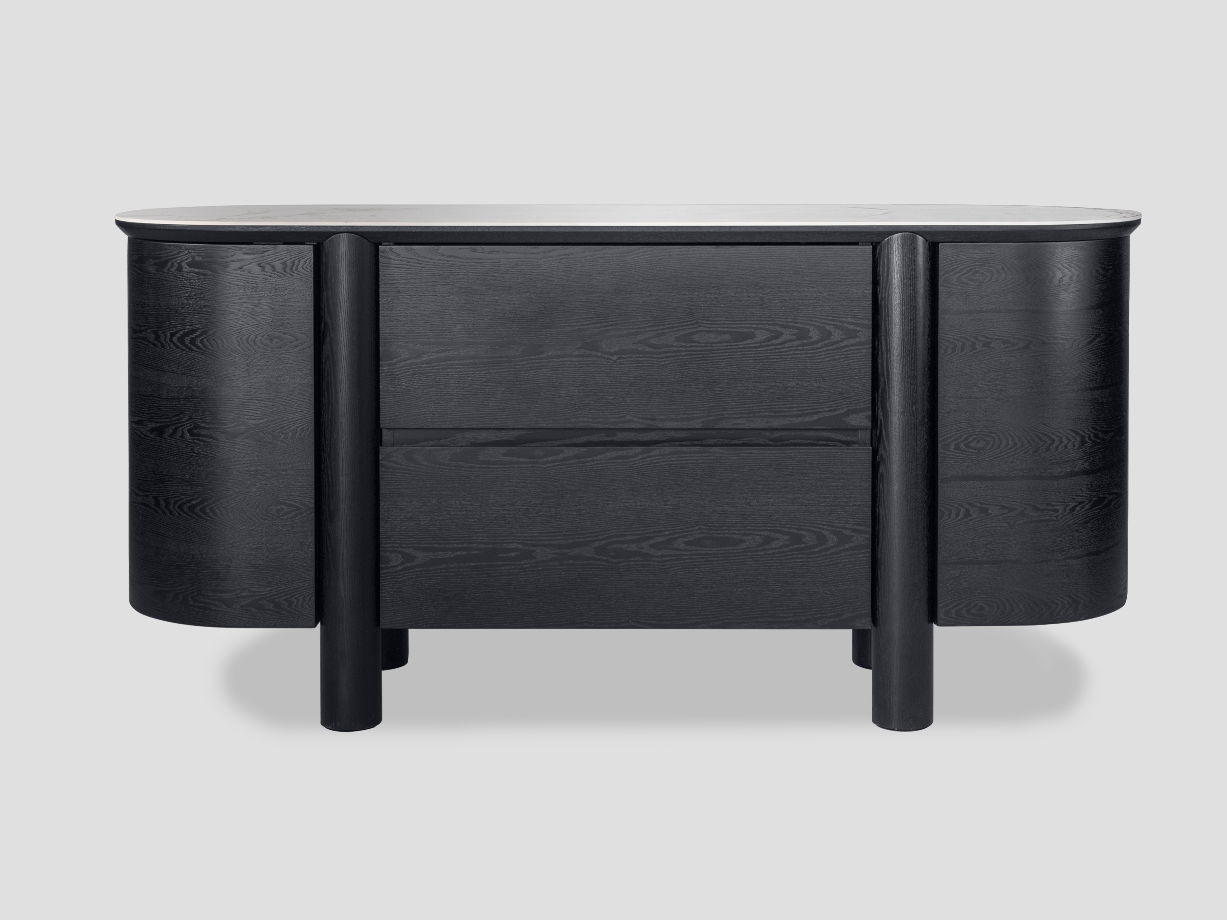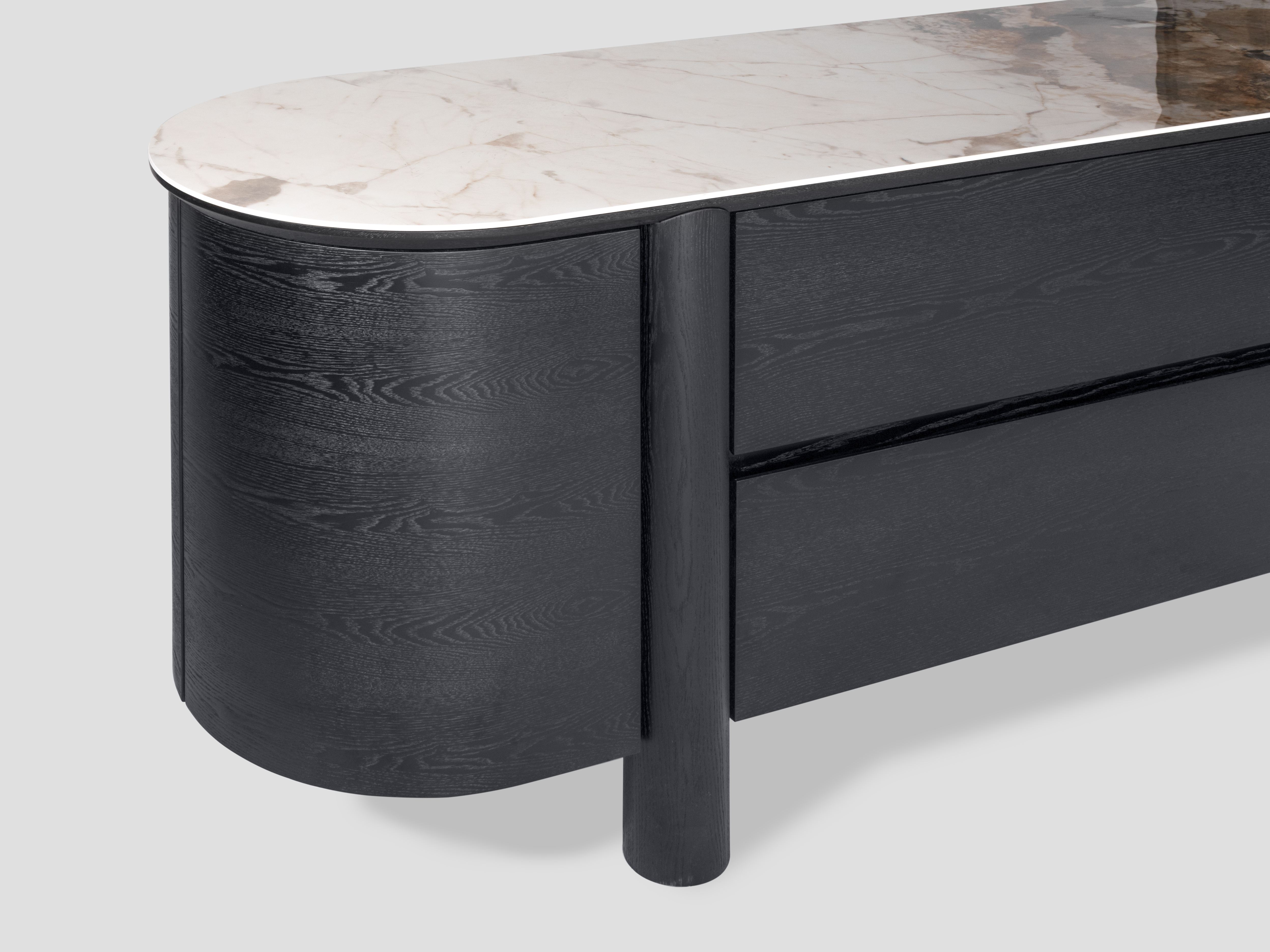 Массивный силуэт комода Bromo станет стильным элементом интерьера, поддерживая его классический стиль. Темный шпон придает ему сдержанную элегантность, создавая эффектный контраст с керамической столешницей.