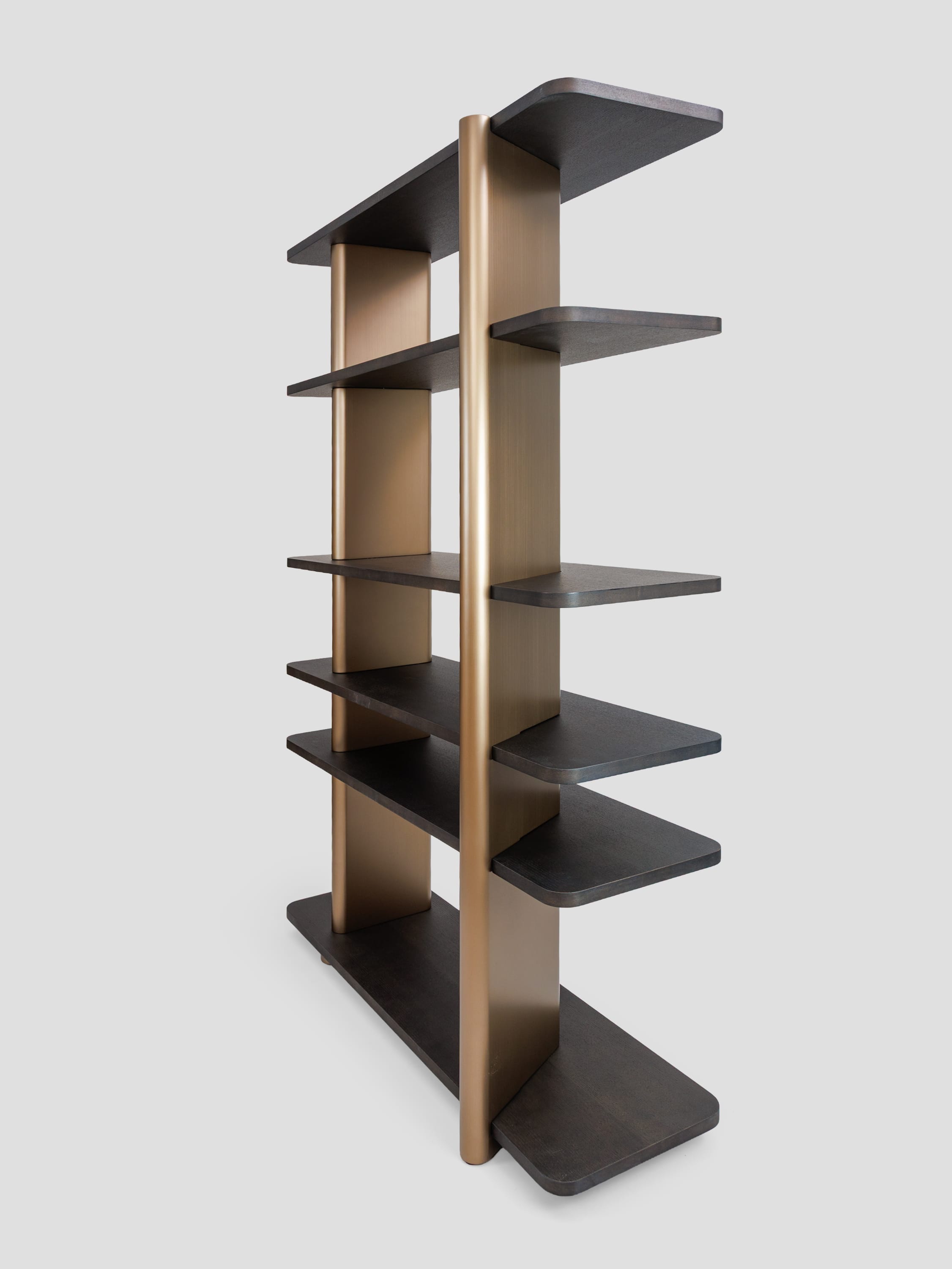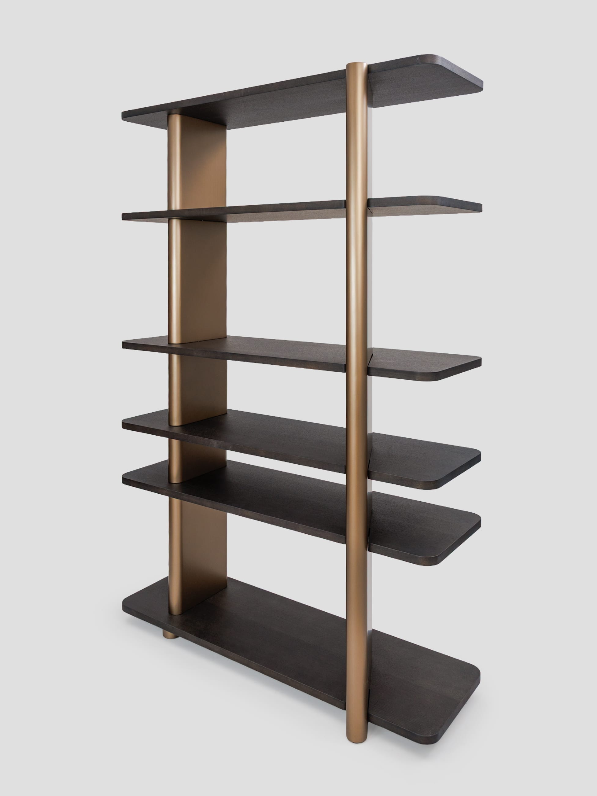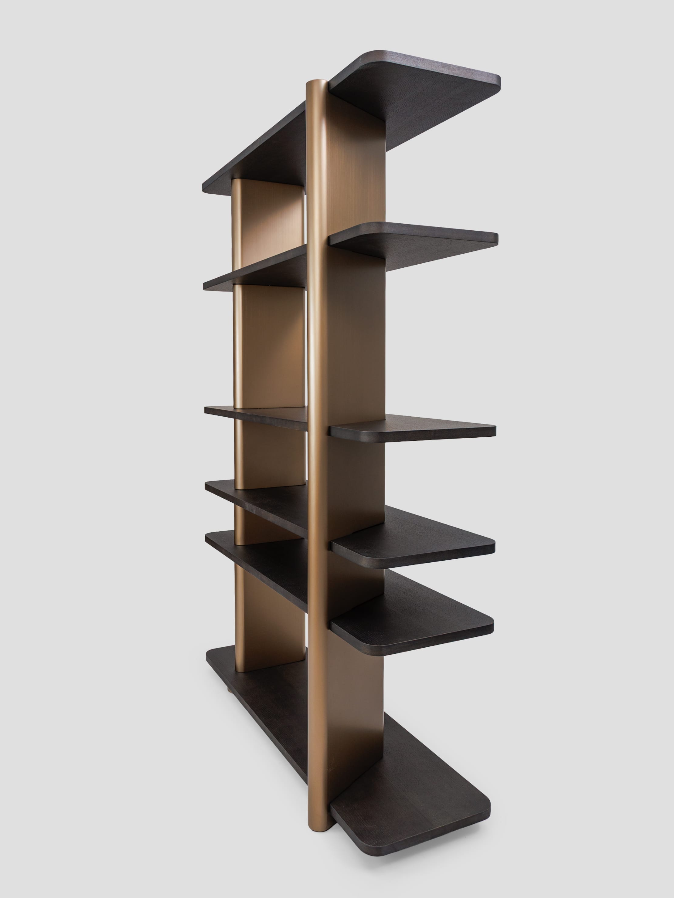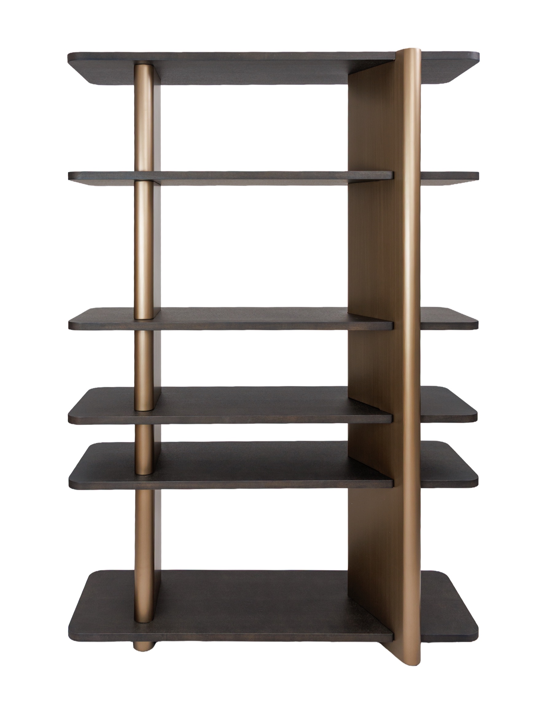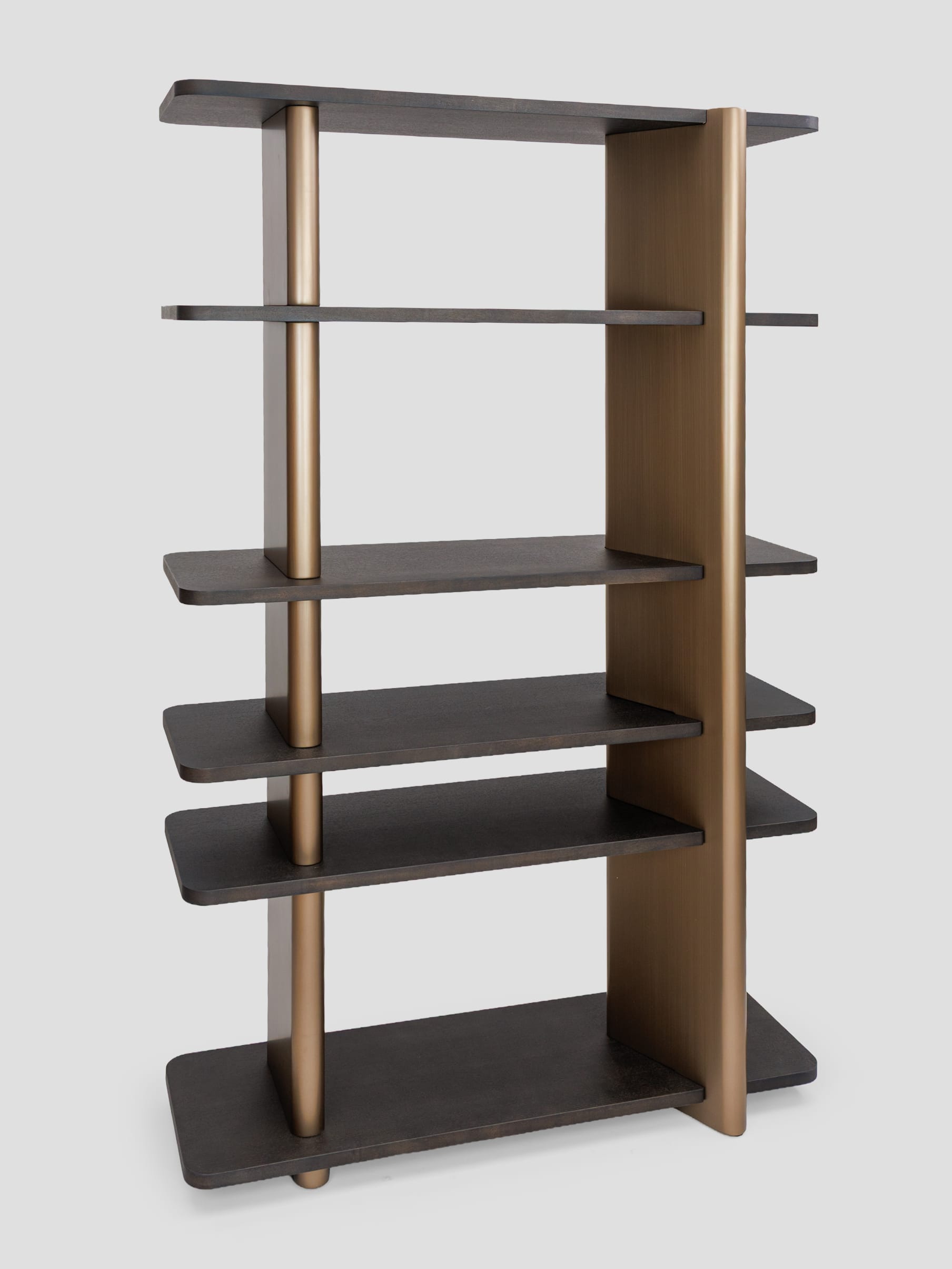 Правосторонний стеллаж коллекции Madison — это современный и функциональный элемент интерьера, выполненный из темного шпона дуба. Его минималистичный дизайн включает пять открытых полок, которые обеспечивают удобное хранение книг, декоративных предметов или других вещей. Вертикальные планки выполненные из высококачественного МДФ в финише латунь добавляют стеллажу элегантность и структурную прочность, создавая контраст с деревянными элементами. Стеллаж прекрасно впишется в интерьер гостиной, кабинета или спальни, сочетая практичность с изысканным внешним видом.