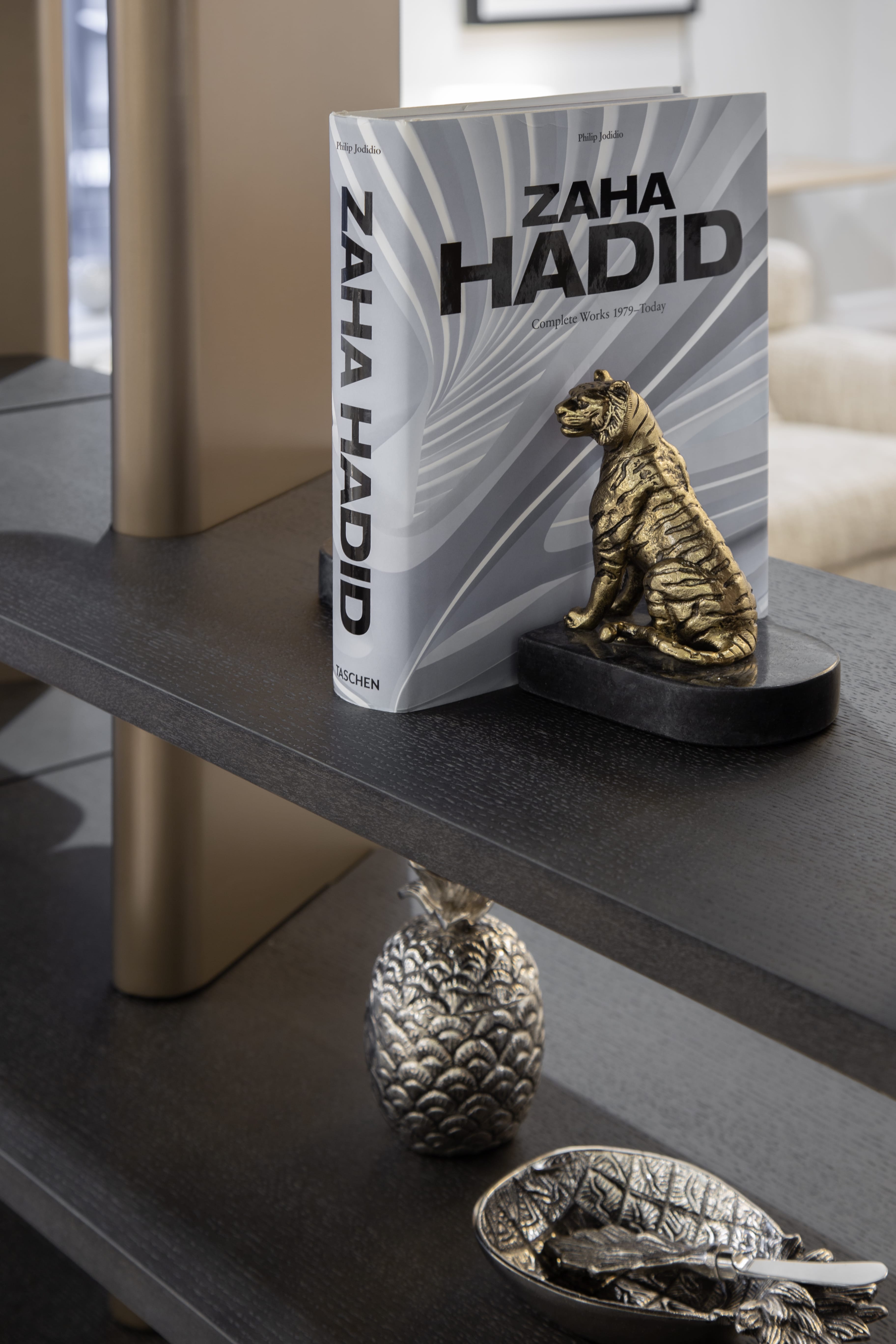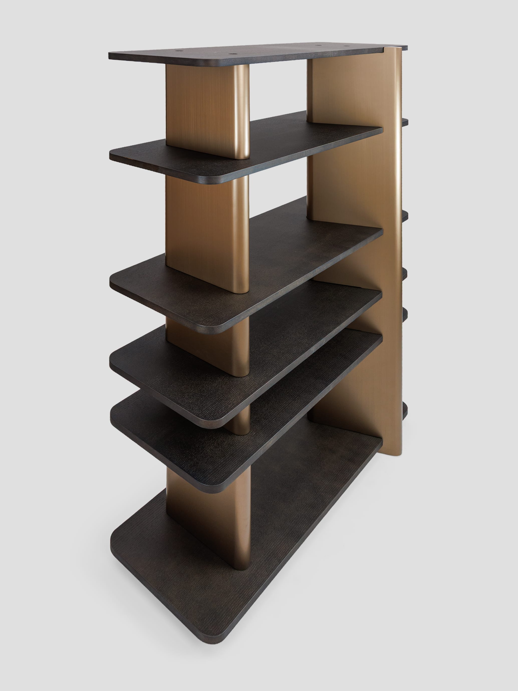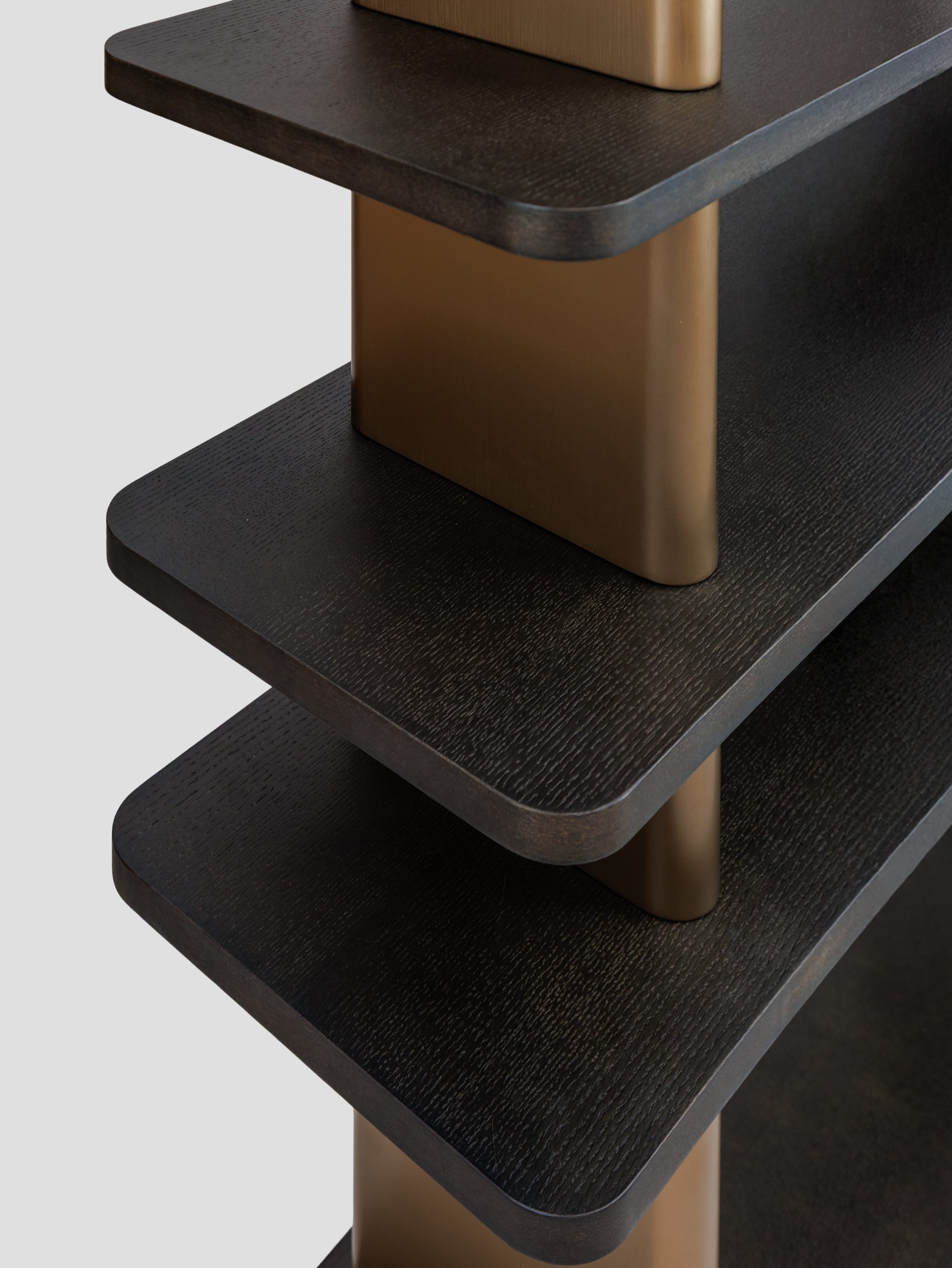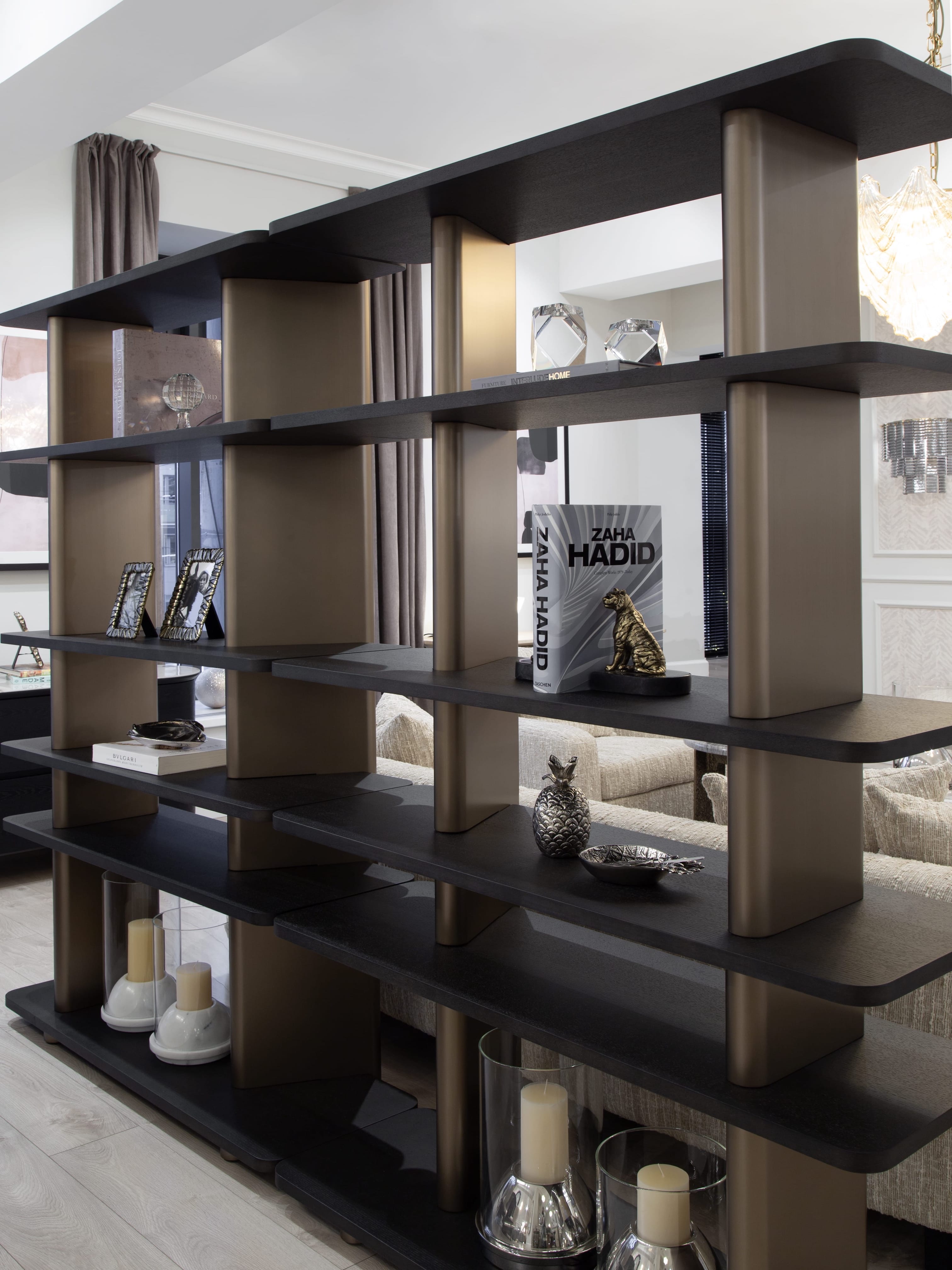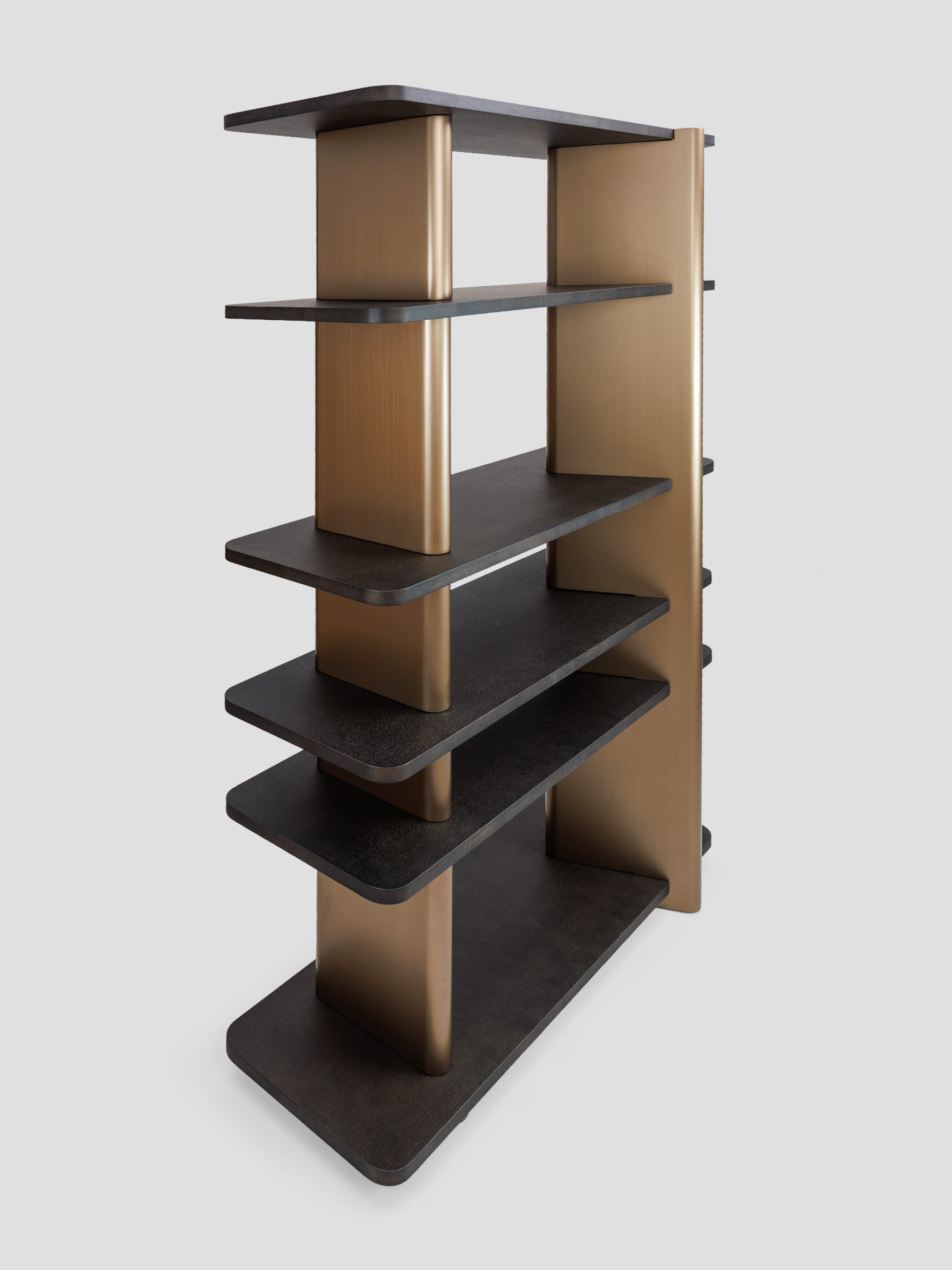 Правосторонний стеллаж коллекции Madison — это современный и функциональный элемент интерьера, выполненный из темного шпона дуба. Его минималистичный дизайн включает пять открытых полок, которые обеспечивают удобное хранение книг, декоративных предметов или других вещей. Вертикальные планки выполненные из высококачественного МДФ в финише латунь добавляют стеллажу элегантность и структурную прочность, создавая контраст с деревянными элементами. Стеллаж прекрасно впишется в интерьер гостиной, кабинета или спальни, сочетая практичность с изысканным внешним видом.