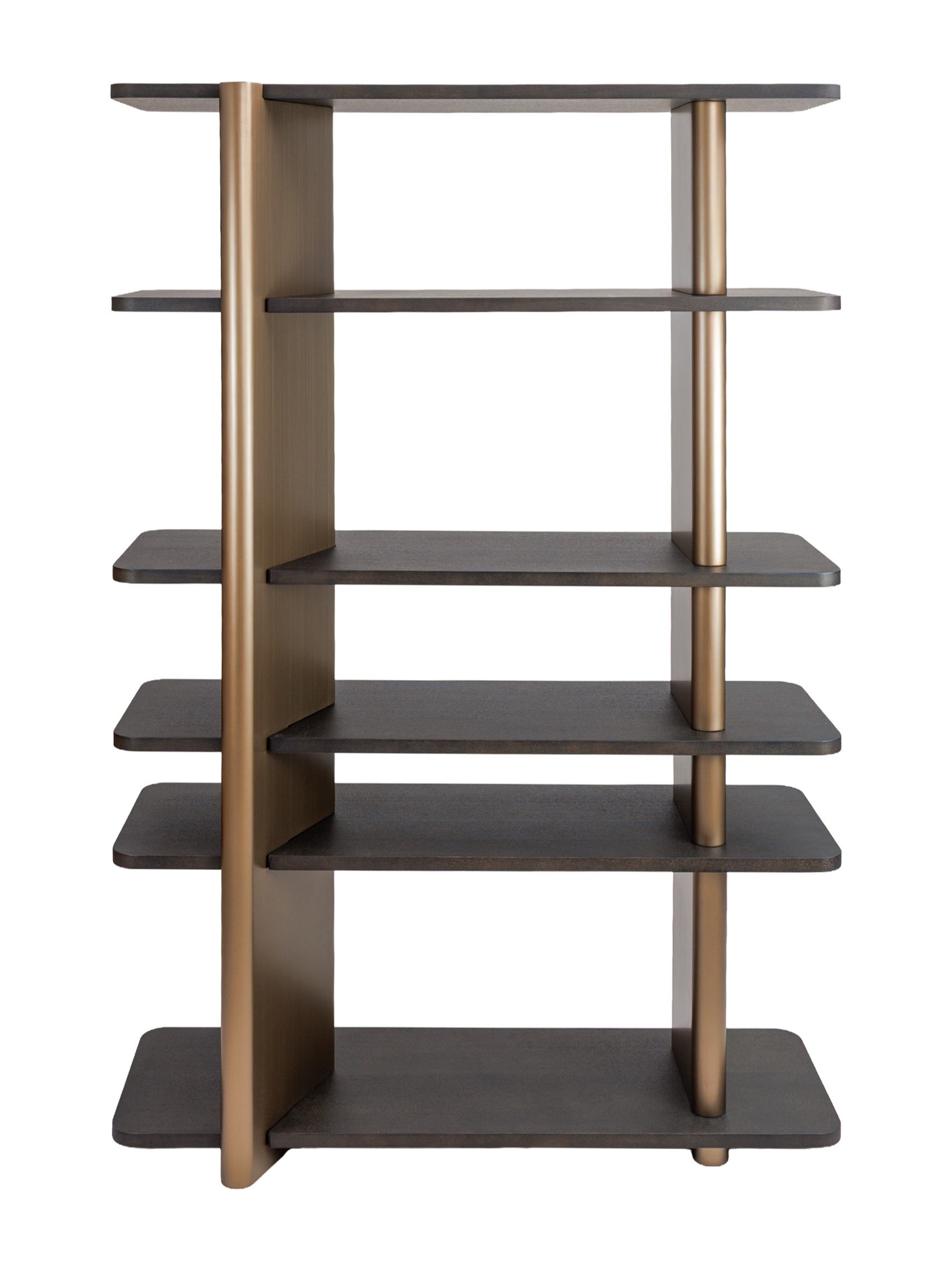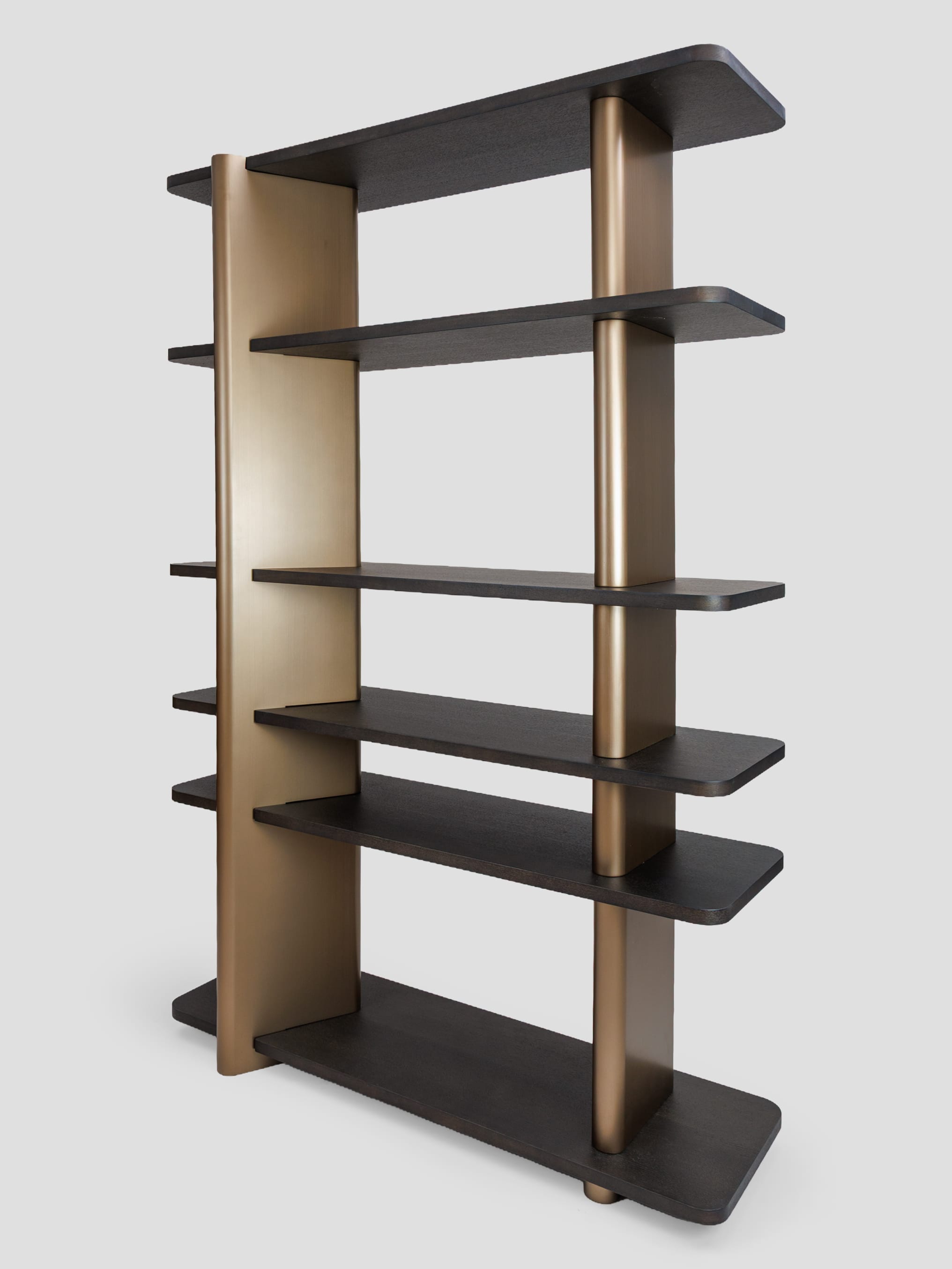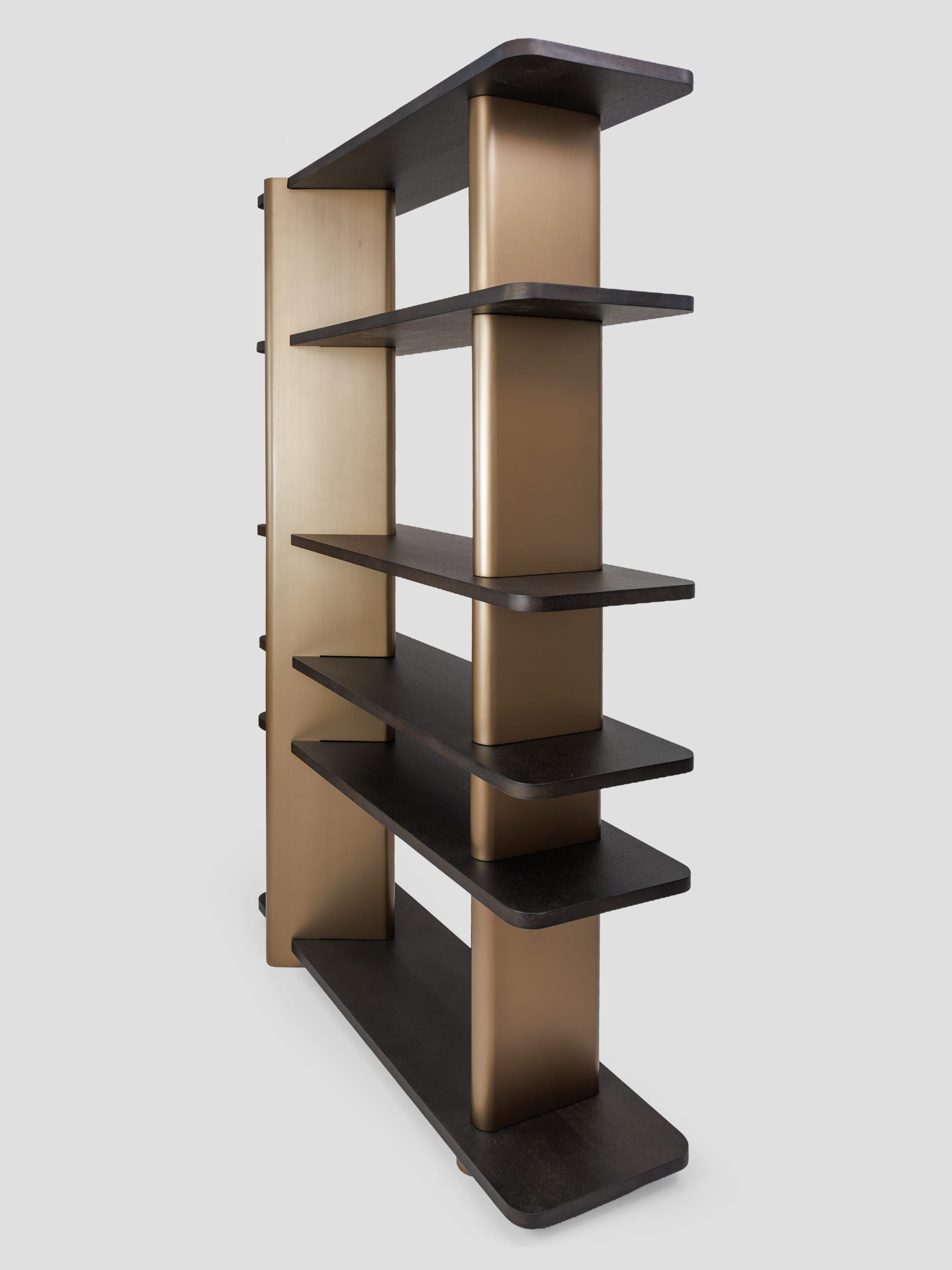 Левосторонний стеллаж коллекции Madison — это современный и функциональный элемент интерьера, выполненный из темного шпона дуба. Его минималистичный дизайн включает пять открытых полок, которые обеспечивают удобное хранение книг, декоративных предметов или других вещей. Вертикальные планки выполненные из высококачественного МДФ в финише латунь добавляют стеллажу элегантность и структурную прочность, создавая контраст с деревянными элементами. Стеллаж прекрасно впишется в интерьер гостиной, кабинета или спальни, сочетая практичность с изысканным внешним видом.