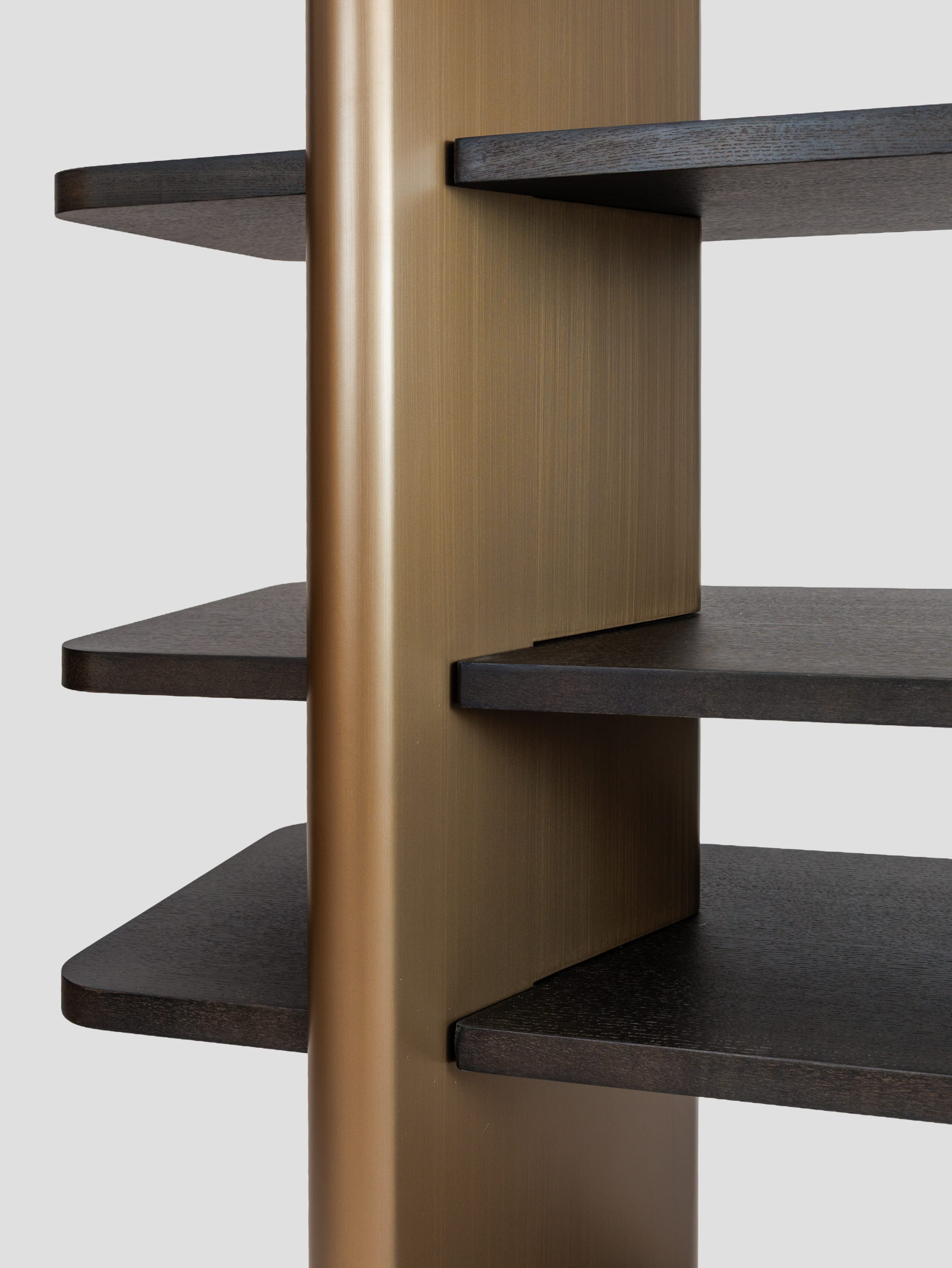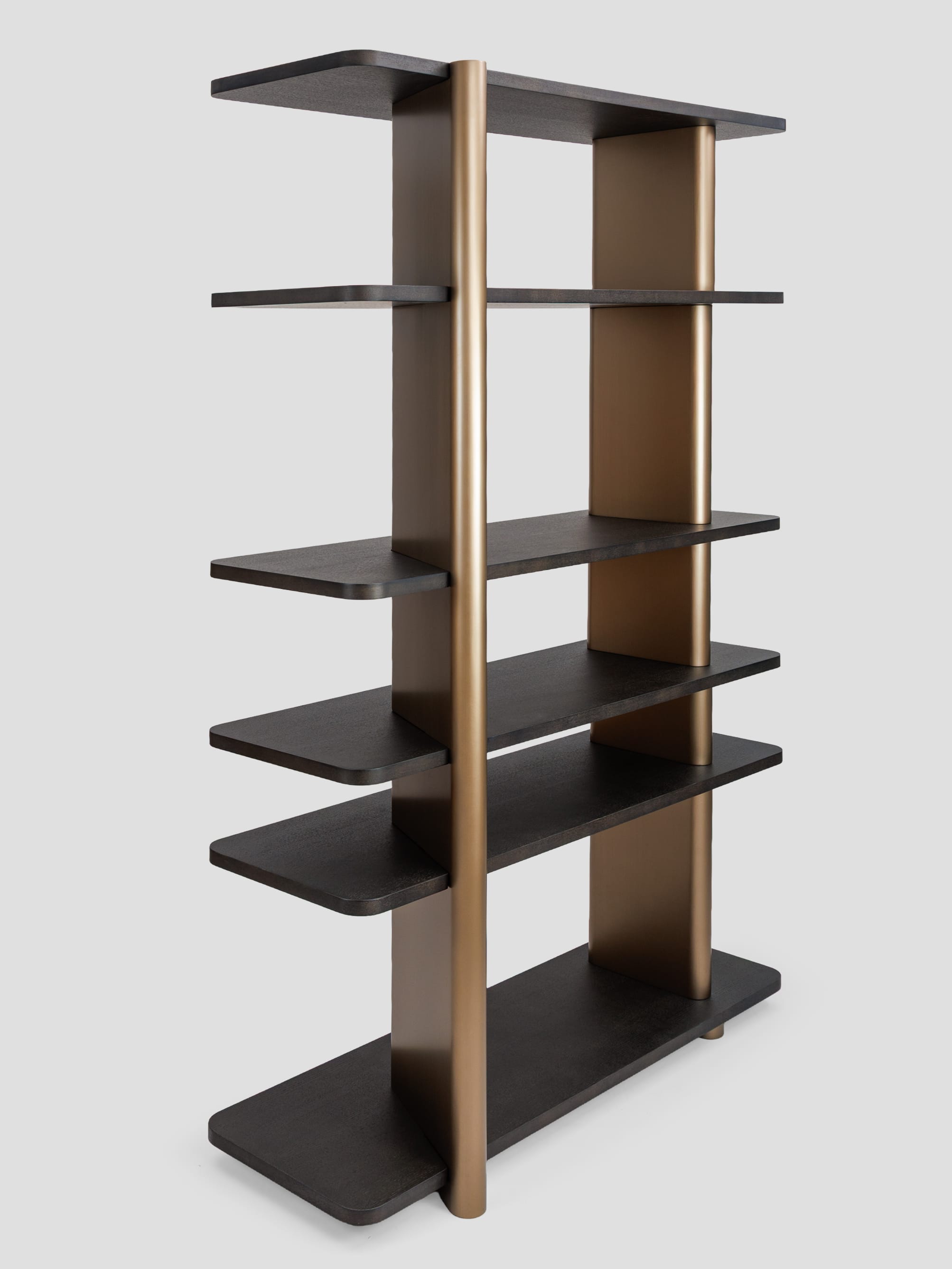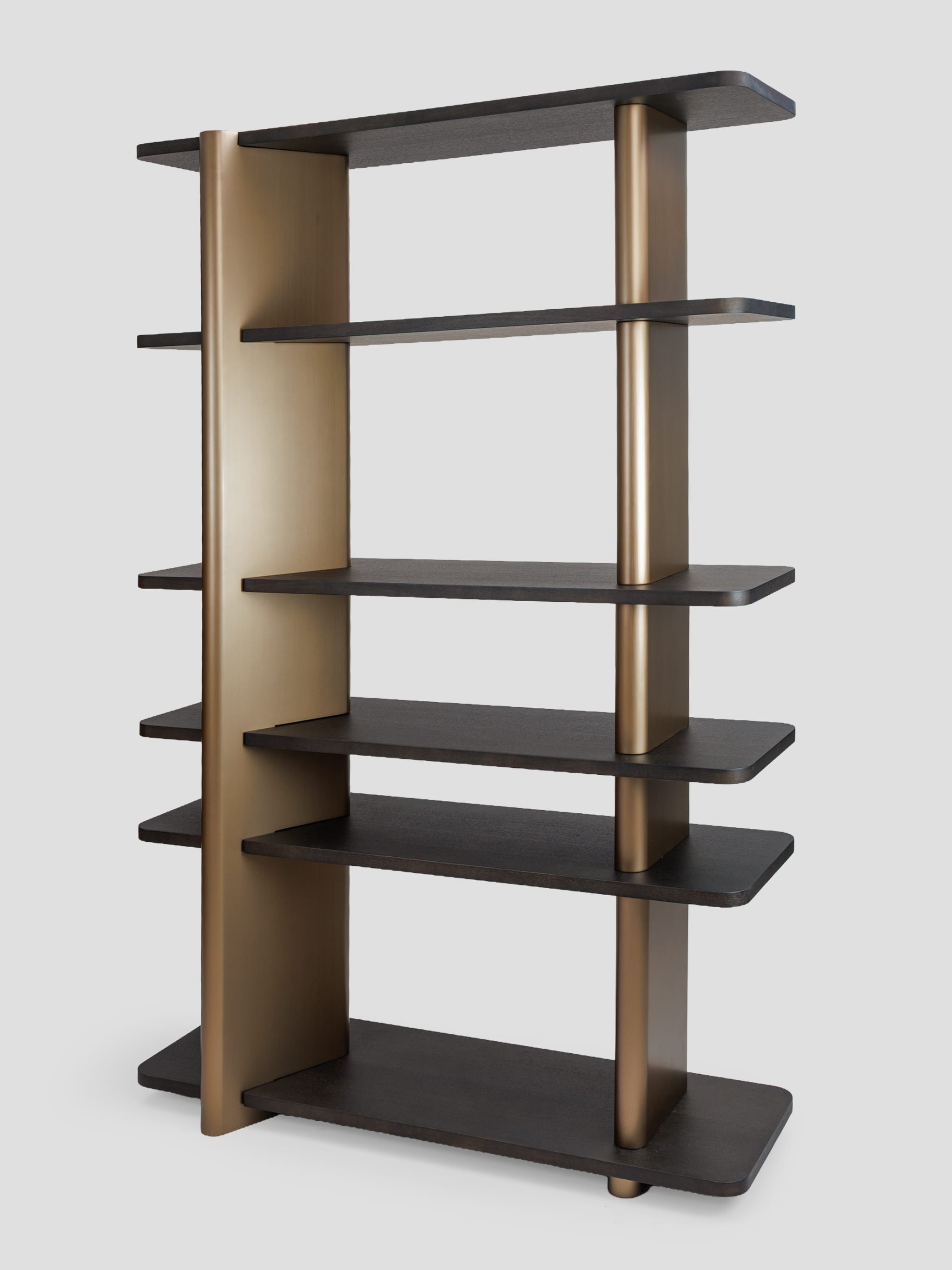 Левосторонний стеллаж коллекции Madison — это современный и функциональный элемент интерьера, выполненный из темного шпона дуба. Его минималистичный дизайн включает пять открытых полок, которые обеспечивают удобное хранение книг, декоративных предметов или других вещей. Вертикальные планки выполненные из высококачественного МДФ в финише латунь добавляют стеллажу элегантность и структурную прочность, создавая контраст с деревянными элементами. Стеллаж прекрасно впишется в интерьер гостиной, кабинета или спальни, сочетая практичность с изысканным внешним видом.