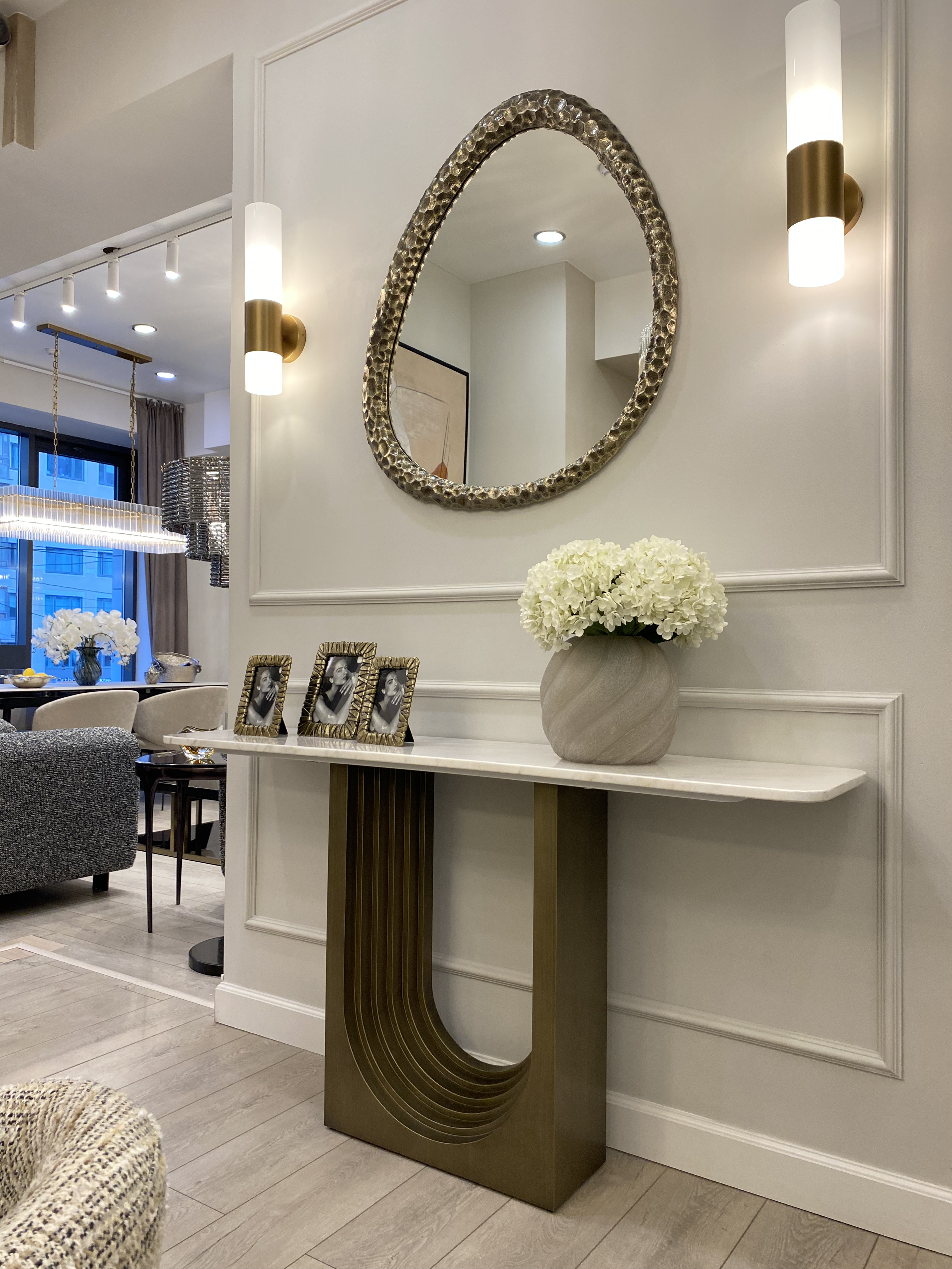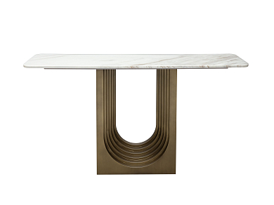 Консоль Akron с основанием из металла, выполненным в виде углубленной арки, и мраморной столешницей — воплощение изысканности и утонченного стиля. Теплый блеск латуни гармонично сочетается с гладкой текстурой мрамора, создавая роскошный и сбалансированный образ. Такой предмет мебели станет элегантным акцентом в интерьере, добавляя ноты современного шика и архитектурной выразительности.