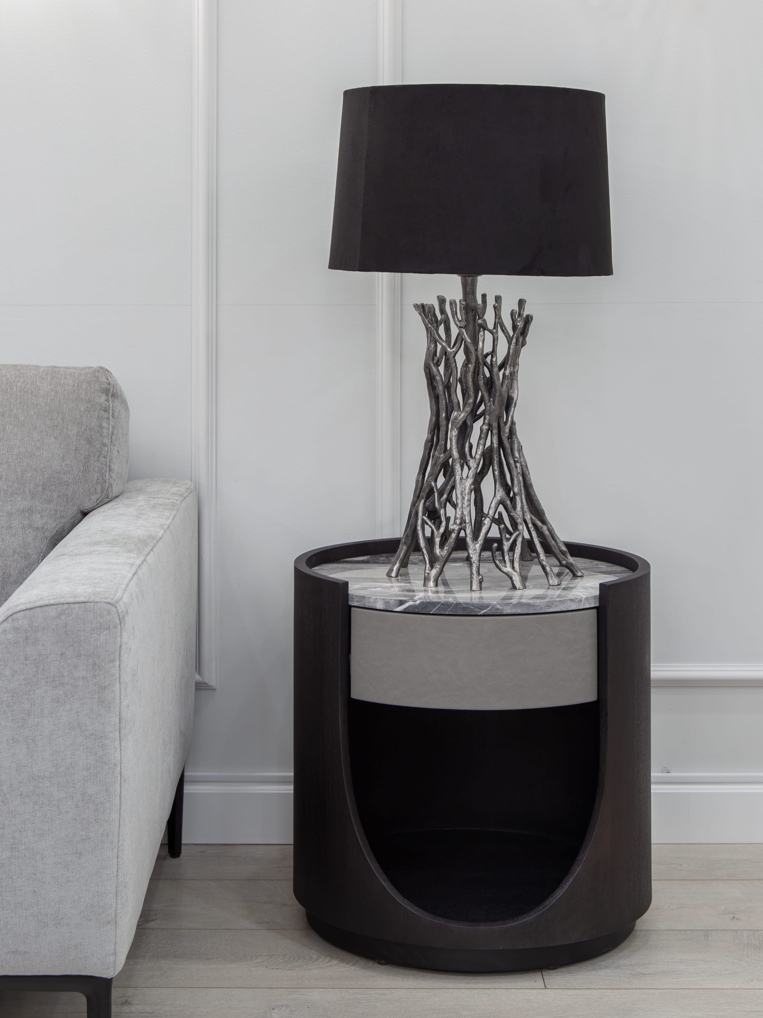 Округлые формы и изысканное сочетание мрамора, шпона и еврофлока в прикроватной тумбе Adela позволяют ей стать идеальным дополнением как классического, так и современного интерьера спальни.