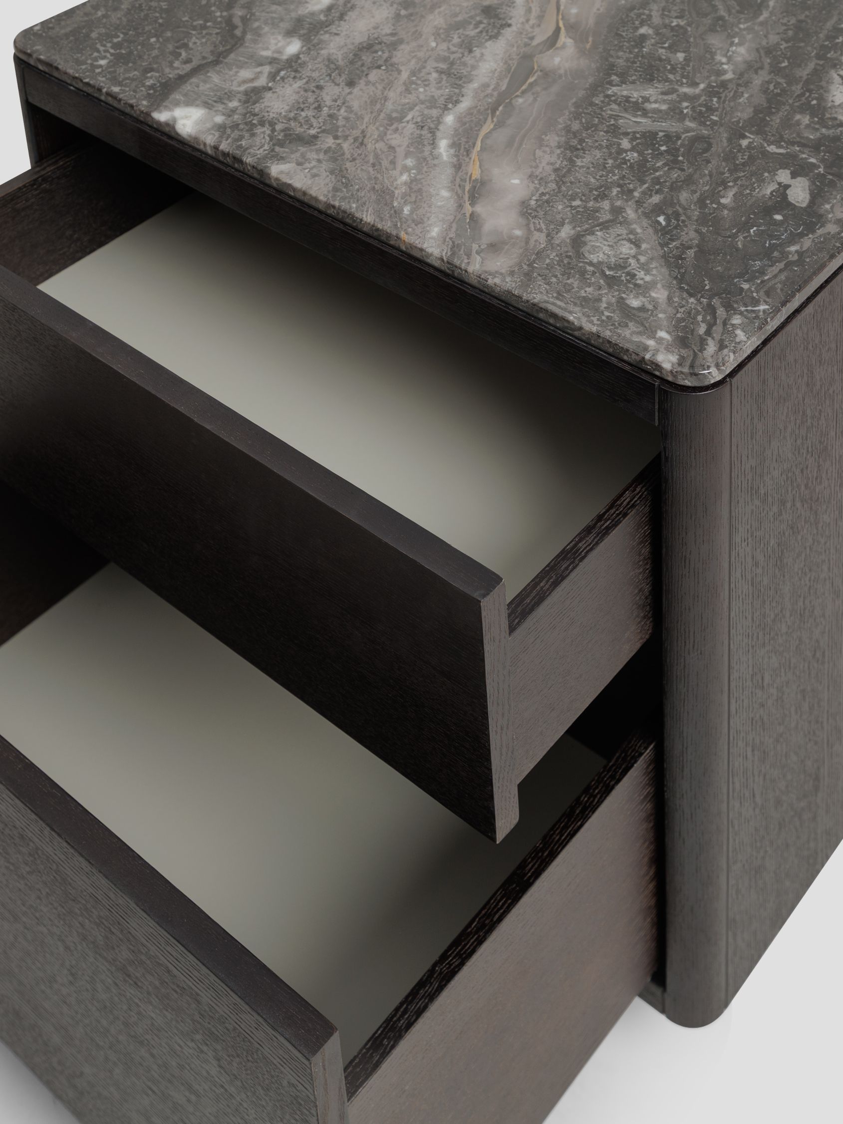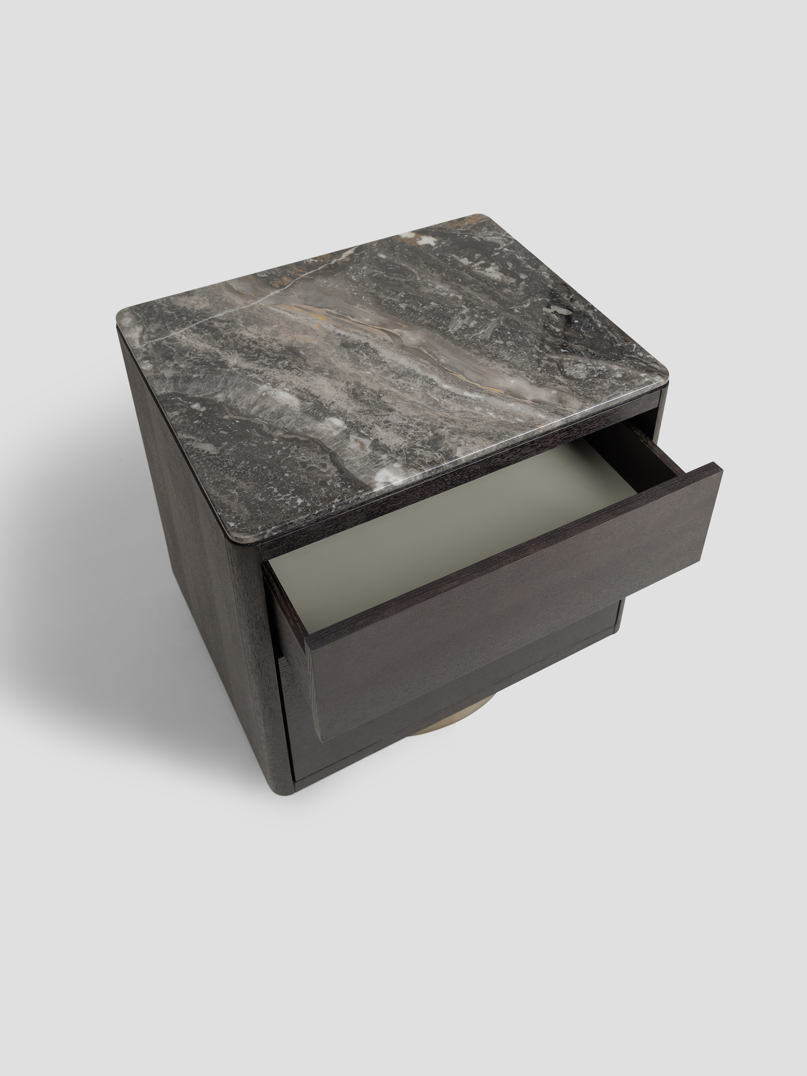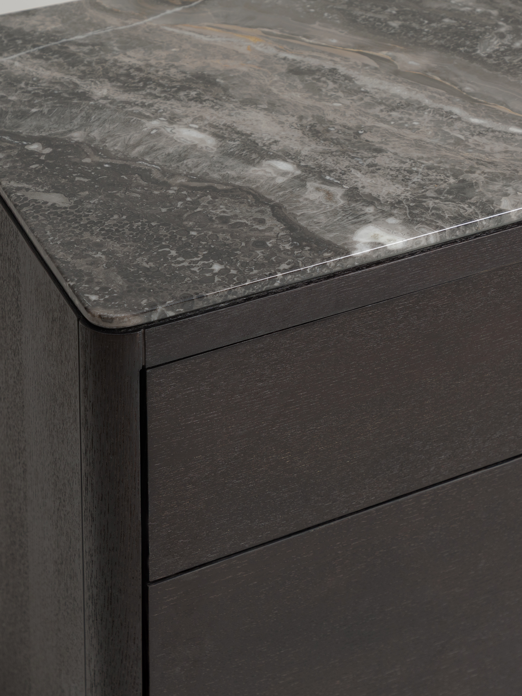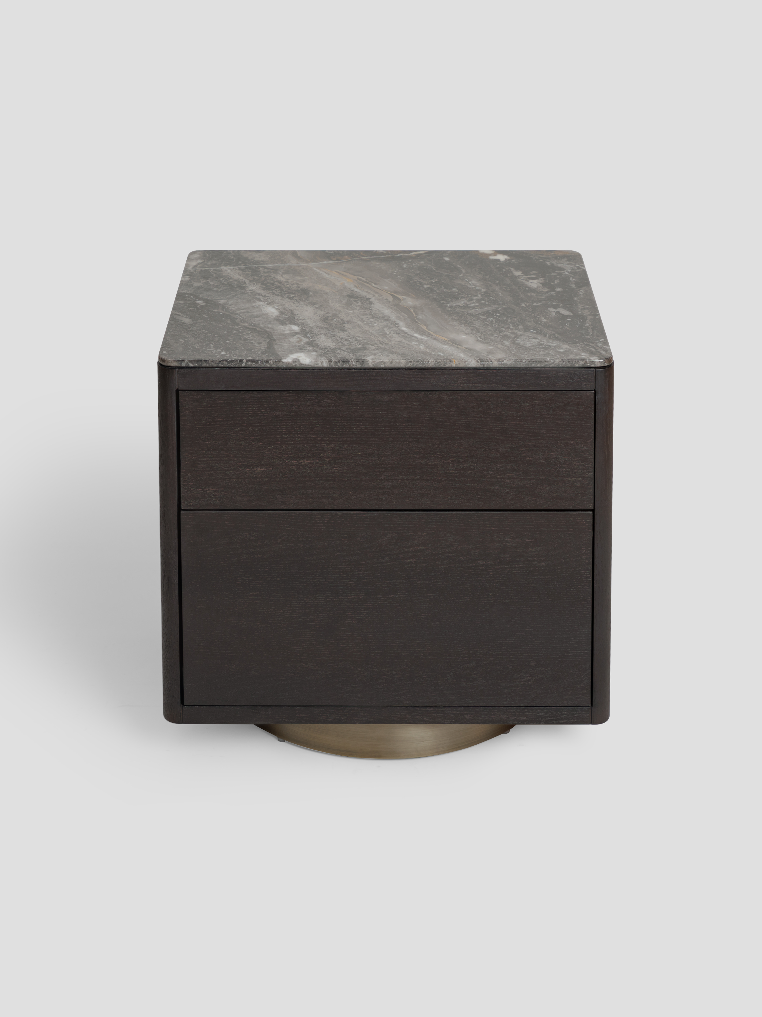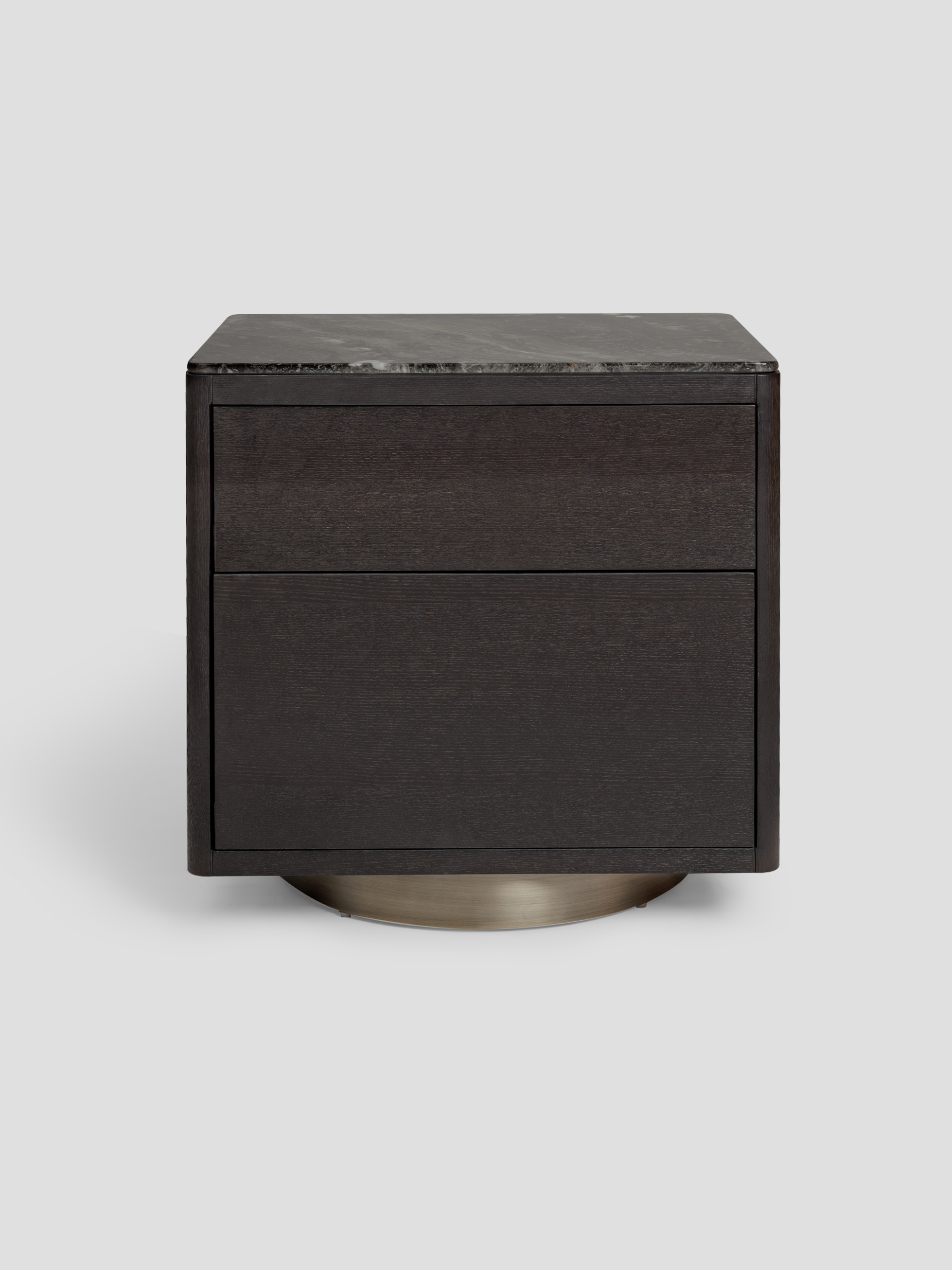 Прикроватная тумба Elsa — идеальное решение для современных спален, где мельчайшие детали пронизаны элегантностью. Характерная отделка из шпона и металлическое основание искусно дополнены столешницей из темного мрамора.