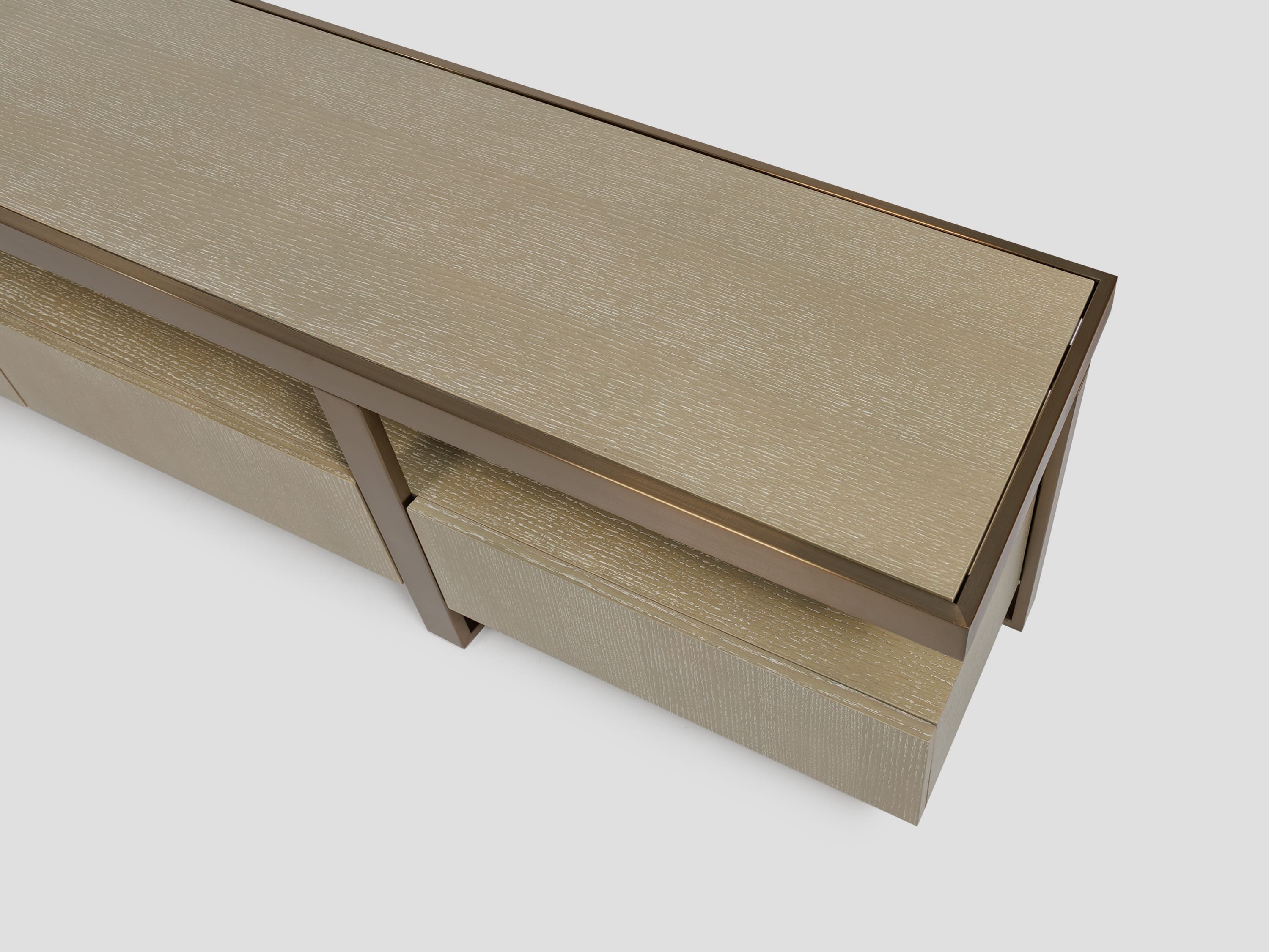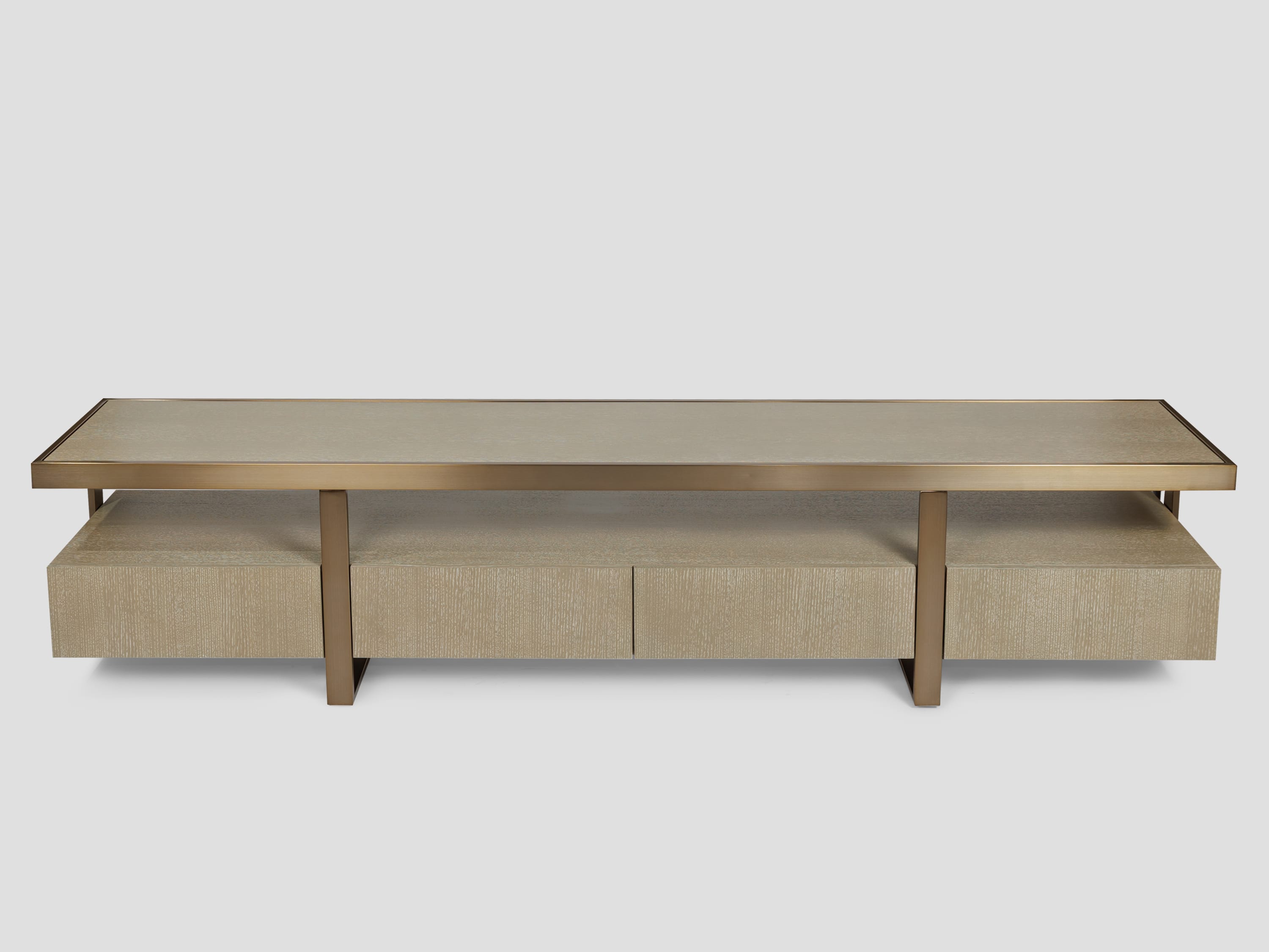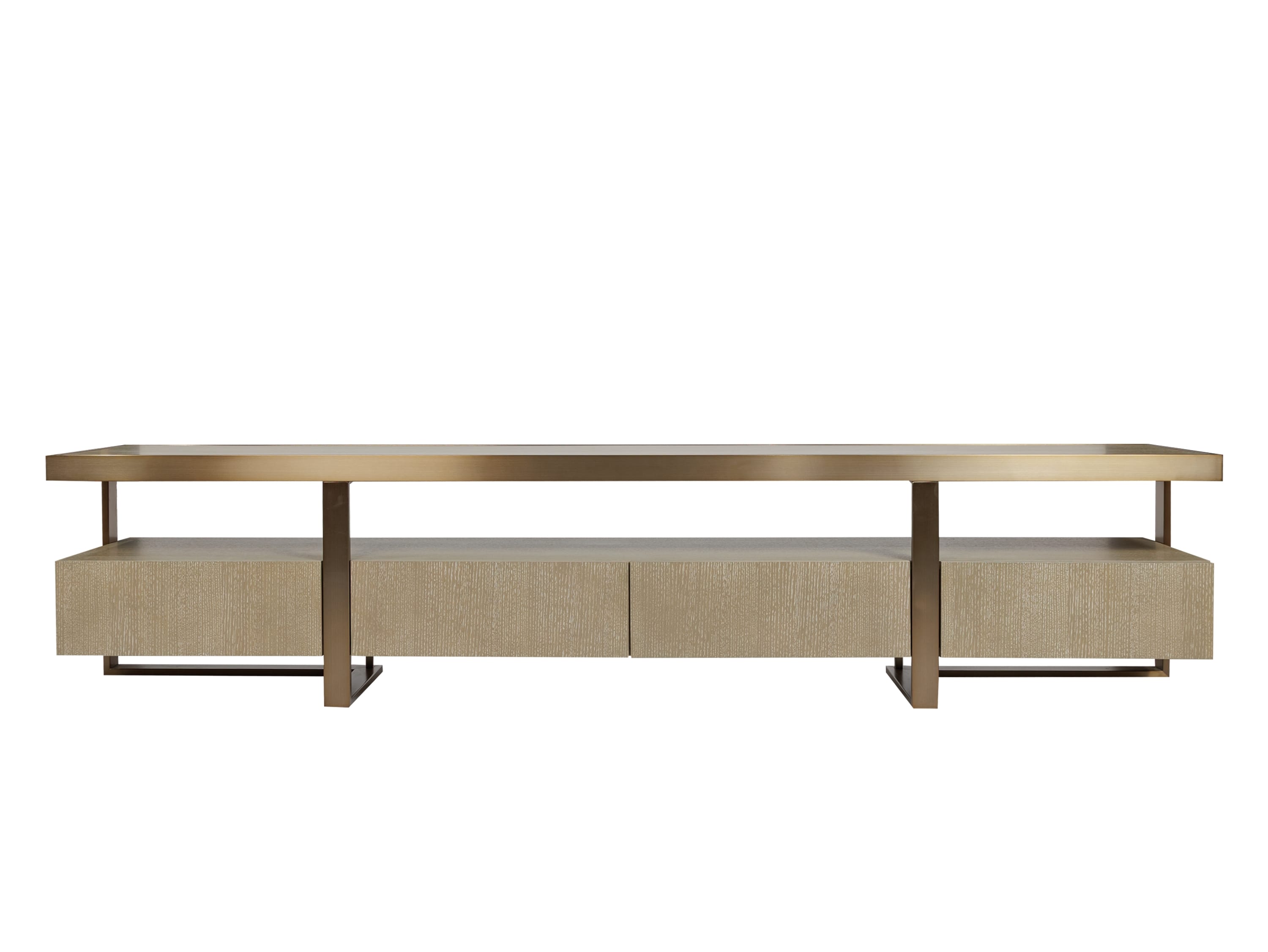 Cтрогий силуэт тумбы под ТВ Belle из шпона, стильно дополнен деталями из нержавеющей стали с гальванизацией под матовую латунь. Она станет идеальным предметом интерьера для ценителей утонченной эстетики.