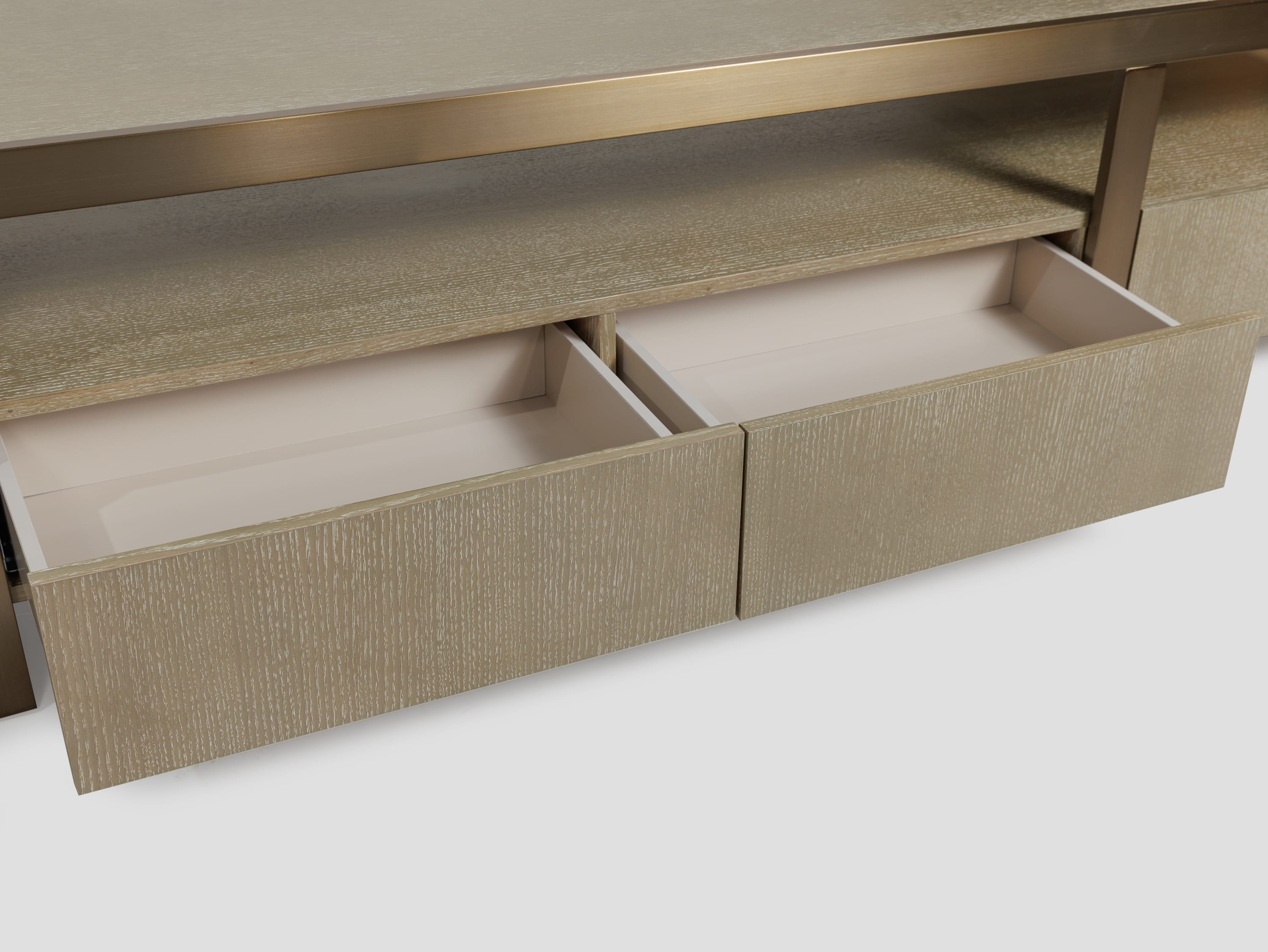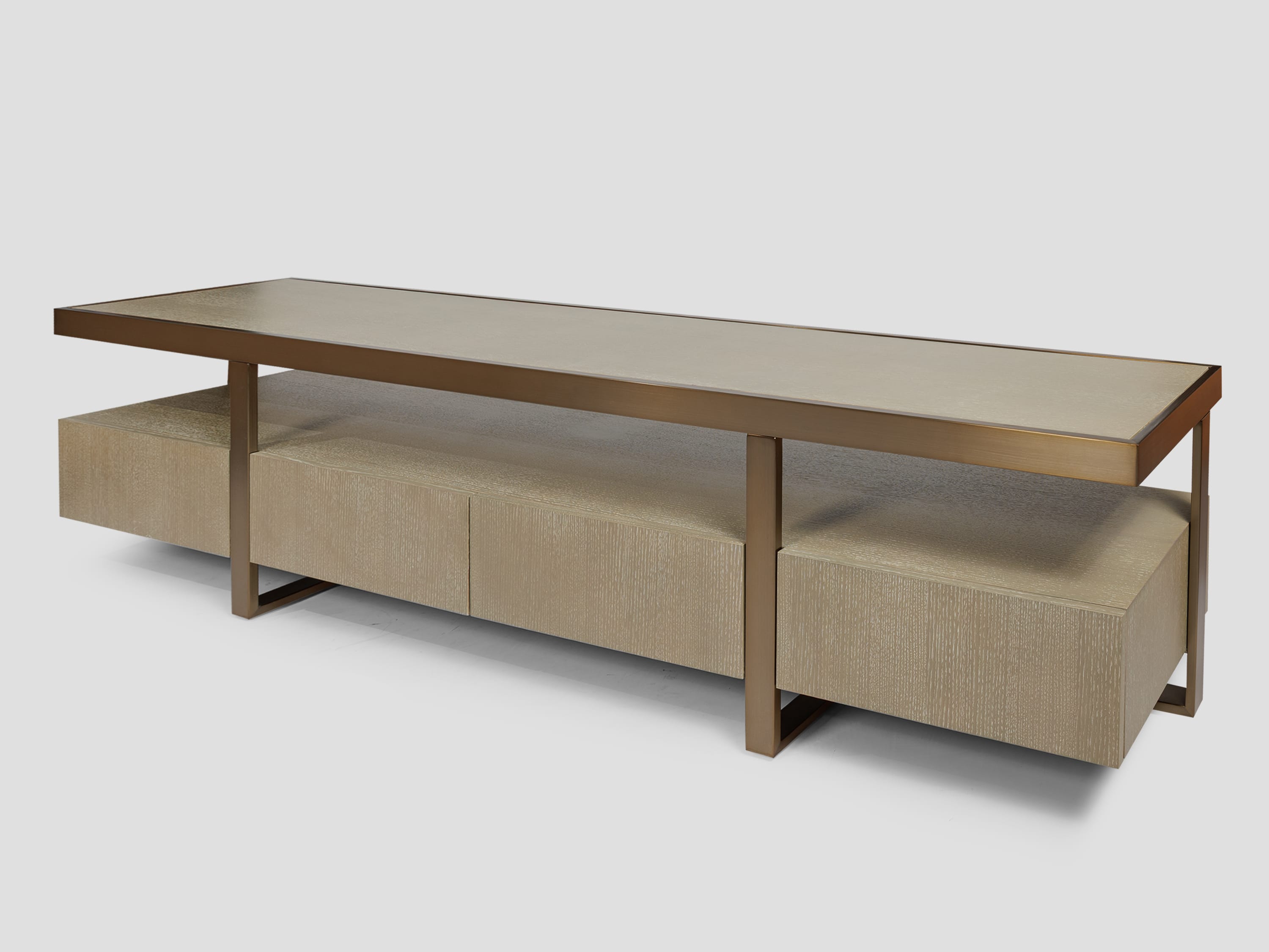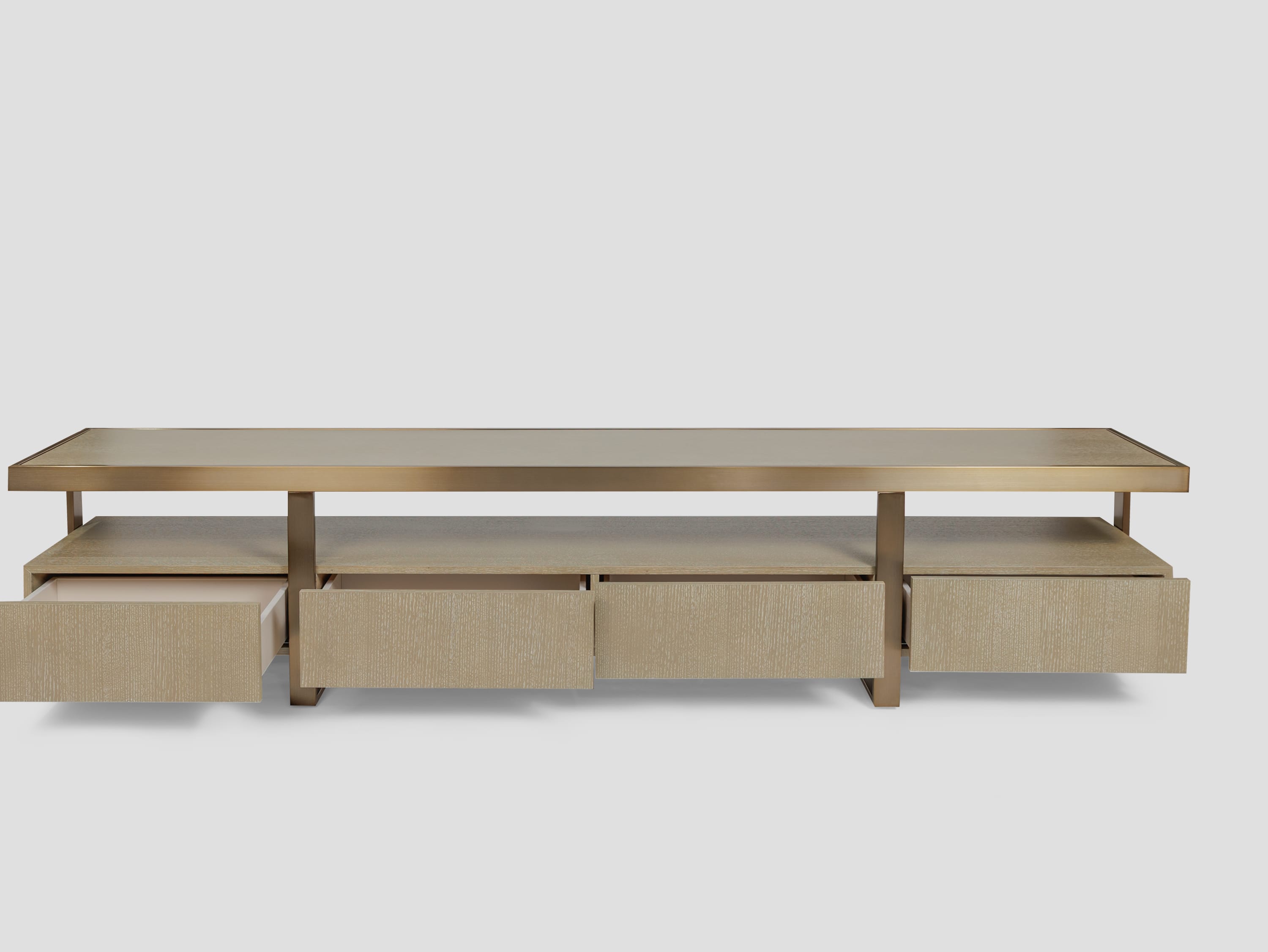 Cтрогий силуэт тумбы под ТВ Belle из шпона, стильно дополнен деталями из нержавеющей стали с гальванизацией под матовую латунь. Она станет идеальным предметом интерьера для ценителей утонченной эстетики.