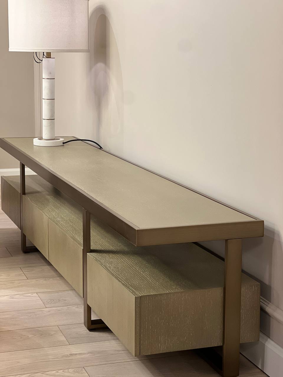 Материал: Нержавеющая сталь с гальваническим покрытием, Шпон дуба, Основание - МДФ, Столешница - закаленное дымчатое стекло