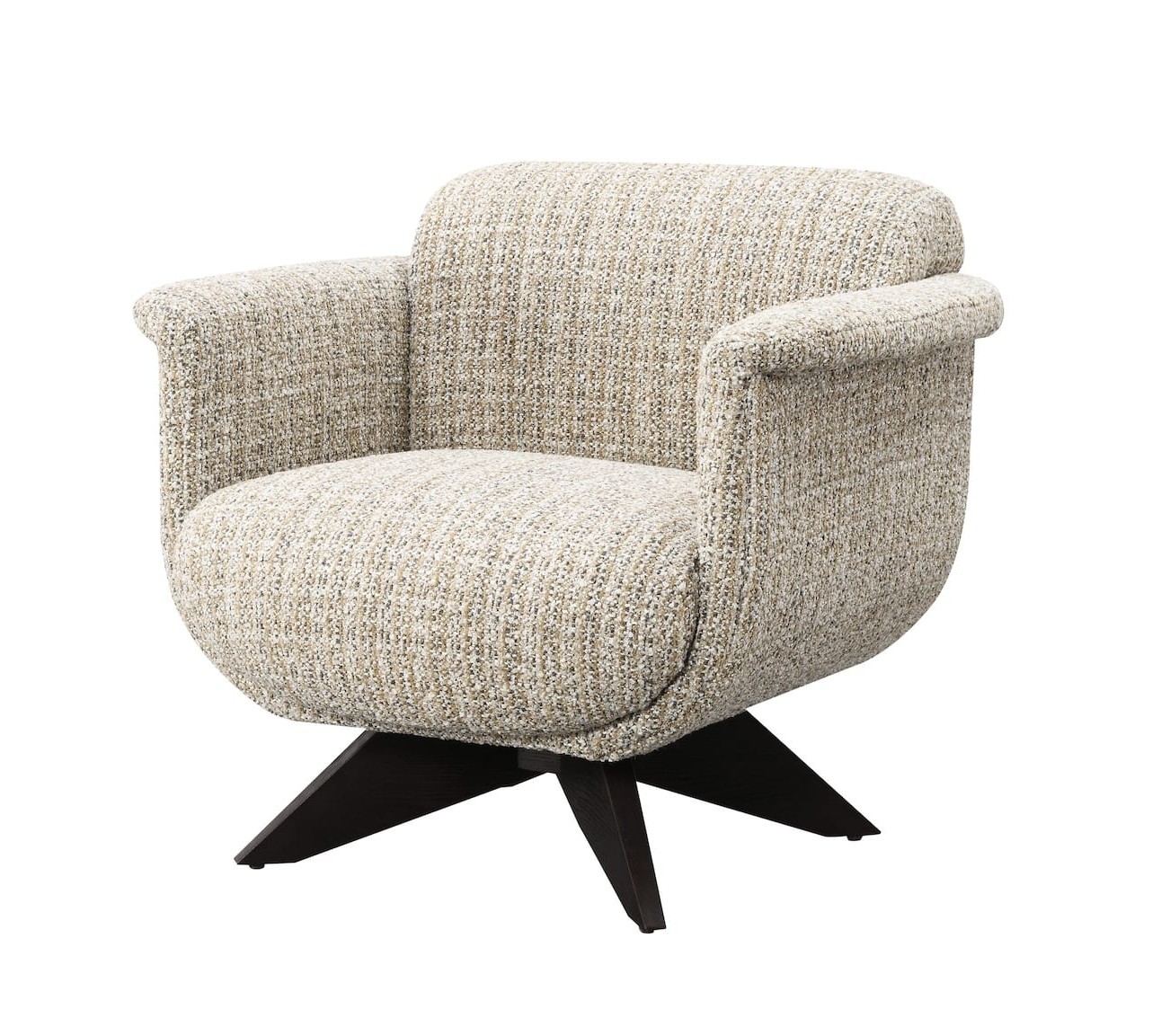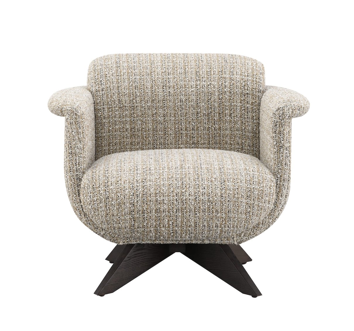 Вращающееся кресло Avel — это безупречный баланс мягких форм и природной эстетики. Скрытый поворотный механизм на 360° добавляет модели функциональности и свободы движений. Ширина 82 см и эргономичный силуэт гарантируют комфорт, в то время как фактурная ткань букле в оттенке «бежево-серый меланж» придает интерьеру визуальную многогранность. Массивное крестообразное основание и плавные линии корпуса делают это кресло стильным акцентом в современной гостиной или спальне.
