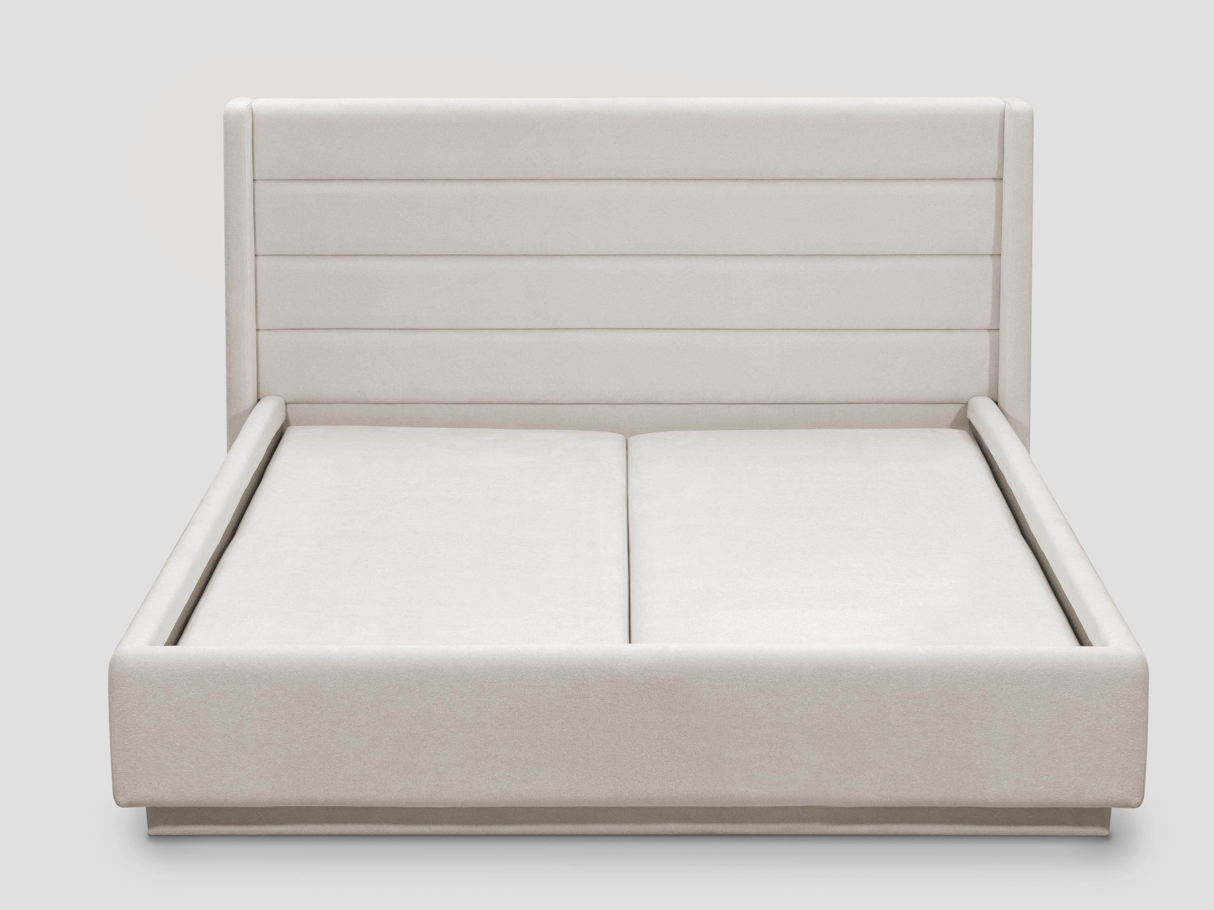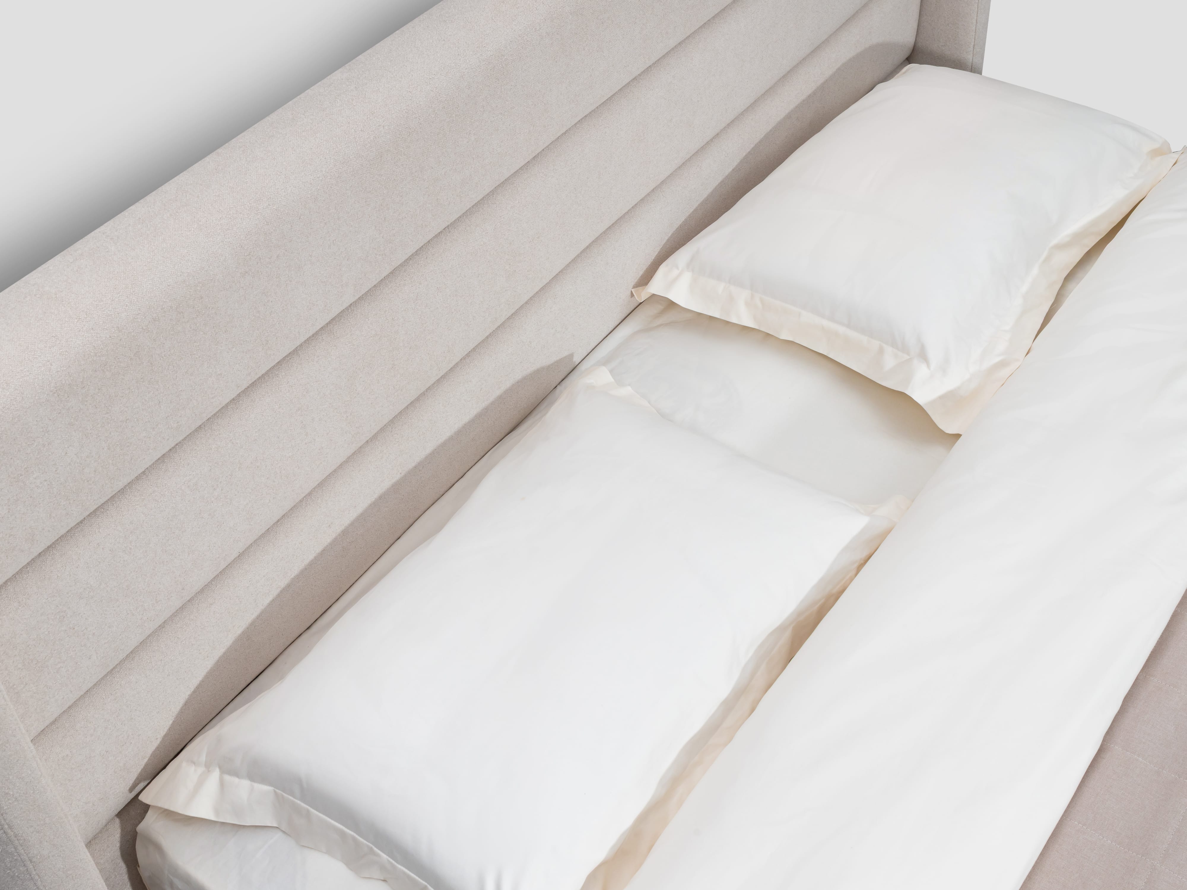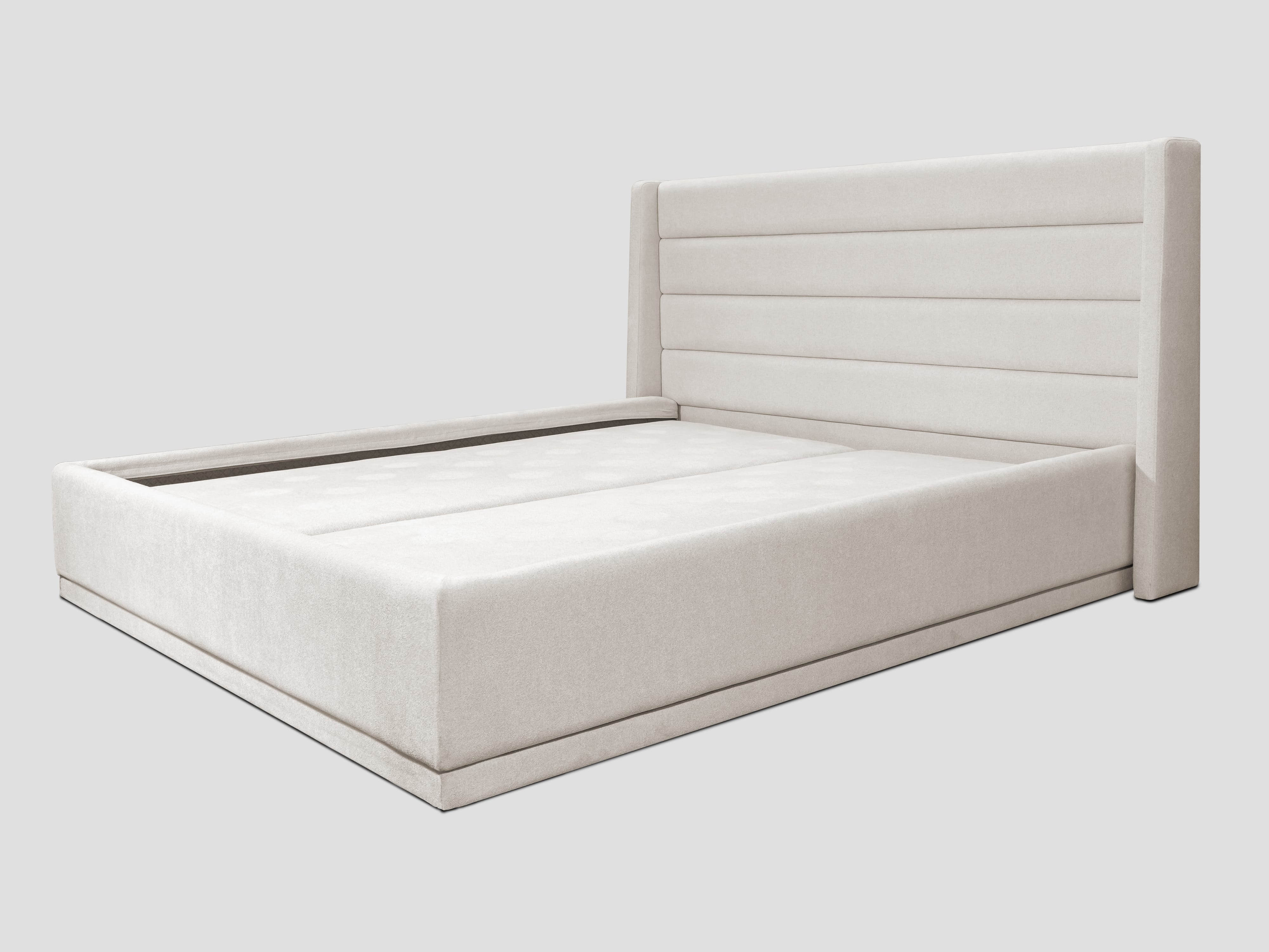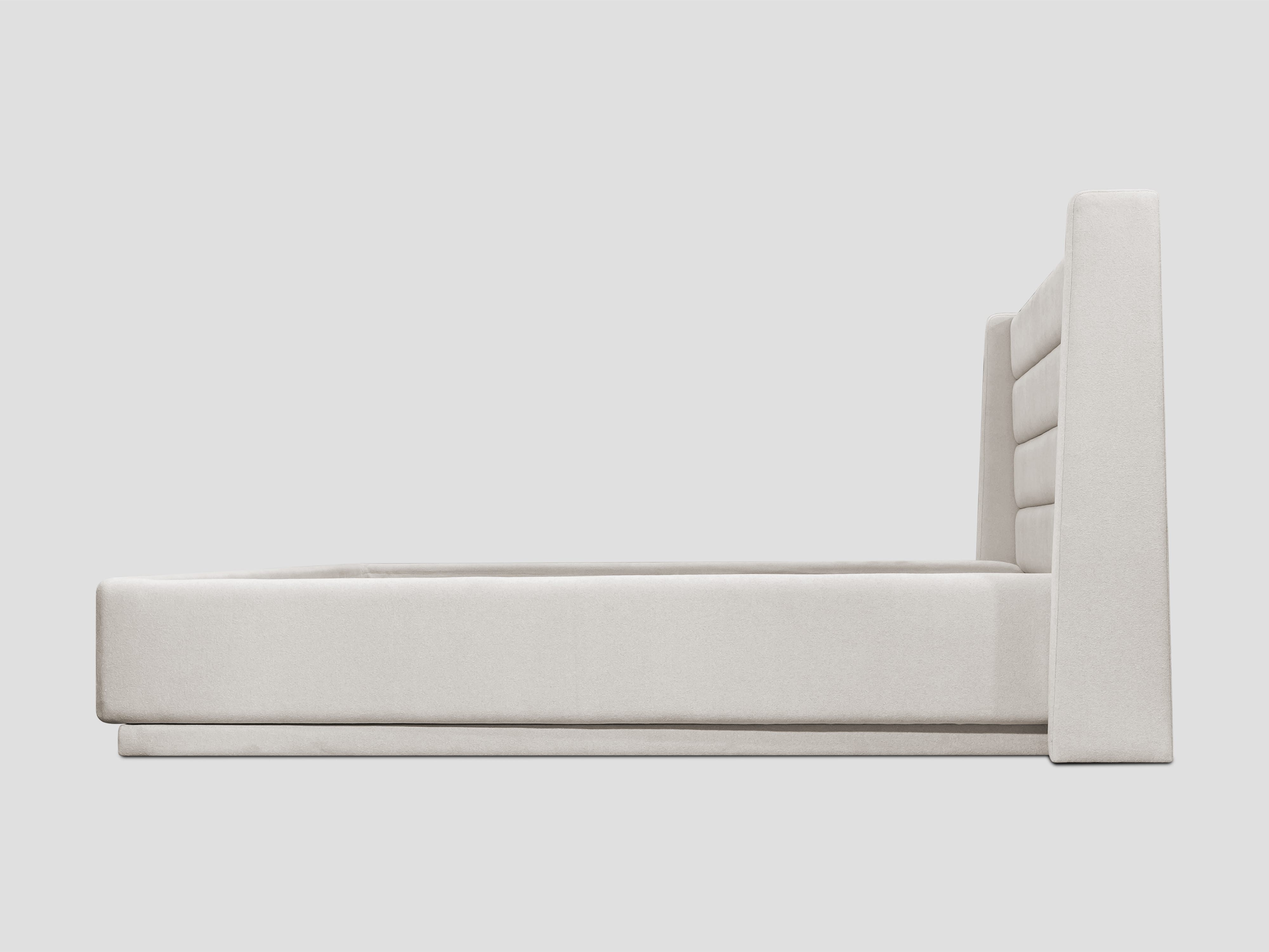 Мягкие изгибы и плавные линии создают привлекательный образ кровати Dakota. Высокое изголовье образованное из горизонтальных элементов с фактурной обивкой тканью букле делает ее стильным украшением спальни как в классическом, так и в современном интерьере.