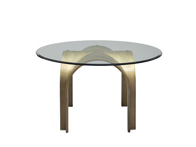 Ножки обеденного стола Clovis, выполненные в виде арок, словно повторяют очертания архитектурных форм величественного здания. Поддерживая круглую столешницу из стекла, они создают оригинальный дизайн, в котором легкость и монументальность гармонично дополняют друг друга.