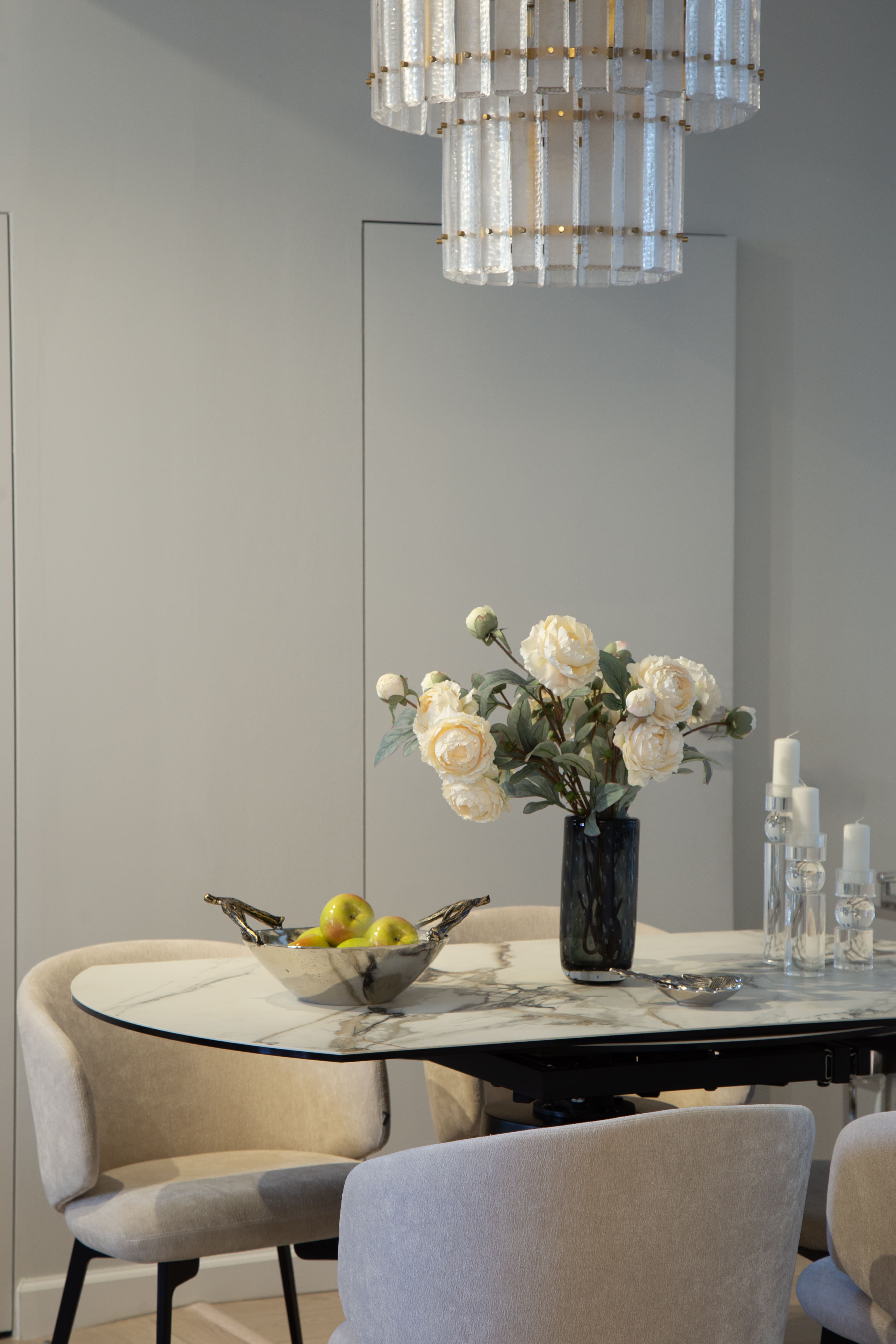 Обеденный стол Kevin с элегантным силуэтом станет центром вашего интерьера. Столешница из прочной итальянской керамики, защищенная закаленным стеклом, придает его дизайну оригинальные черты. Итальянская керамика имеет продолжительный срок службы, обладает высокой прочностью, не скалывается и не впитывает жидкости или пятна. Толщина столешницы 3 мм. Благодаря раздвижному механизму форма стола трансформируется из круглой в прямоугольную, превращая его в просторное место для больших компаний. Лаконичное металлическое основание подчеркивает современный стиль обеденного стола. Размер прямоугольной столешницы