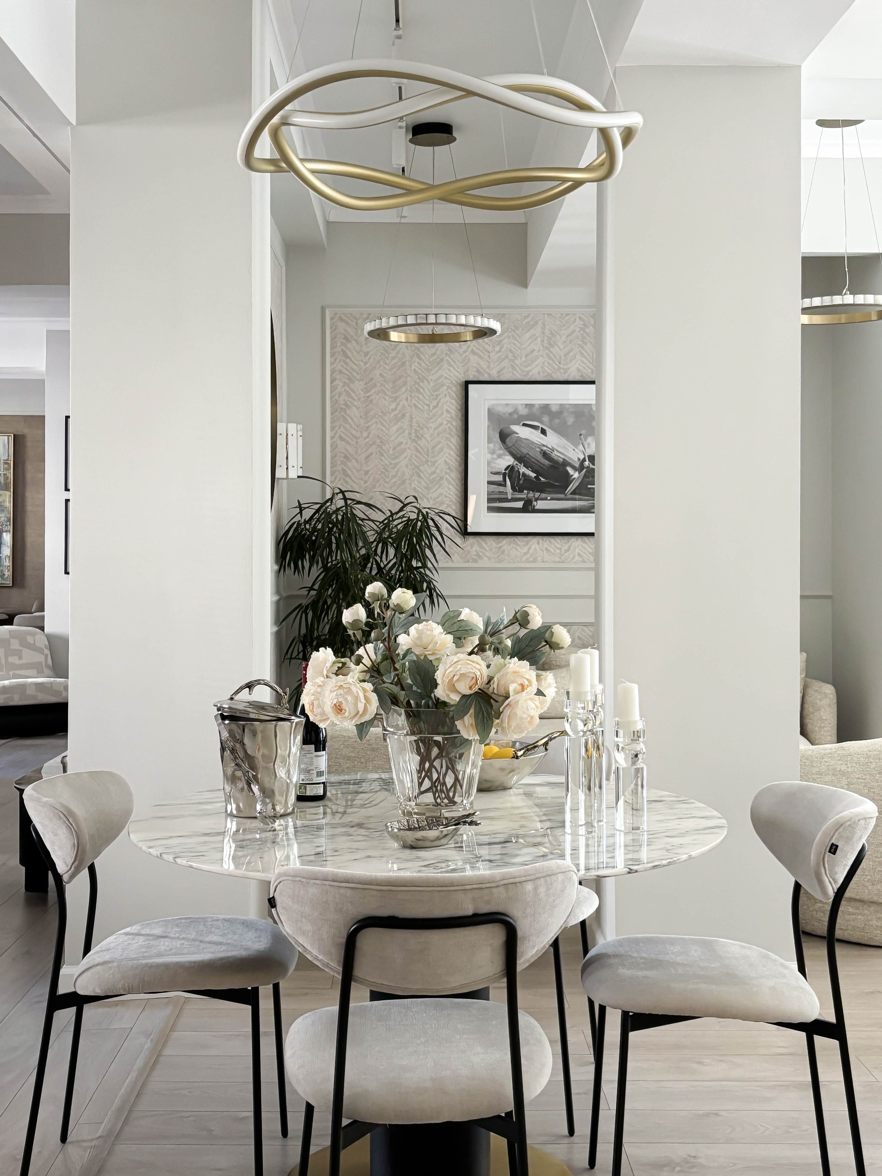 Мраморная столешница обеденного стола Saro делает его дизайн воплощением утончённой элегантности. Природные узоры мрамора придают дизайну уникальность и визуальную привлекательность. Стол идеально впишется в интерьер вашей столовой зоны или кухни, становясь центральным акцентом пространства.