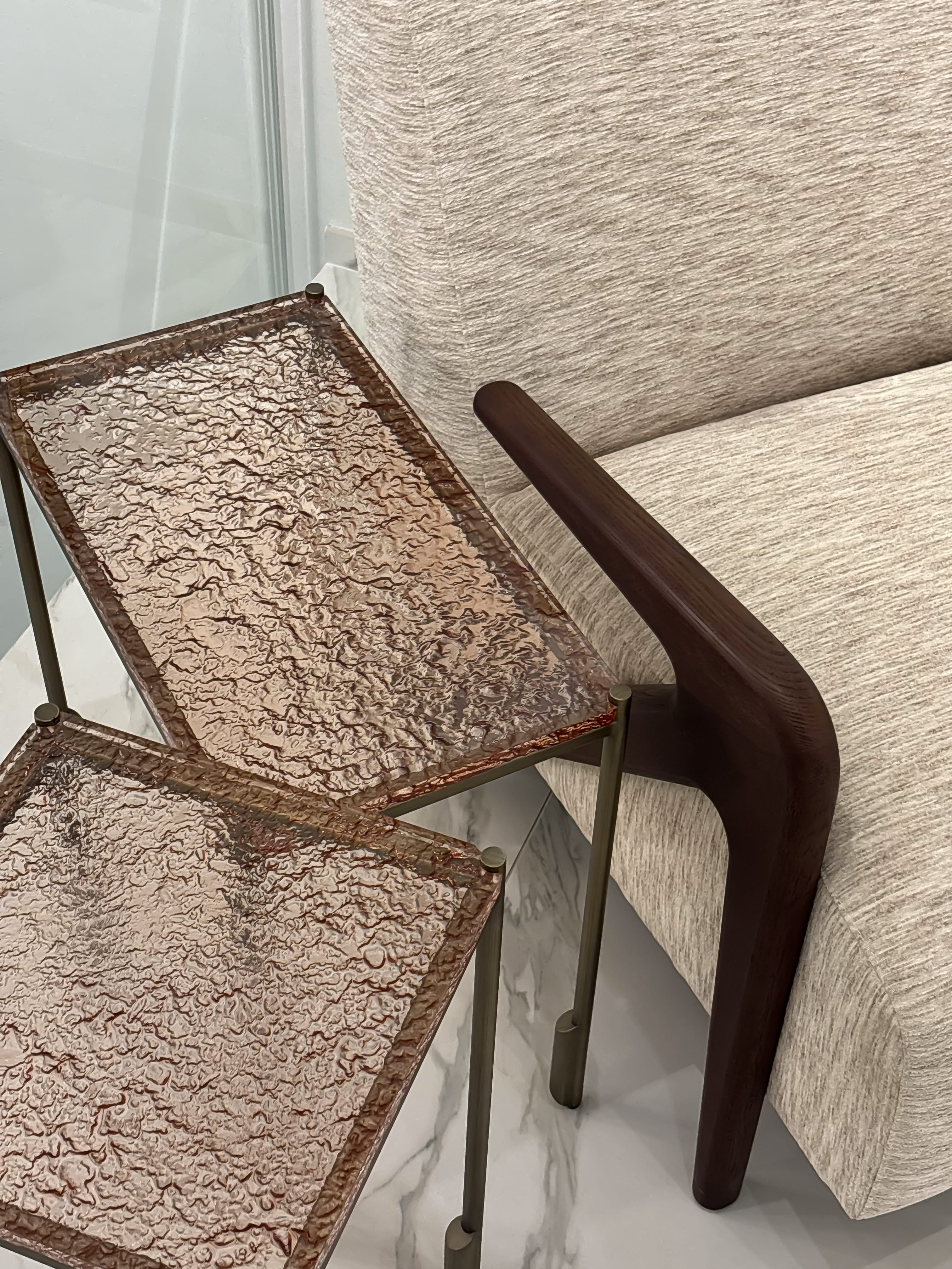 Приставной стол Denton на тонких металлических ножках очаровывает своей изысканностью и легкостью. Столешница из акрила с рельефной фактурой создает интересную игру света и текстур, добавляя столу динамичность и современный шик. Этот элегантный предмет мебели станет функциональным украшением интерьера, подчеркивая его стиль и утонченность.