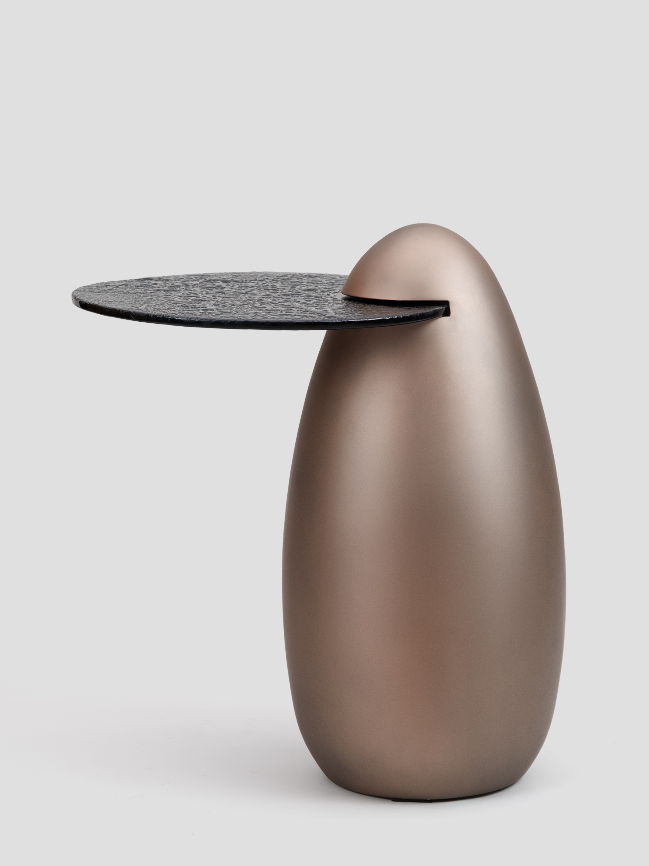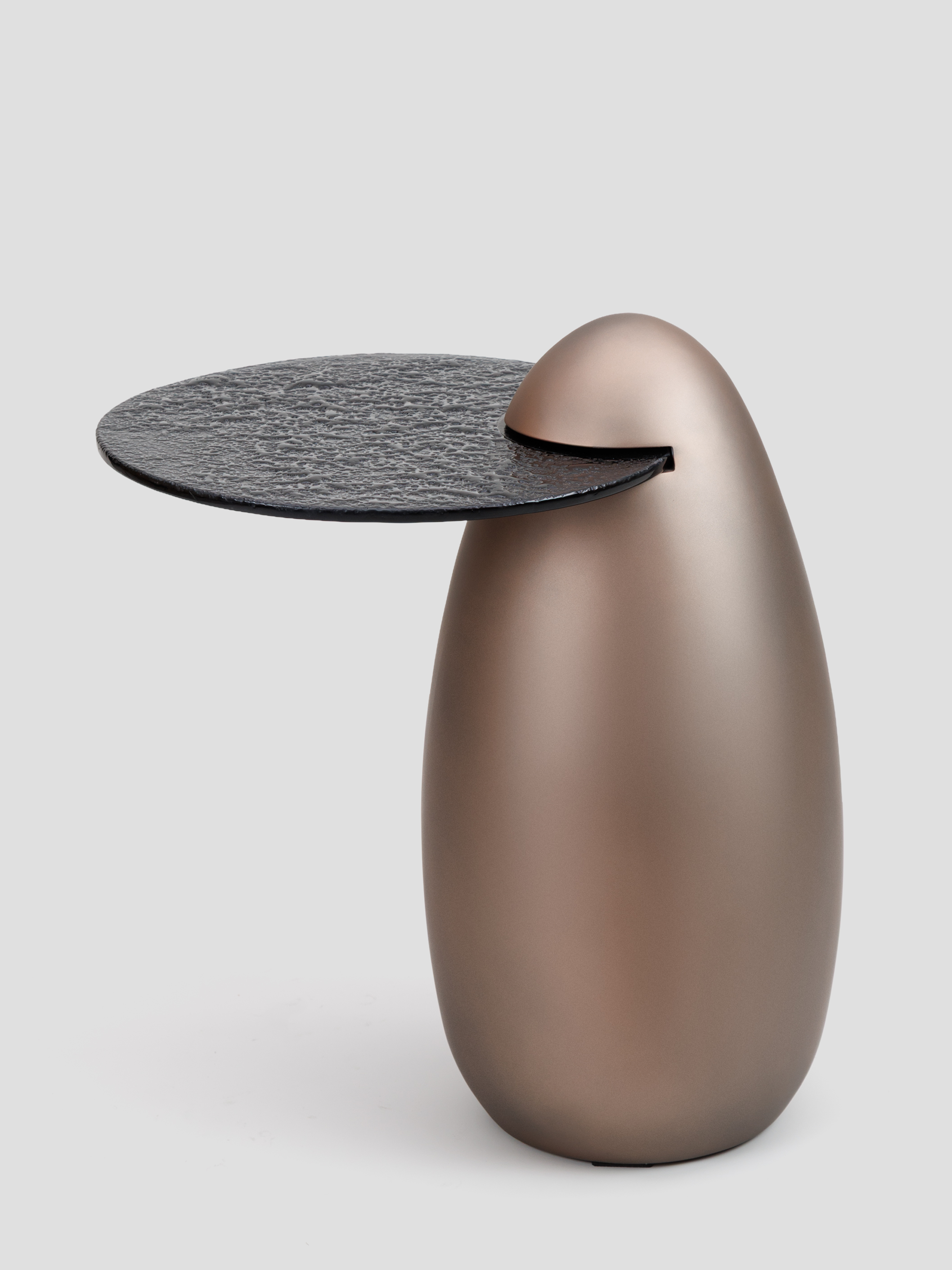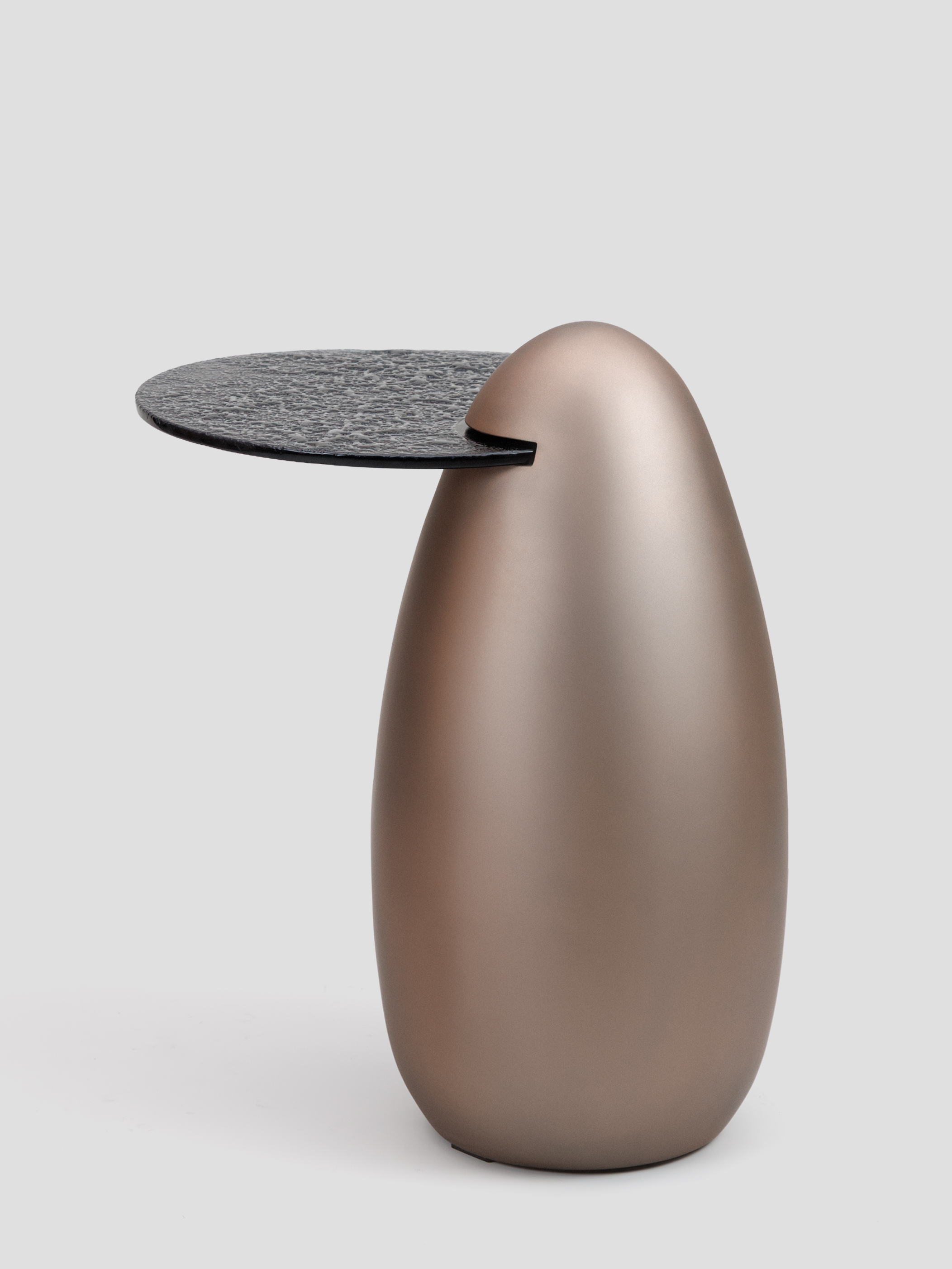Приставной стол Lani — предмет интерьера со скульптурной выразительностью. Его плавный, органичный объём напоминает отполированный монолит: основание из прочного стеклопластика с матовой поверхностью придаёт столу устойчивость и футуристичную эстетику. Столешница из ручного дымчатого стекла с уникальной фактурой — каждая поверхность выполнена мастером вручную, что делает стол Lani по-настоящему индивидуальным. Идеален как акцент у дивана или кресла — не просто предмет интерьера, а арт-объект, создающий настроение пространству.