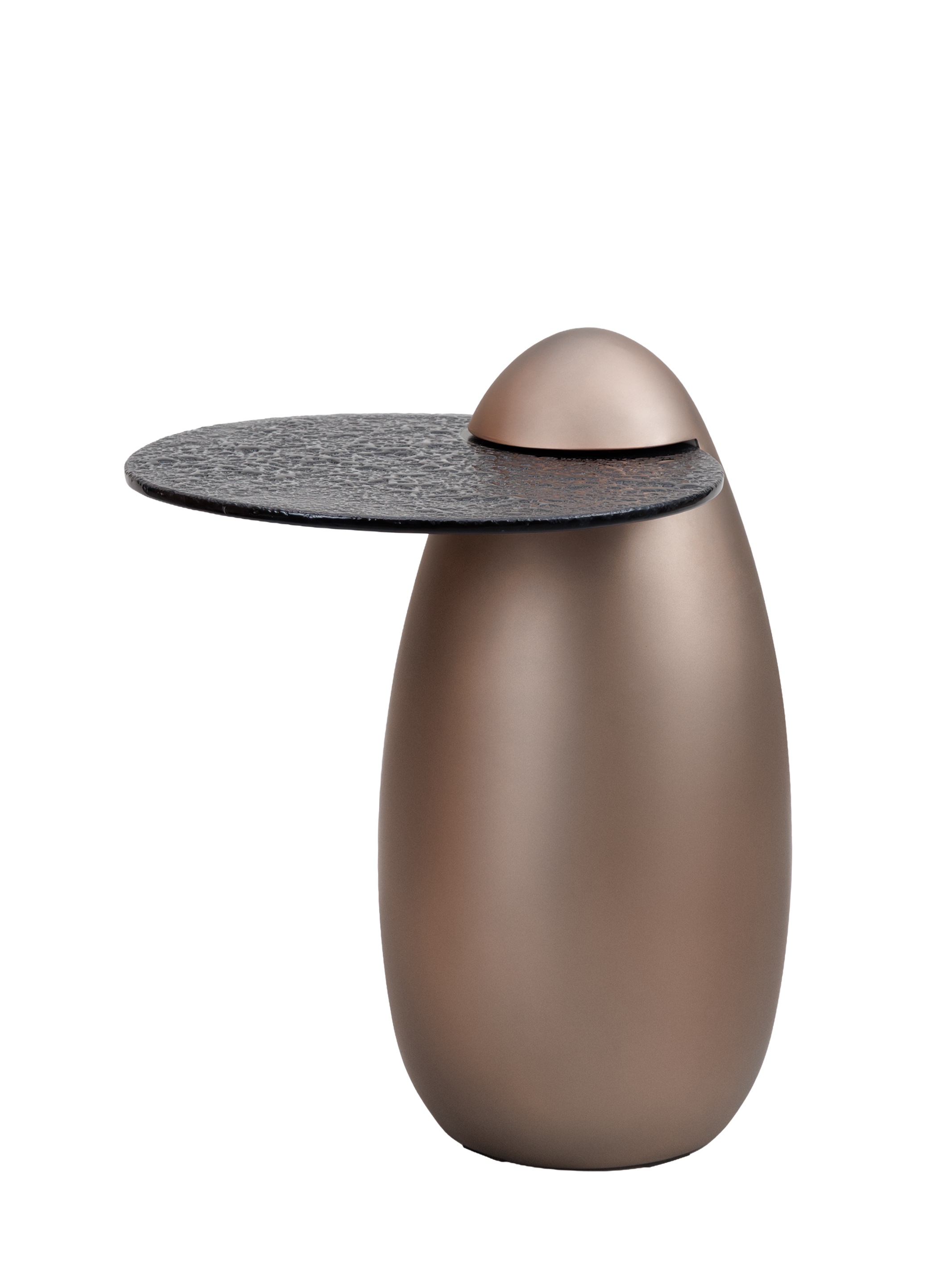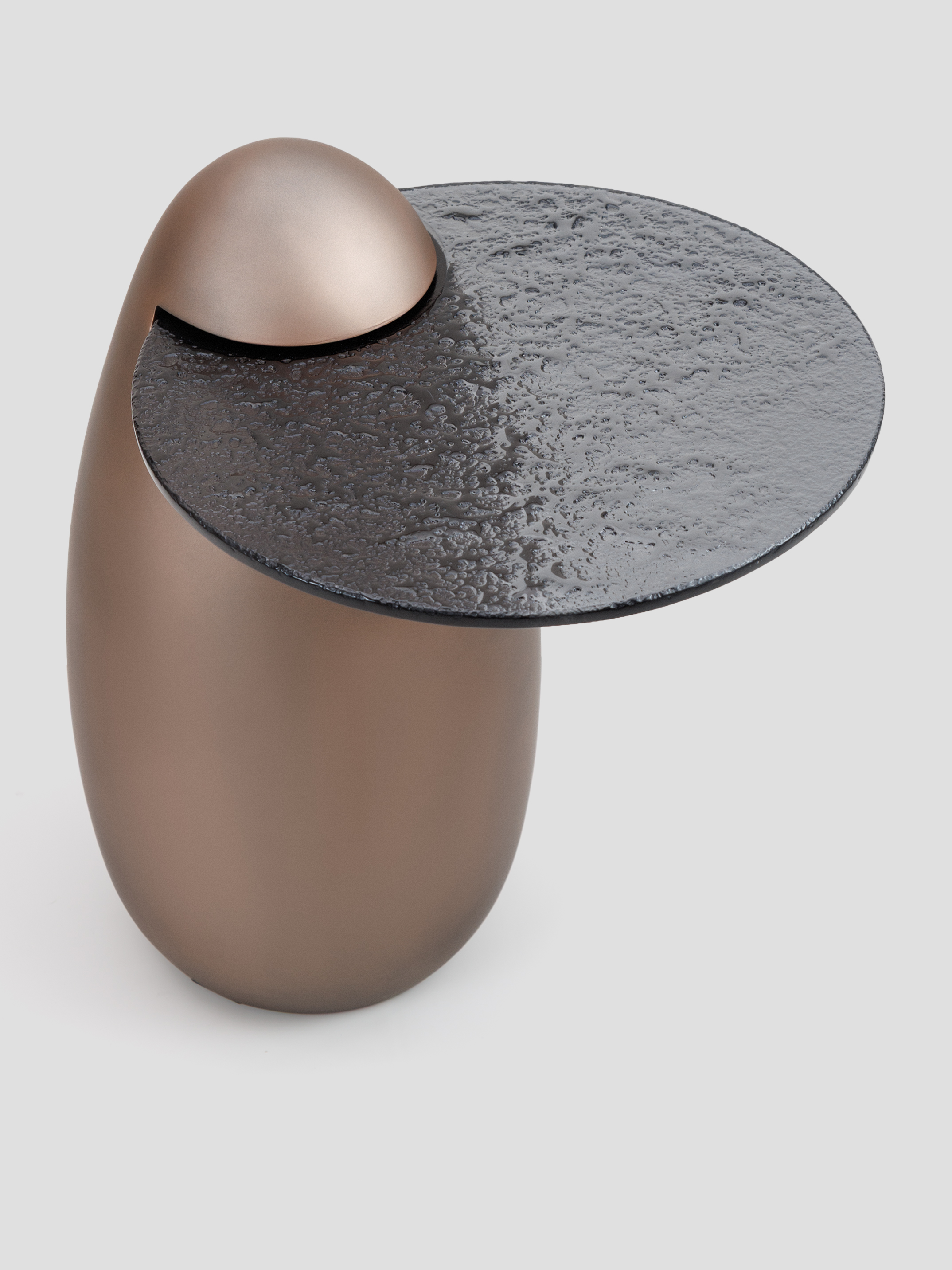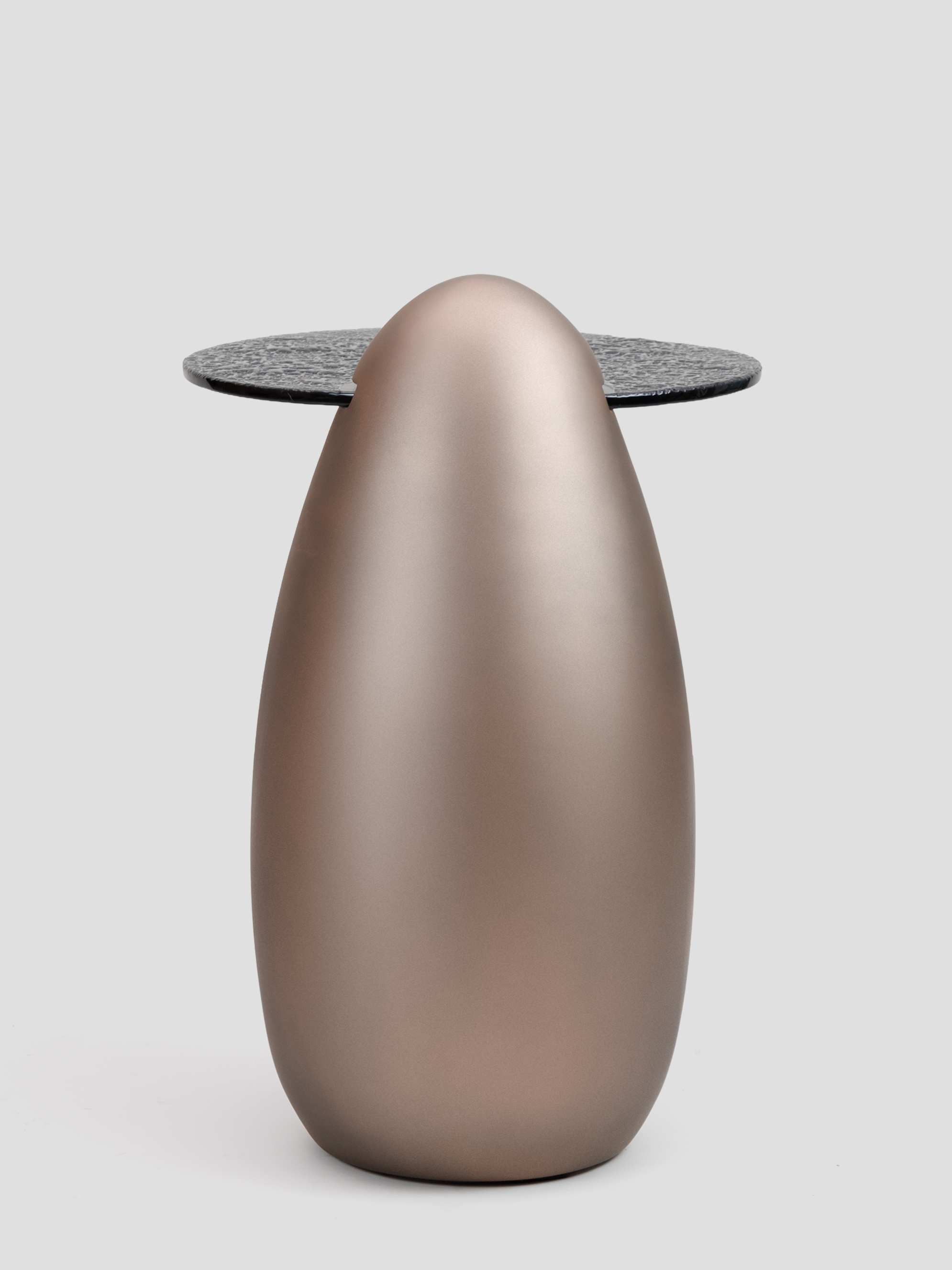 Приставной стол Lani — предмет интерьера со скульптурной выразительностью. Его плавный, органичный объём напоминает отполированный монолит: основание из прочного стеклопластика с матовой поверхностью придаёт столу устойчивость и футуристичную эстетику. Столешница из ручного дымчатого стекла с уникальной фактурой — каждая поверхность выполнена мастером вручную, что делает стол Lani по-настоящему индивидуальным. Идеален как акцент у дивана или кресла — не просто предмет интерьера, а арт-объект, создающий настроение пространству.