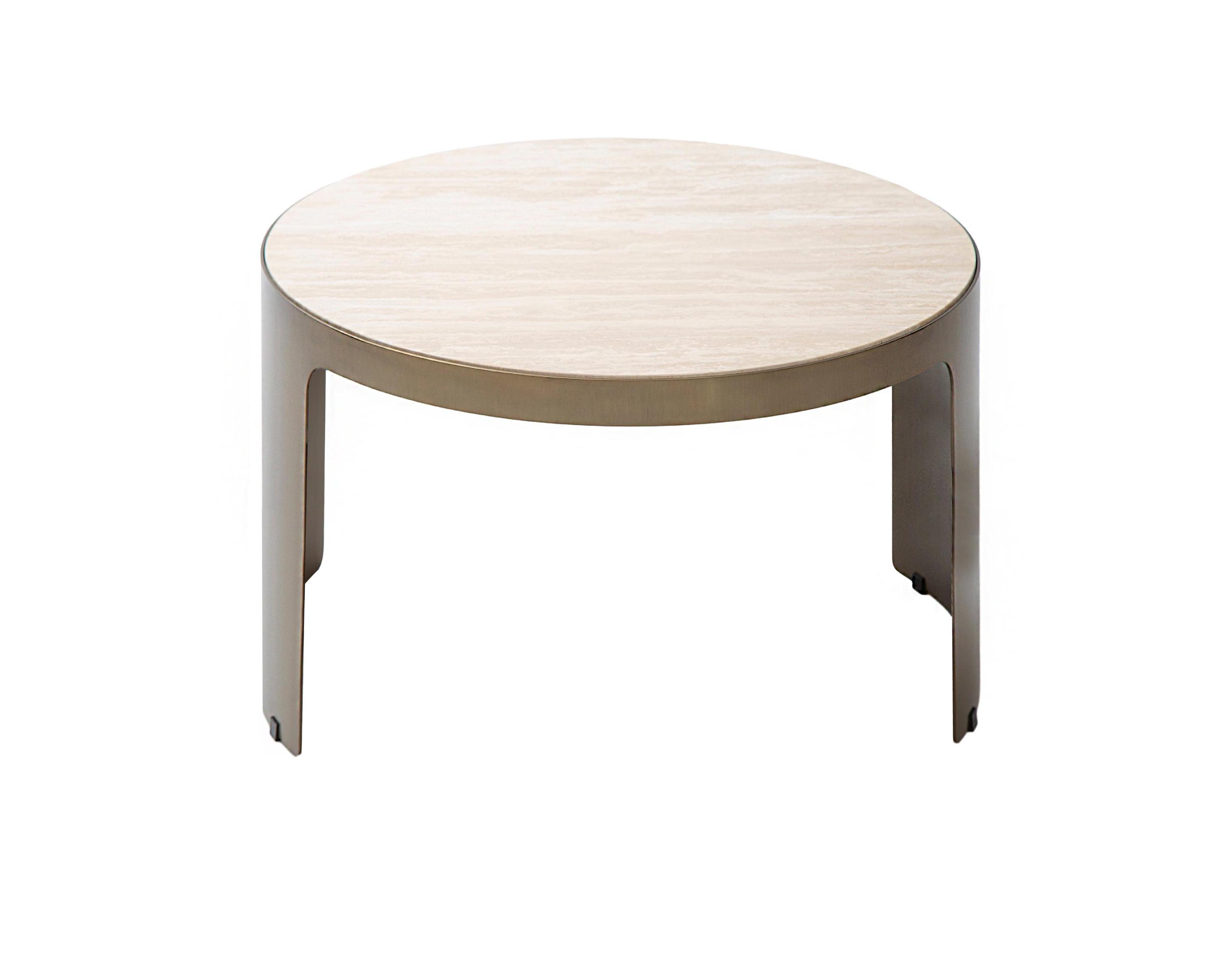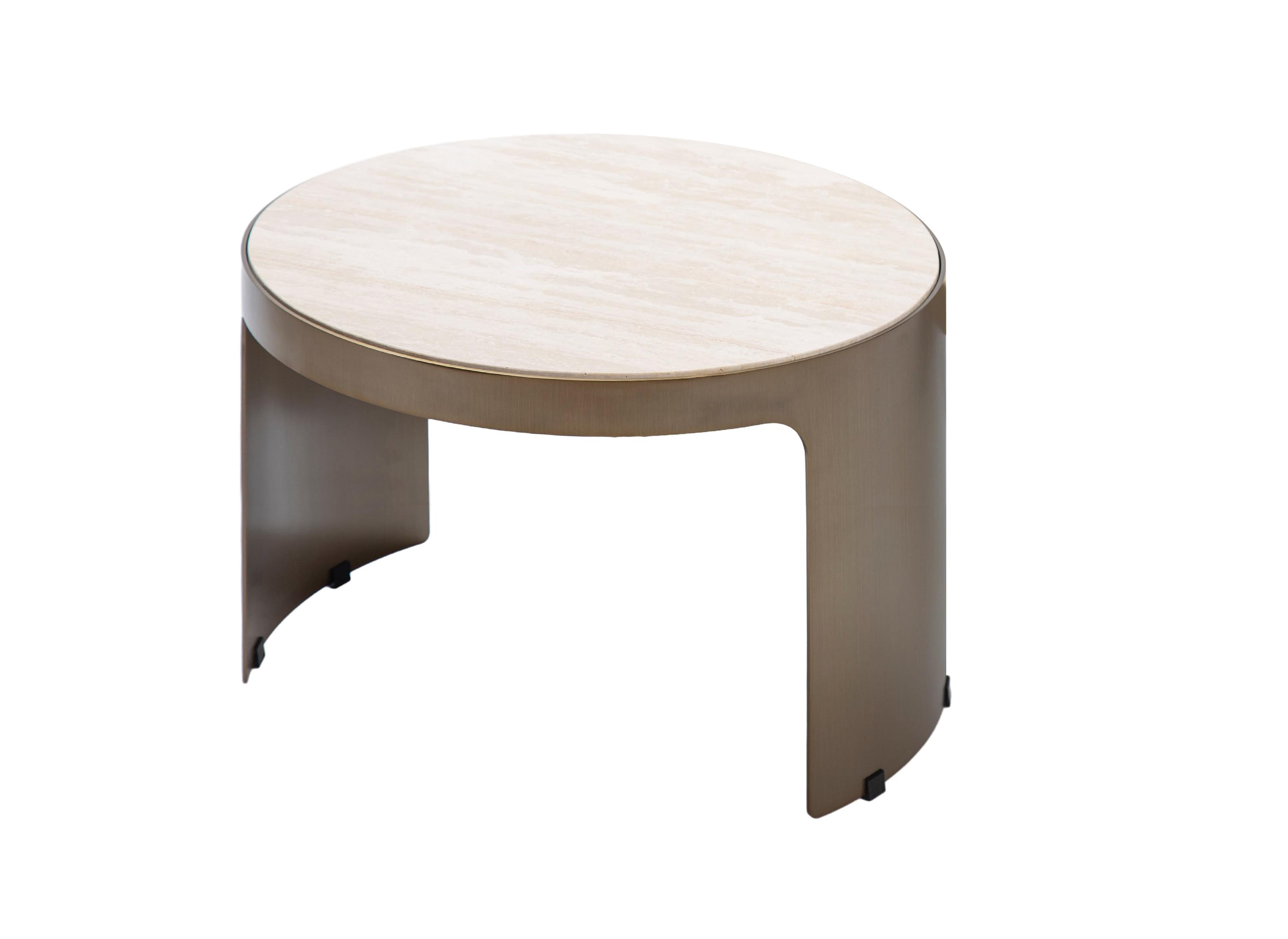 Круглая столешница из травертина на металлическом основании под матовую латунь делают приставной стол Mathias исключительным украшением интерьера. Плавность линий круглого обрамления, переходящего в симметричные ножки, изящно подчеркнута сочетанием материалов.