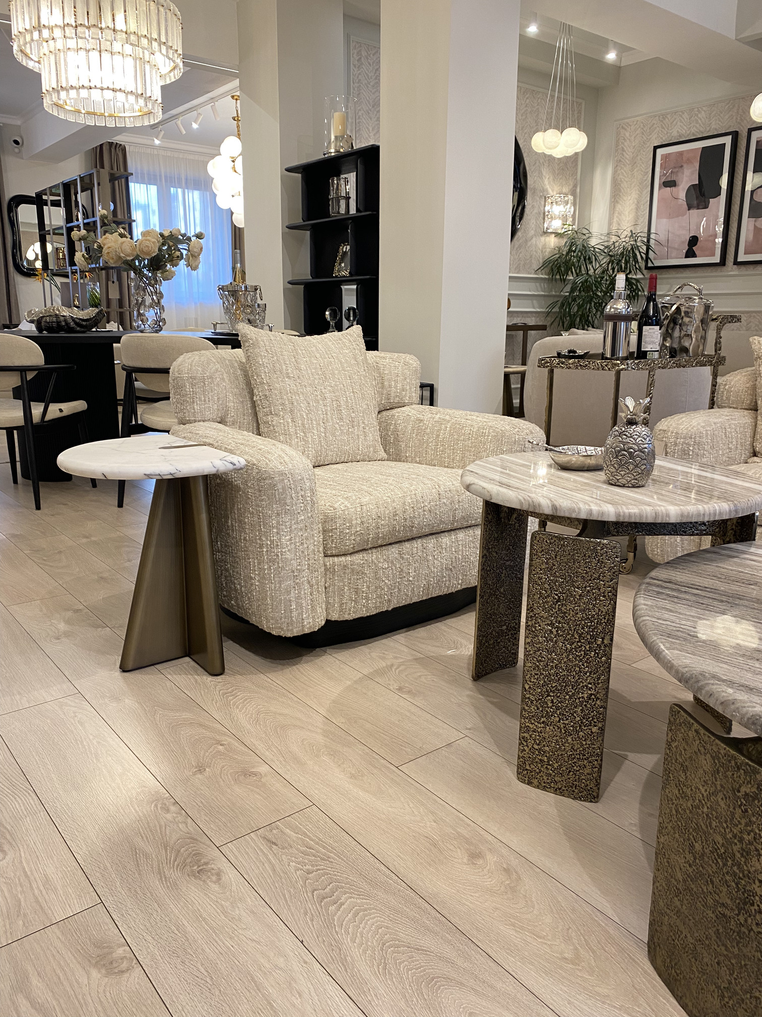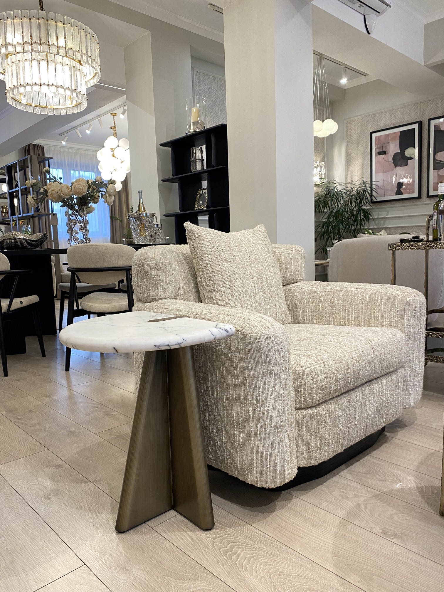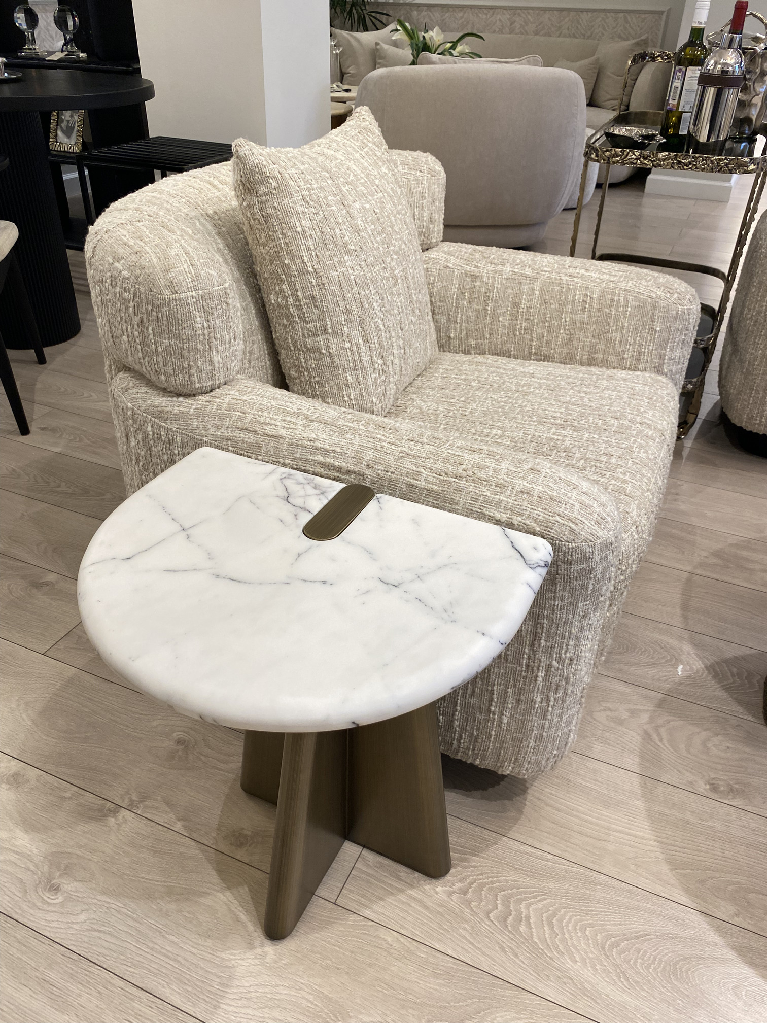 Приставной столик Mauro c полукруглой столешницей из натурального мрамора с графичными серыми прожилками задает ритм пространства. Металлическое основание сочетает строгую геометрию и плавные линии, создавая ощущение невесомости. Форма столика отвечает тренду на плавные, но выразительные силуэты. У дивана, или кресла становится не просто функционалом, а визуальным фокусом.