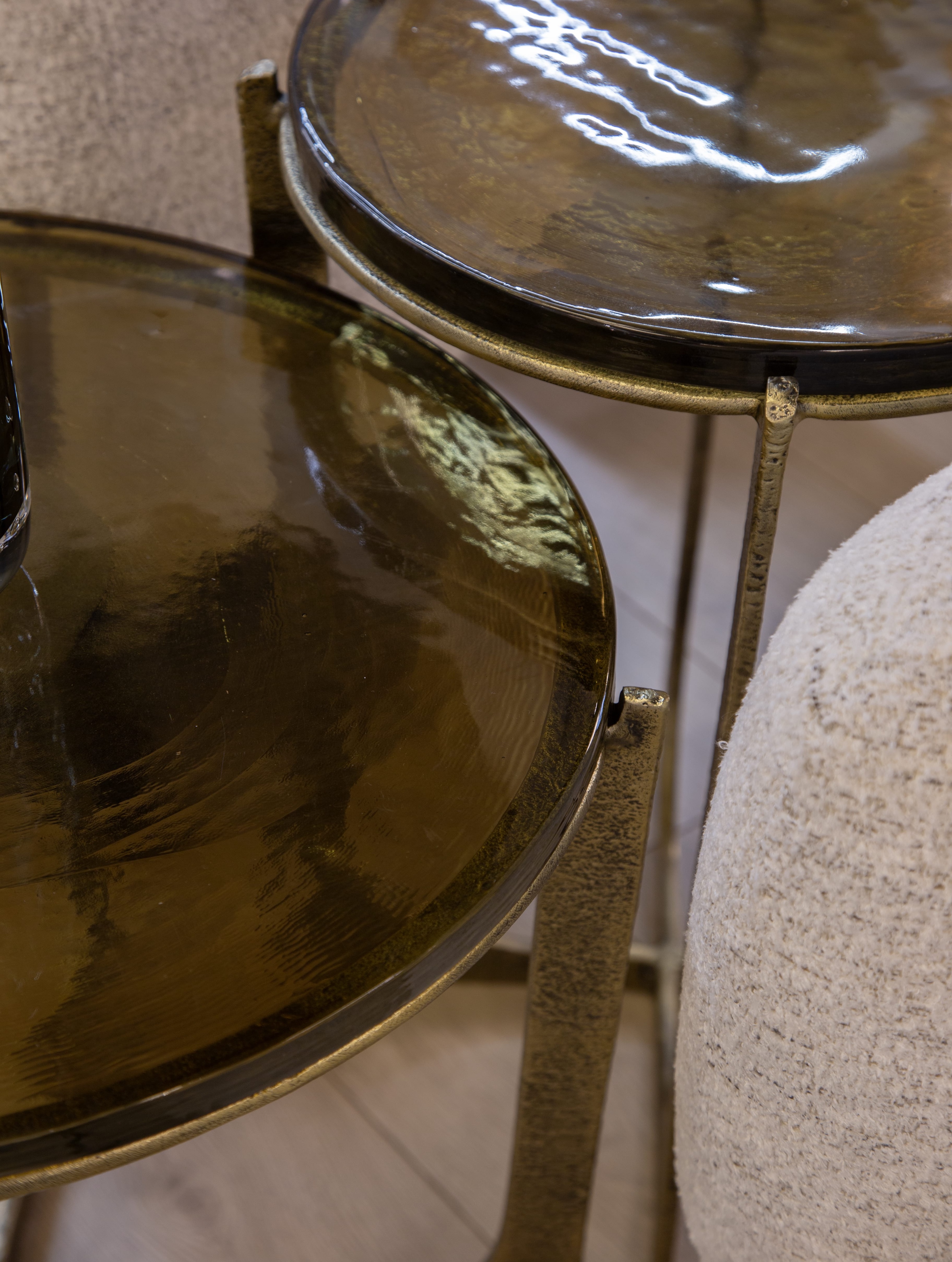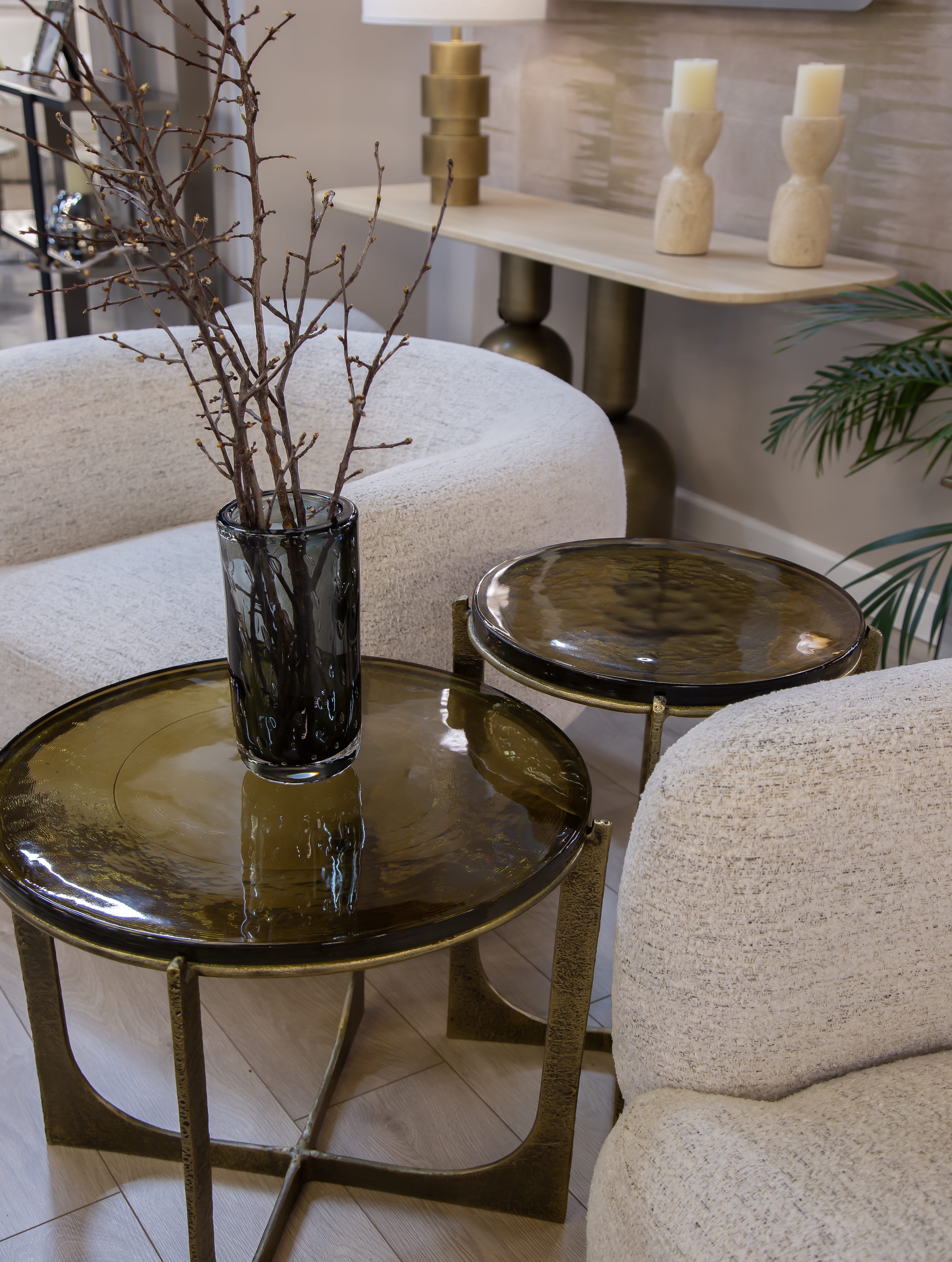 Металлические фигурные ножки в оттенке antique brass изысканно поддерживают столешницу из стекла, создавая оригинальный дизайн приставного стола Liv. Он добавит стильный акцент в характер современного пространства.