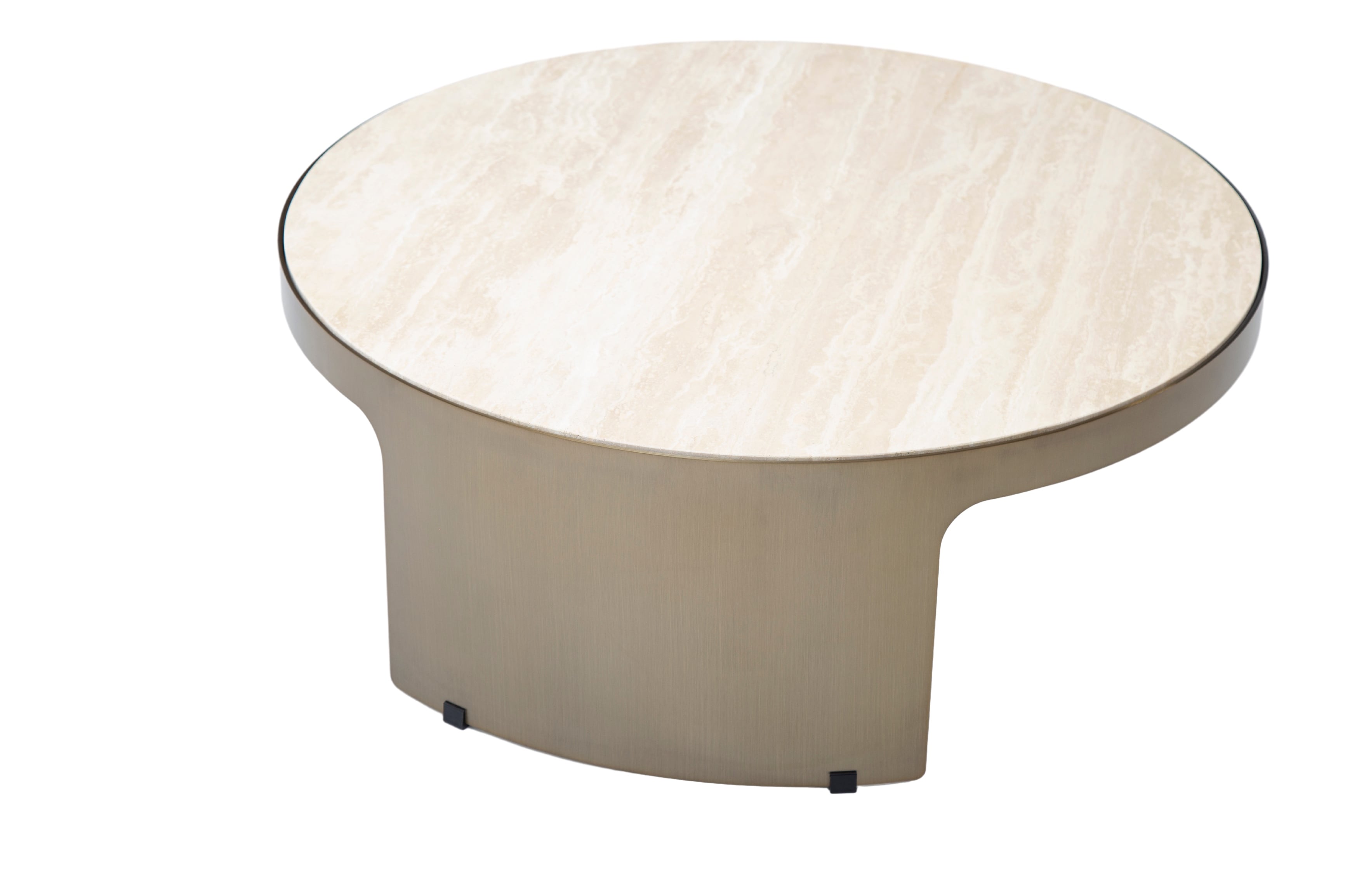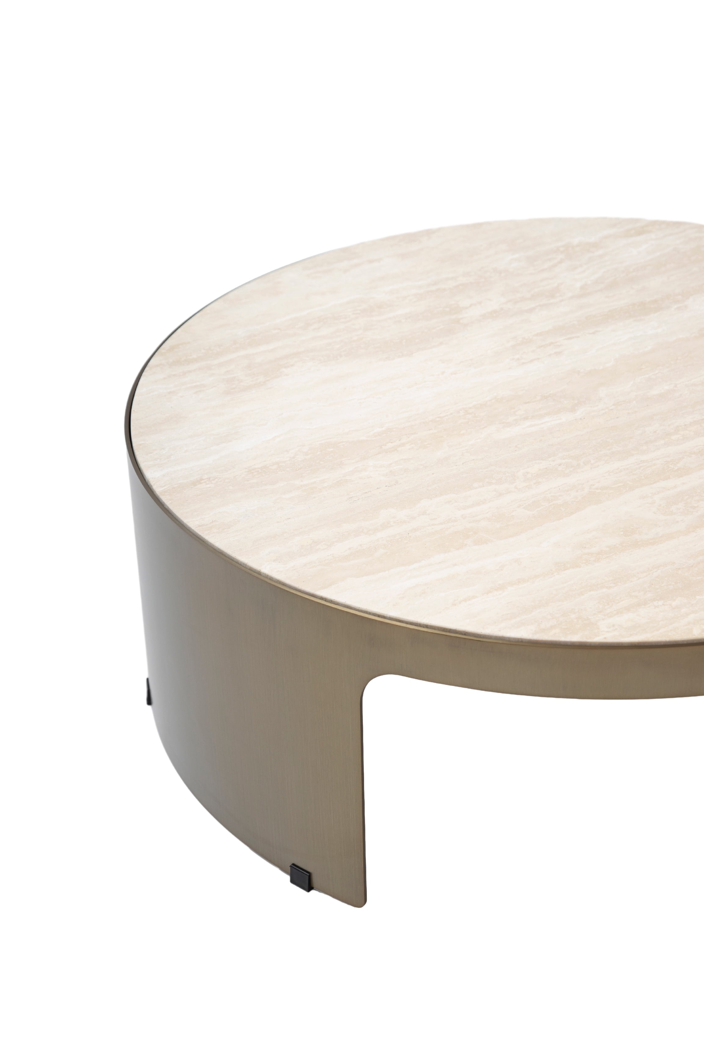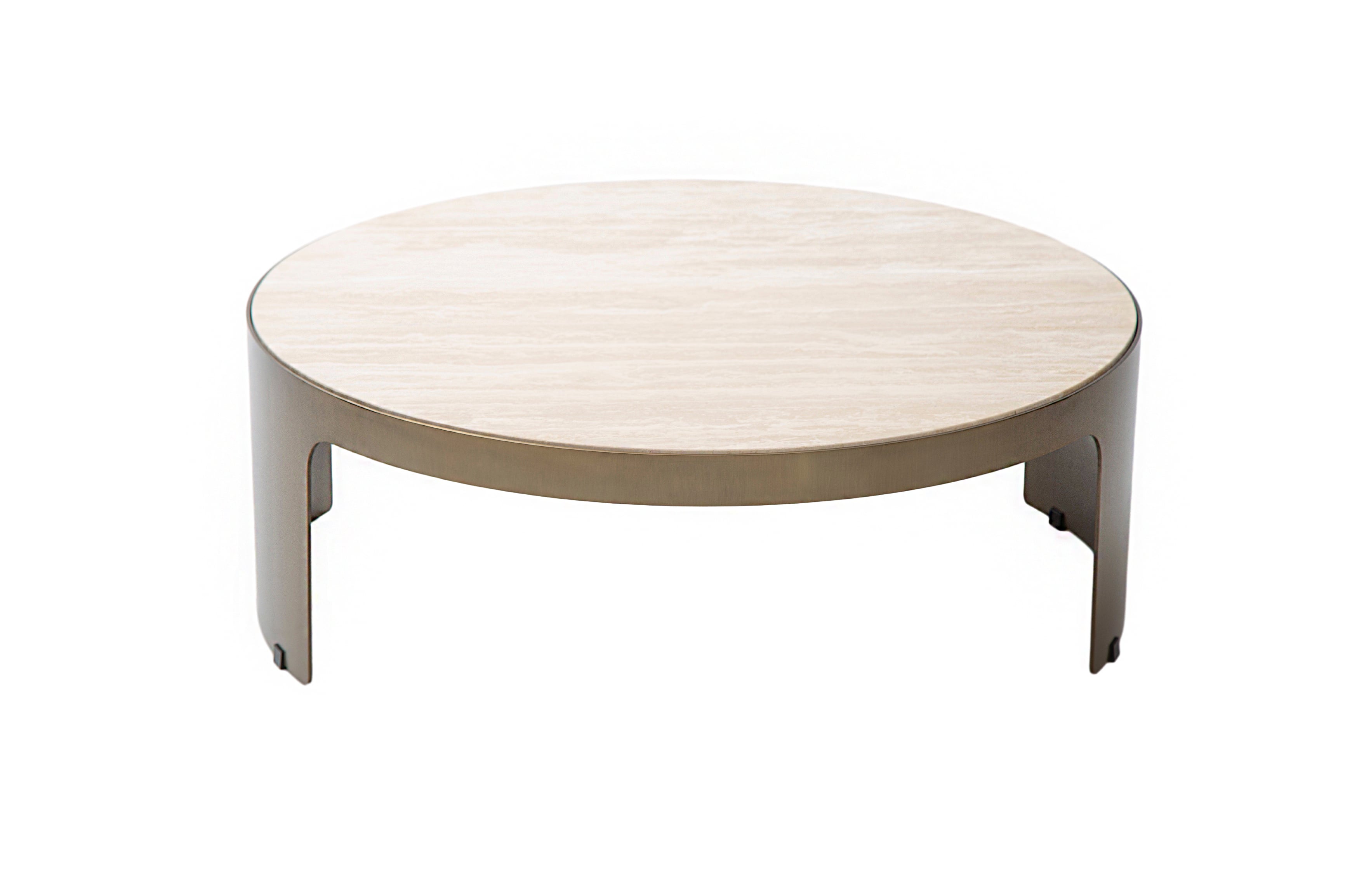 Круглая столешница из травертина на металлическом основании под матовую латунь делают журнальный стол Mathias исключительным украшением интерьера. Плавность линий круглого обрамления, переходящего в симметричные ножки, изящно подчеркнута сочетанием материалов.