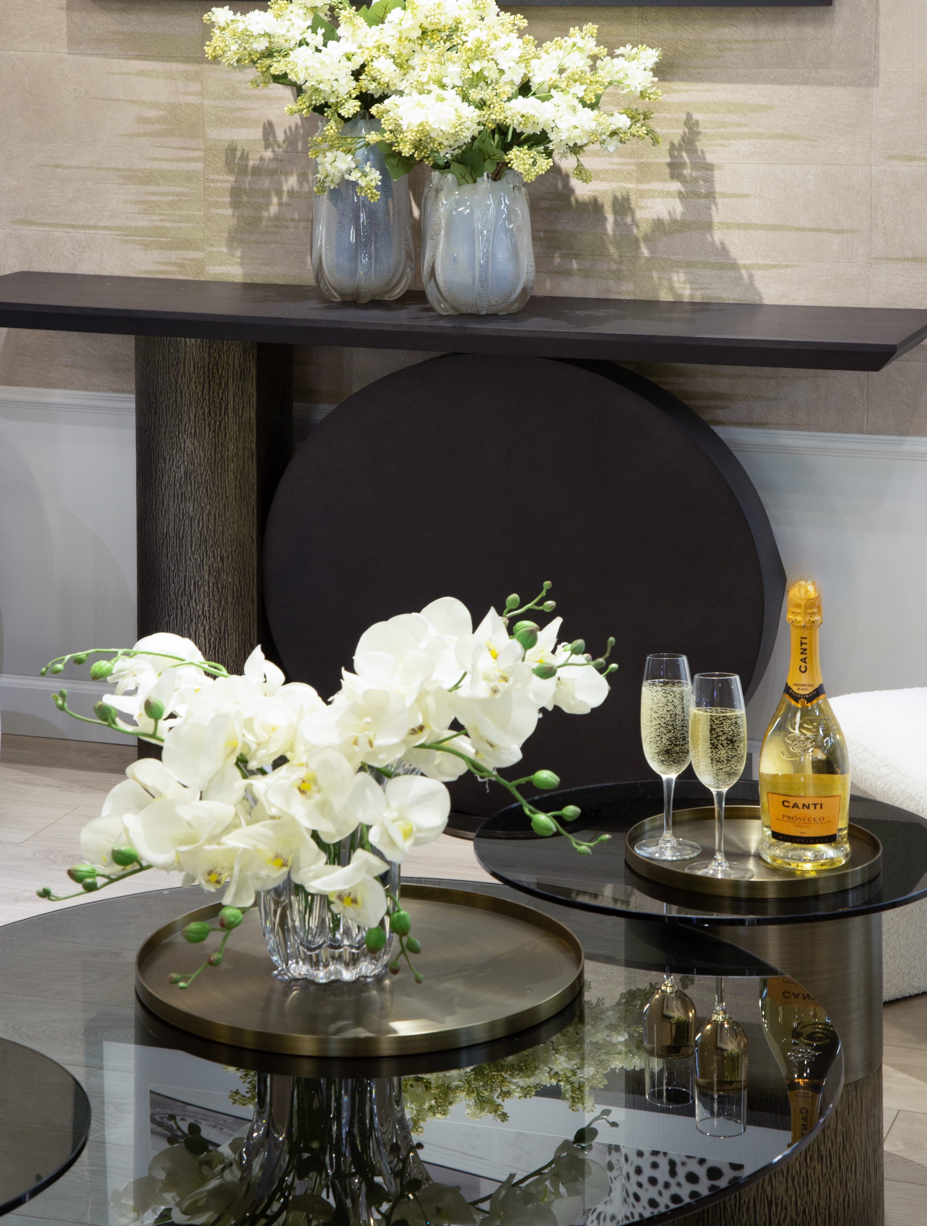 Журнальный стол Adrian — настоящее произведение искусства. Основание из брашированной нержавеющей стали под латунь имеет округлую форму. Столешница, выполненная из стекла и украшенная оригинальной деталью в виде золотого подноса делает стол роскошным и эффектным предметом интерьера.