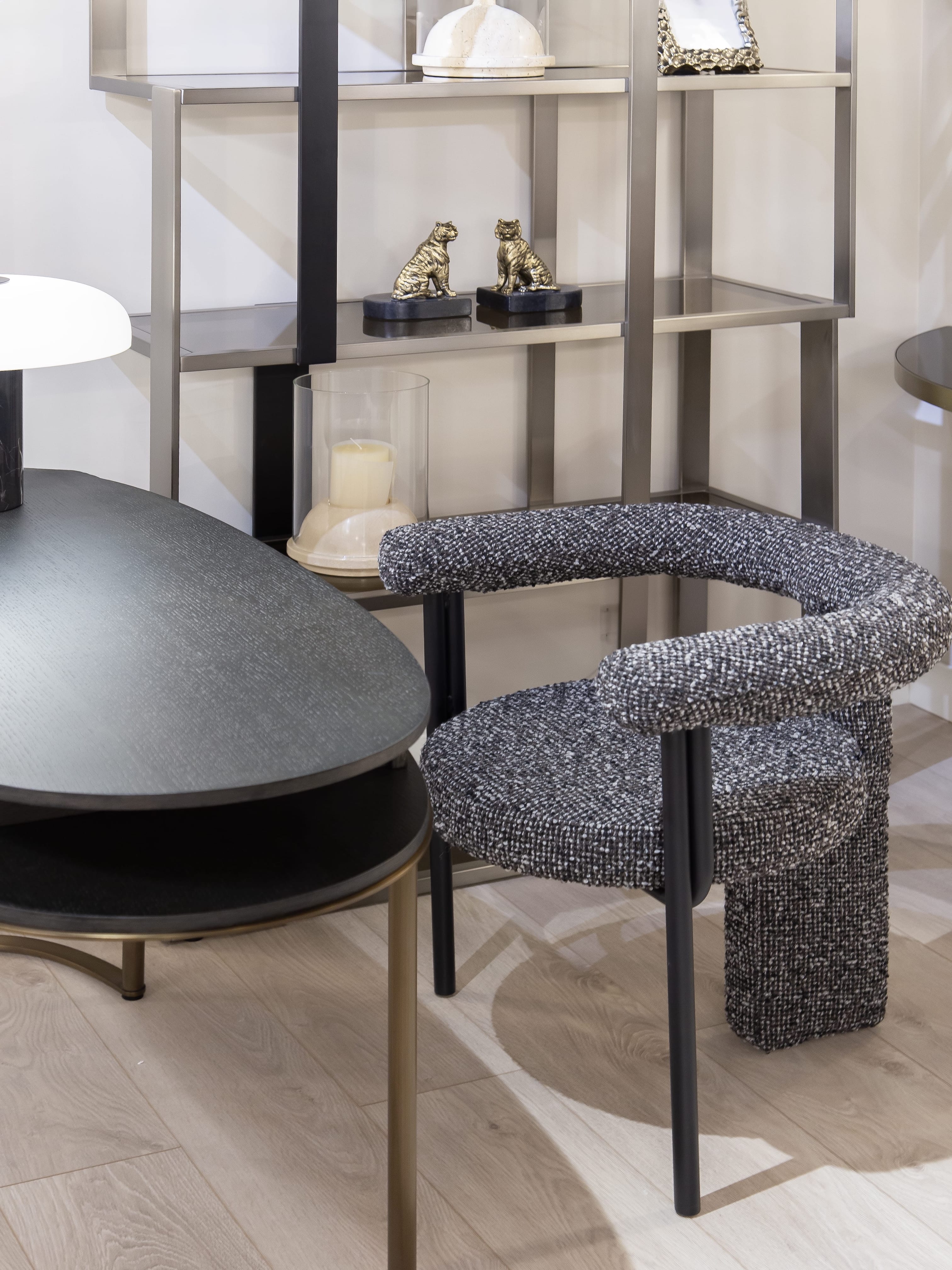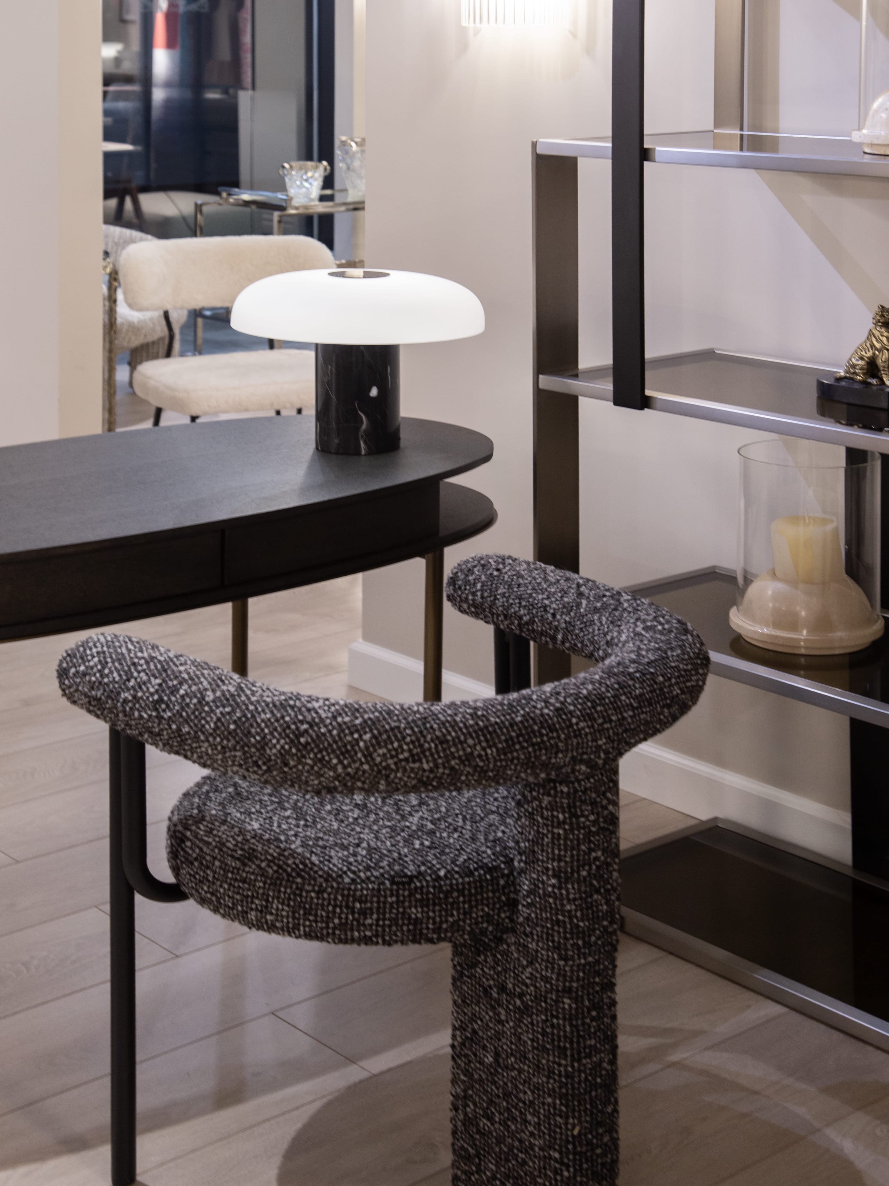 Обеденный стул Ferro отличается особым соединением спинки и подлокотников, что придает ему идеальное сочетание стиля и комфорта. Основание из металла и темно-серая обивка подчеркивают элегантную геометрию форм.