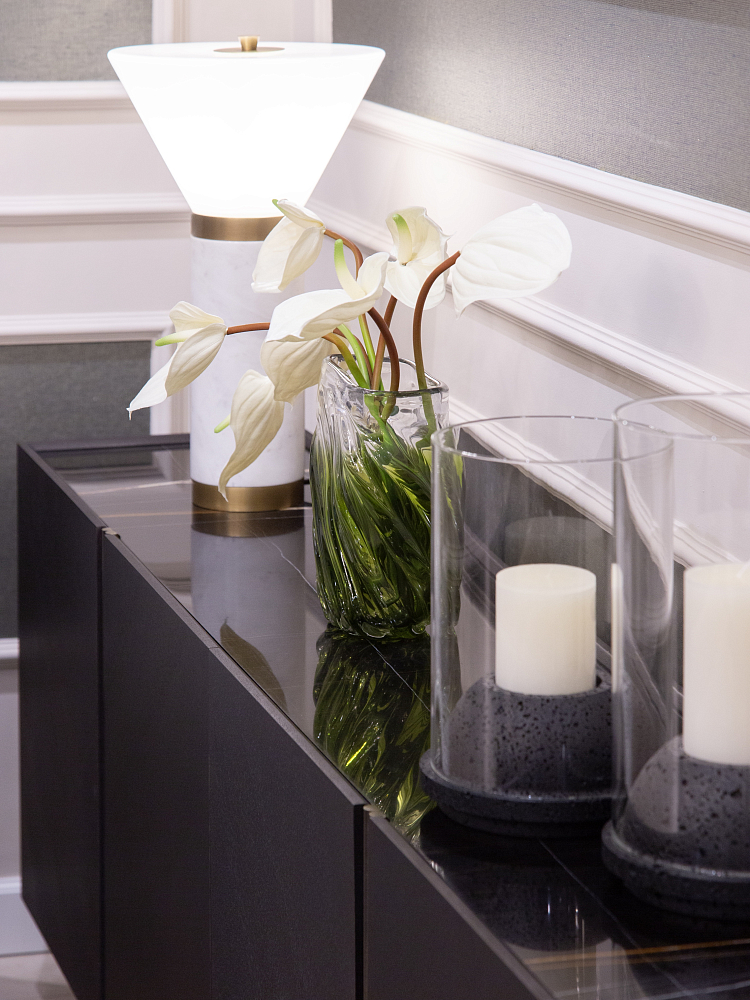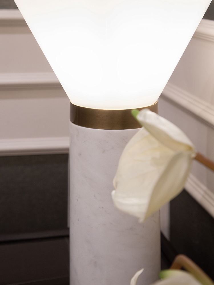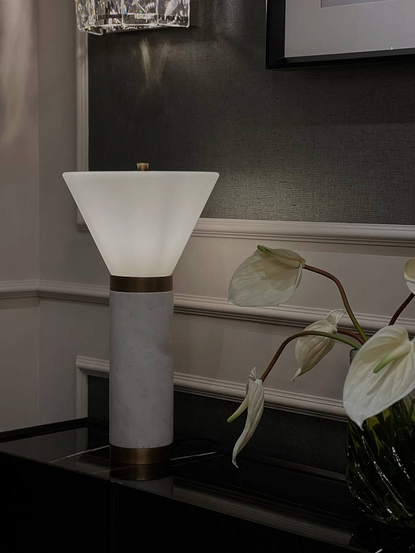 Настольная лампа Lumiere украсит интерьер вашей спальни своим оригинальным силуэтом, напоминающим фонарь. Изысканное сочетание мрамора, латуни и матового стекла дополнит современный интерьер.