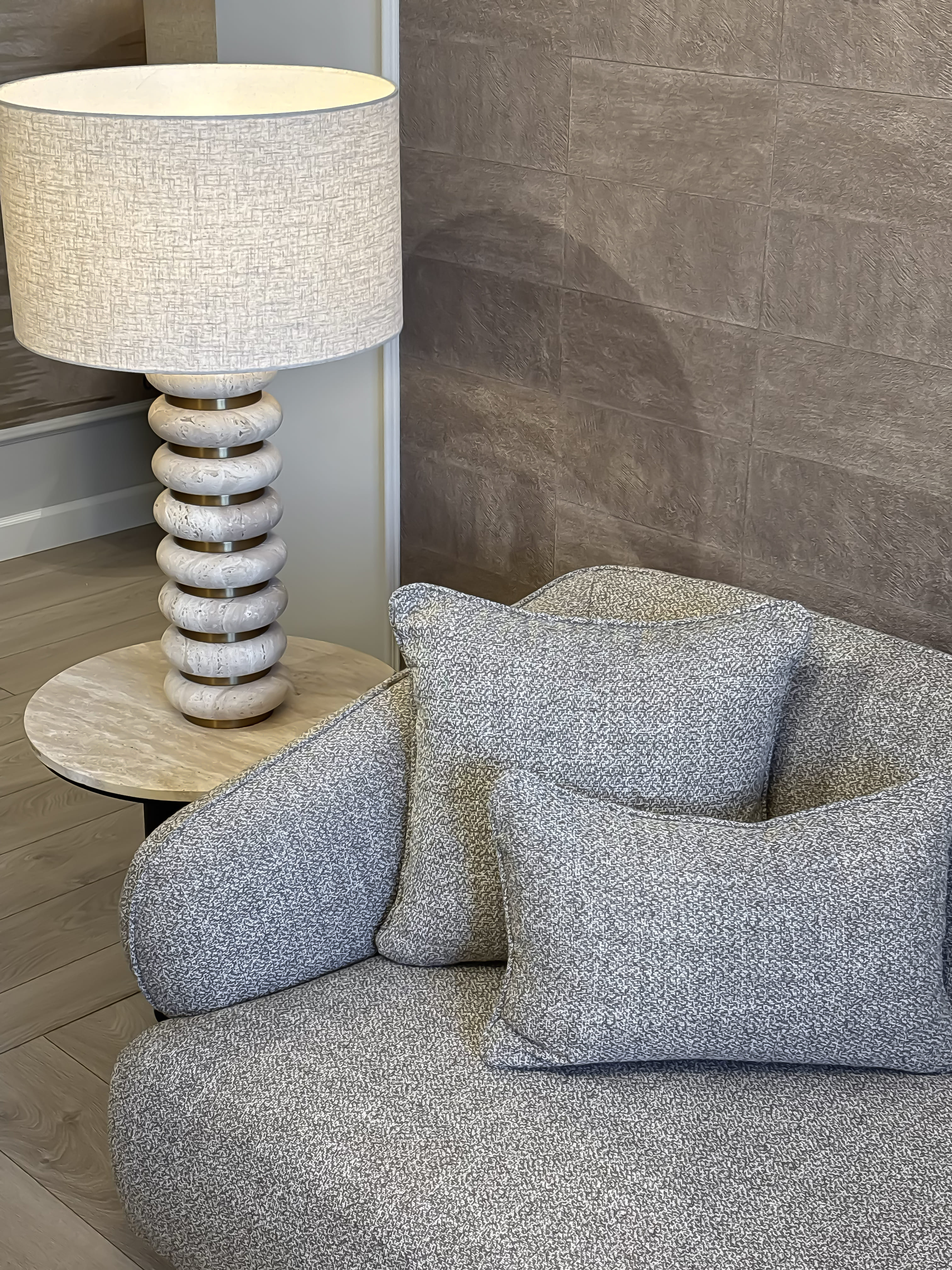 В дизайне настольной лампы Nuvo фигурное основание из травертина подчеркивает особую красоту натурального камня. Теплый свет осветит пространство гостиной или спальни сквозь абажур из светлого текстиля.