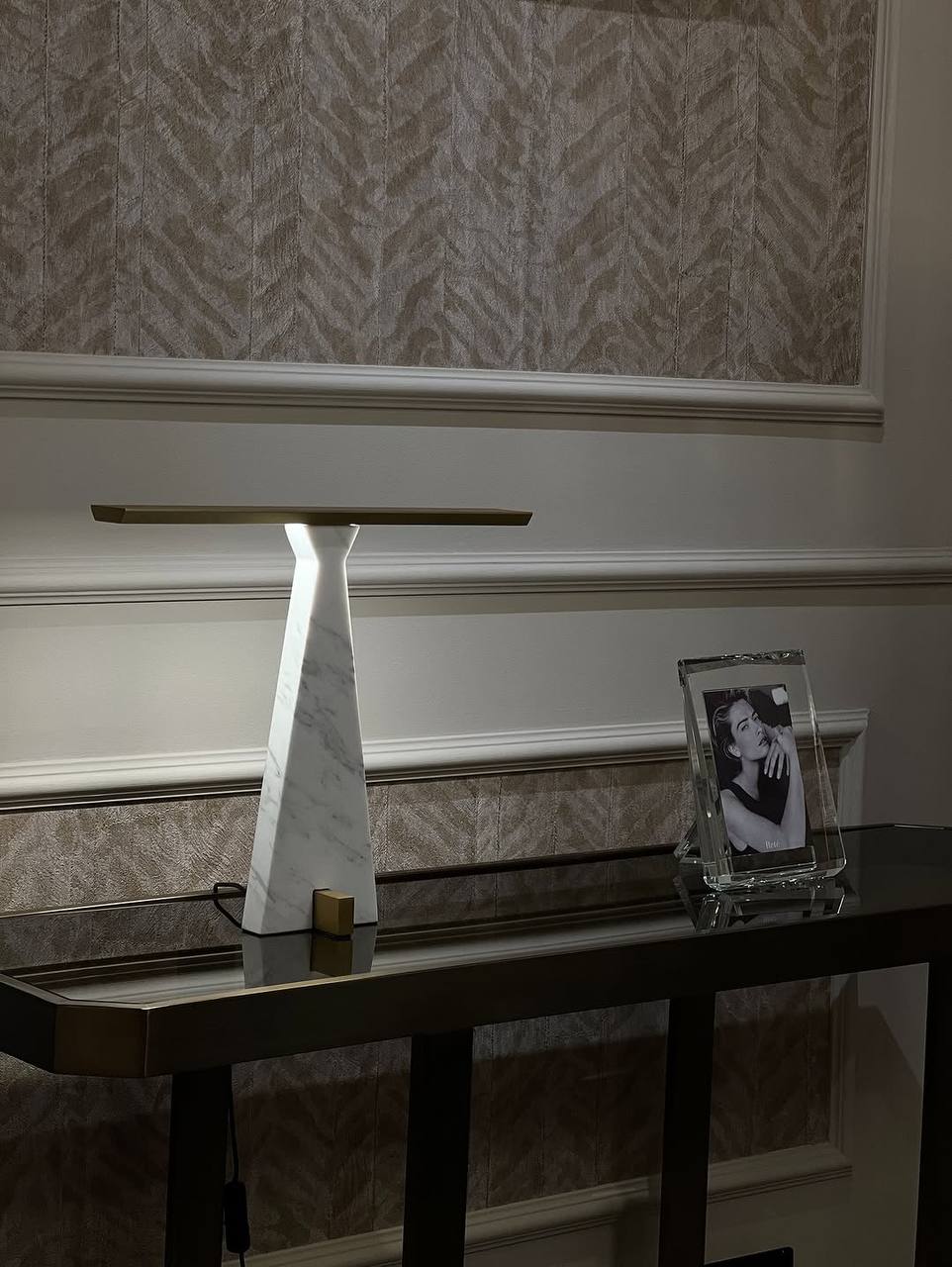 Древний иероглиф в современной интерпретации соответствует изначальному замыслу минималистского дизайна настольной лампы Pilati. Мраморное многогранное основание и металлическая деталь в финише латунь станут исключительным украшением современного интерьера.