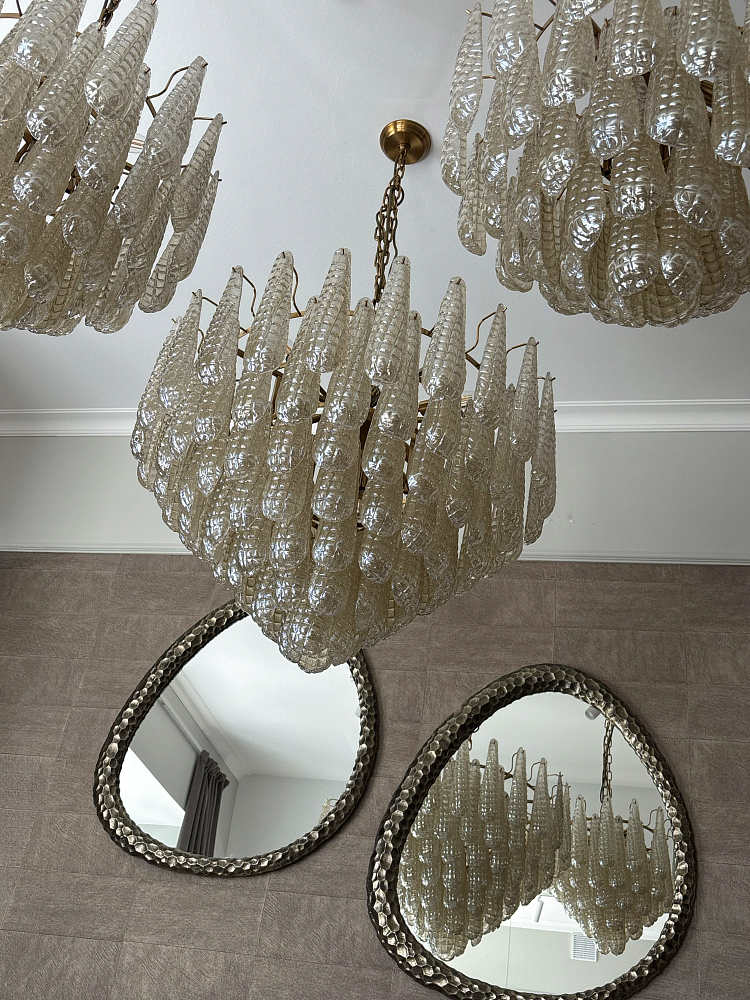 Потолочная люстра Morissette создана из стеклянных фактурных элементов в форме капель — воплощение изысканной роскоши и утончённой эстетики. Её многослойный силуэт создает впечатляющий каскад, где каждая стеклянная капля отражает теплый свет и превращает его в мерцающее сияни