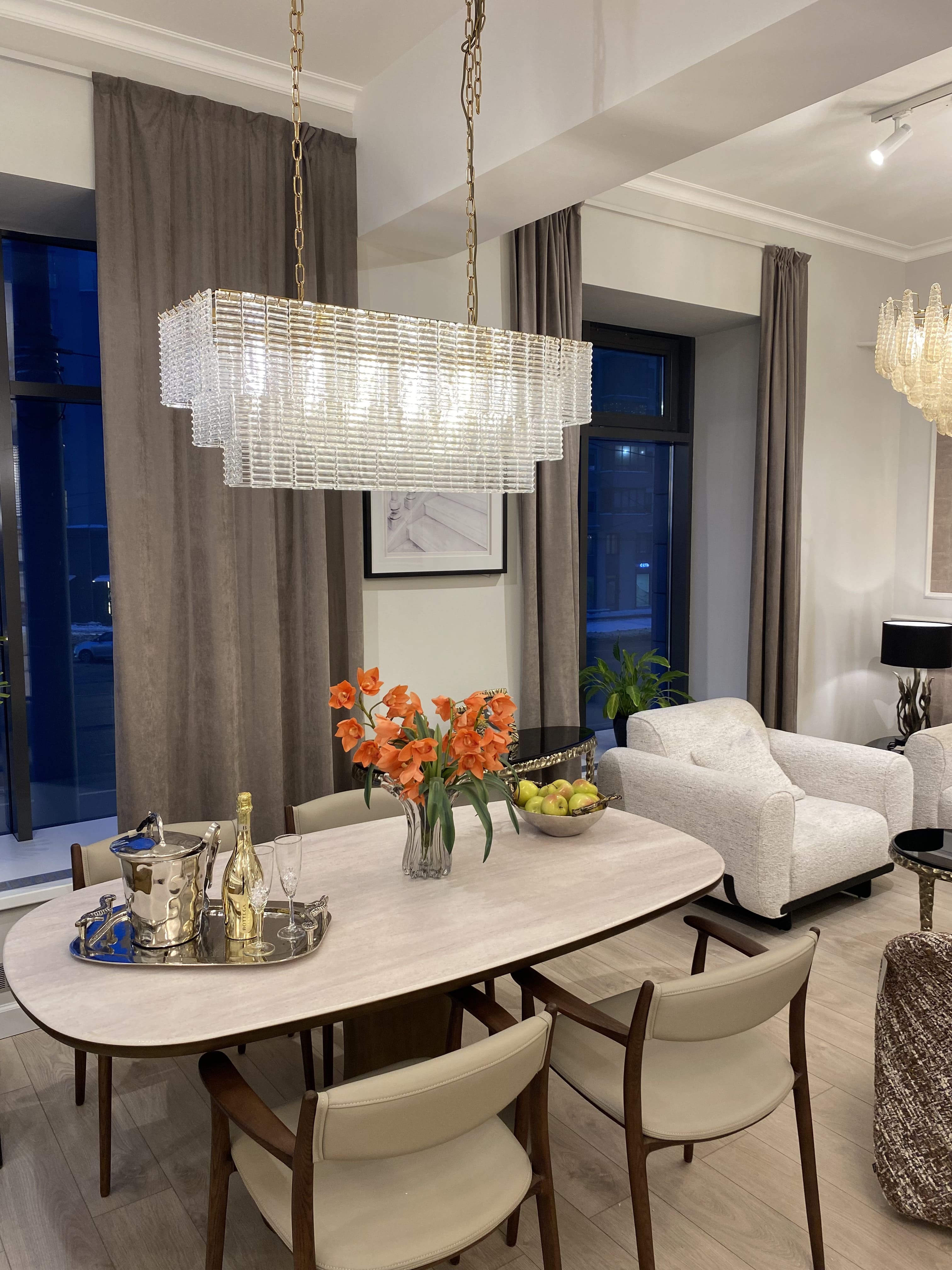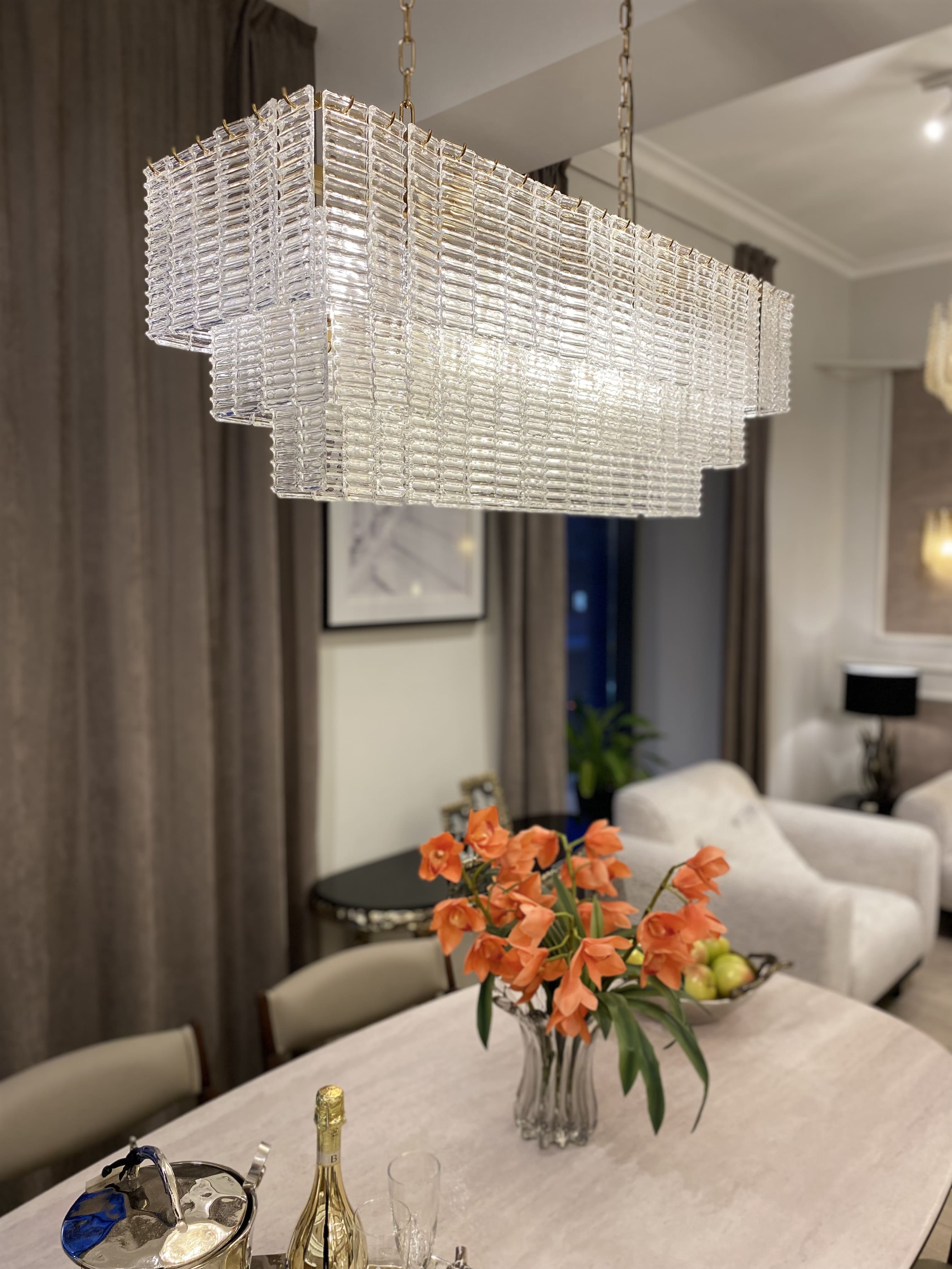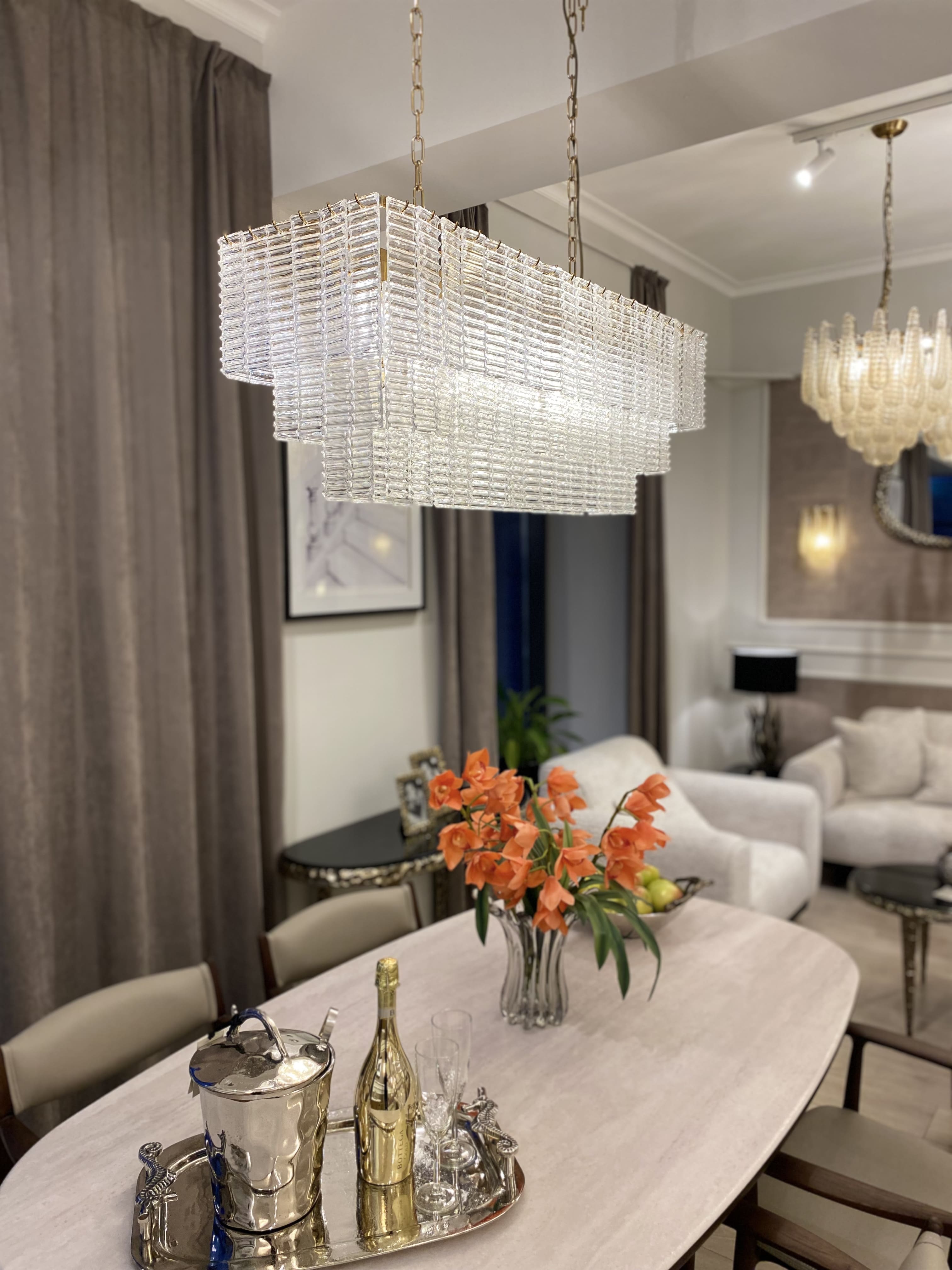 Изысканный дизайн люстры Gatsby будто переносит во времена Великого Гэтсби, излучая блеск, роскошь и создавая атмосферу абсолютного праздника жизни. Подобно гламурному ювелирному изделию, она осветит пространство гостиной стилем эпохи ар-деко и мягким рассеянным светом.