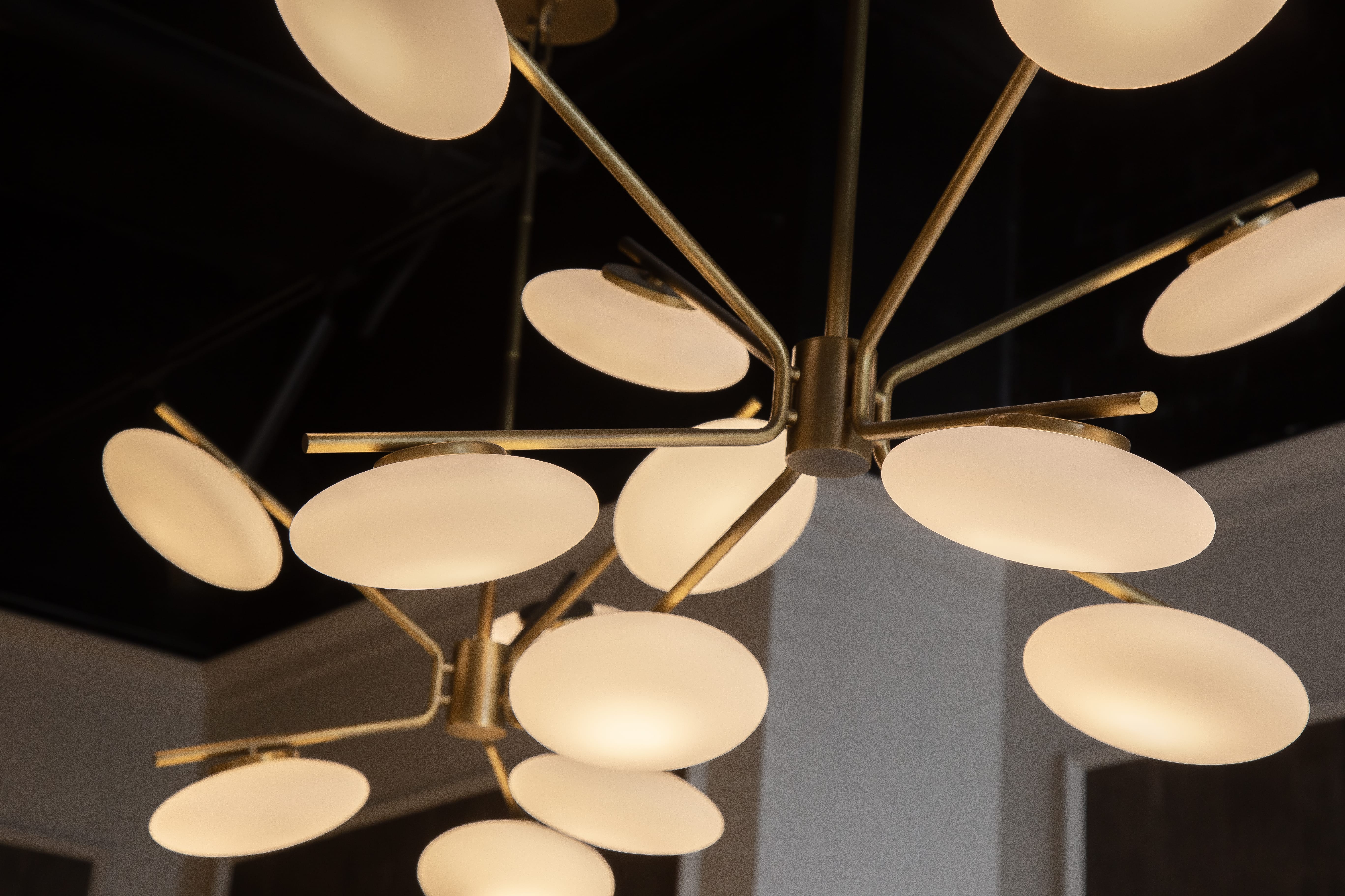Латунные лучи люстры Luant завершают изысканные плафоны из матового стекла, создавая в интерьере атмосферу уюта.